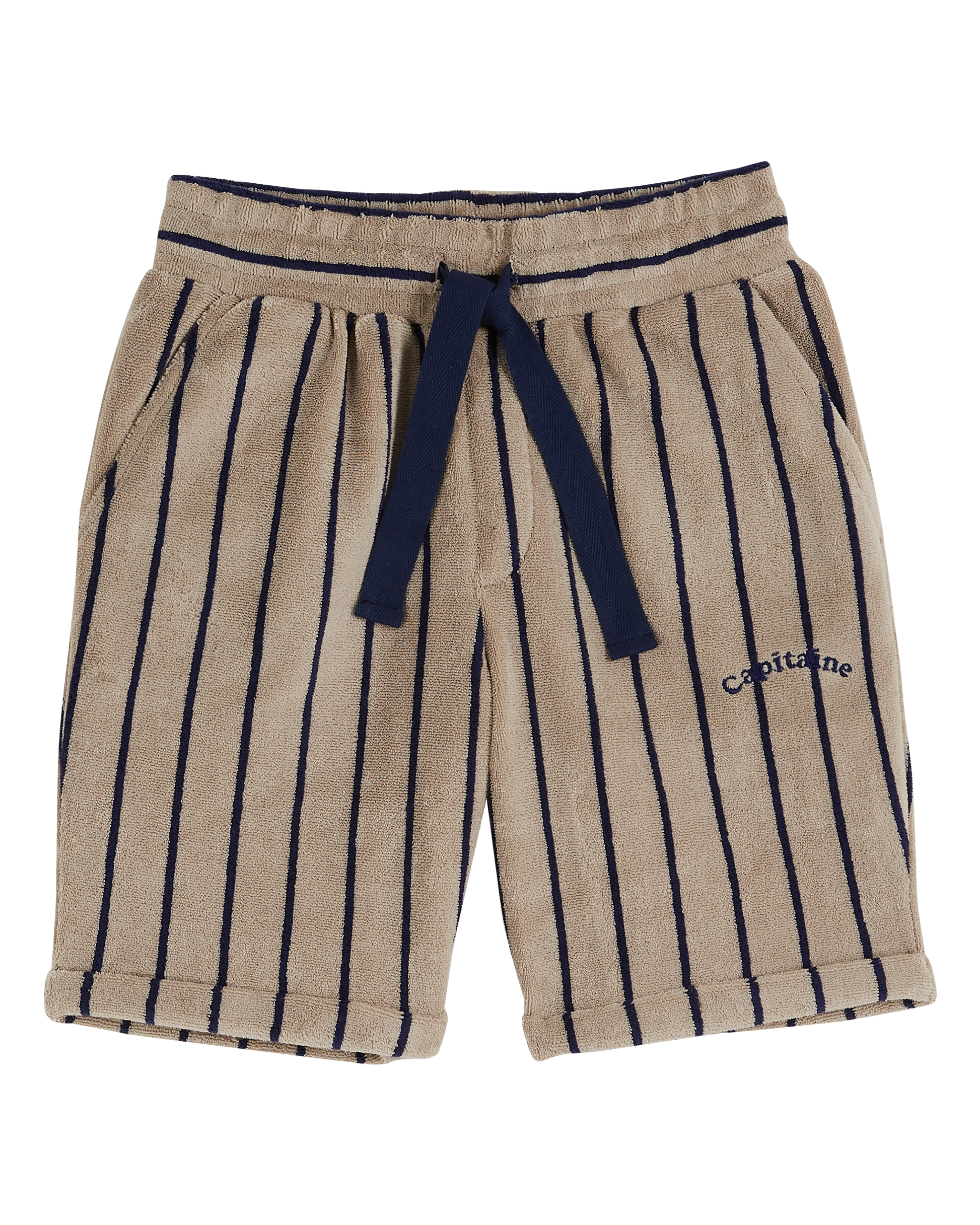 Bermuda en jersey de coton éponge beige à rayures verticales bleu marine. Pour confectionner ce bermuda nous avons sélectionné une matière, mélange de coton et de polyester tout doux, moelleux, extensible et confortable, comme nous le disent les bébés et les enfants qui l'on essayé.