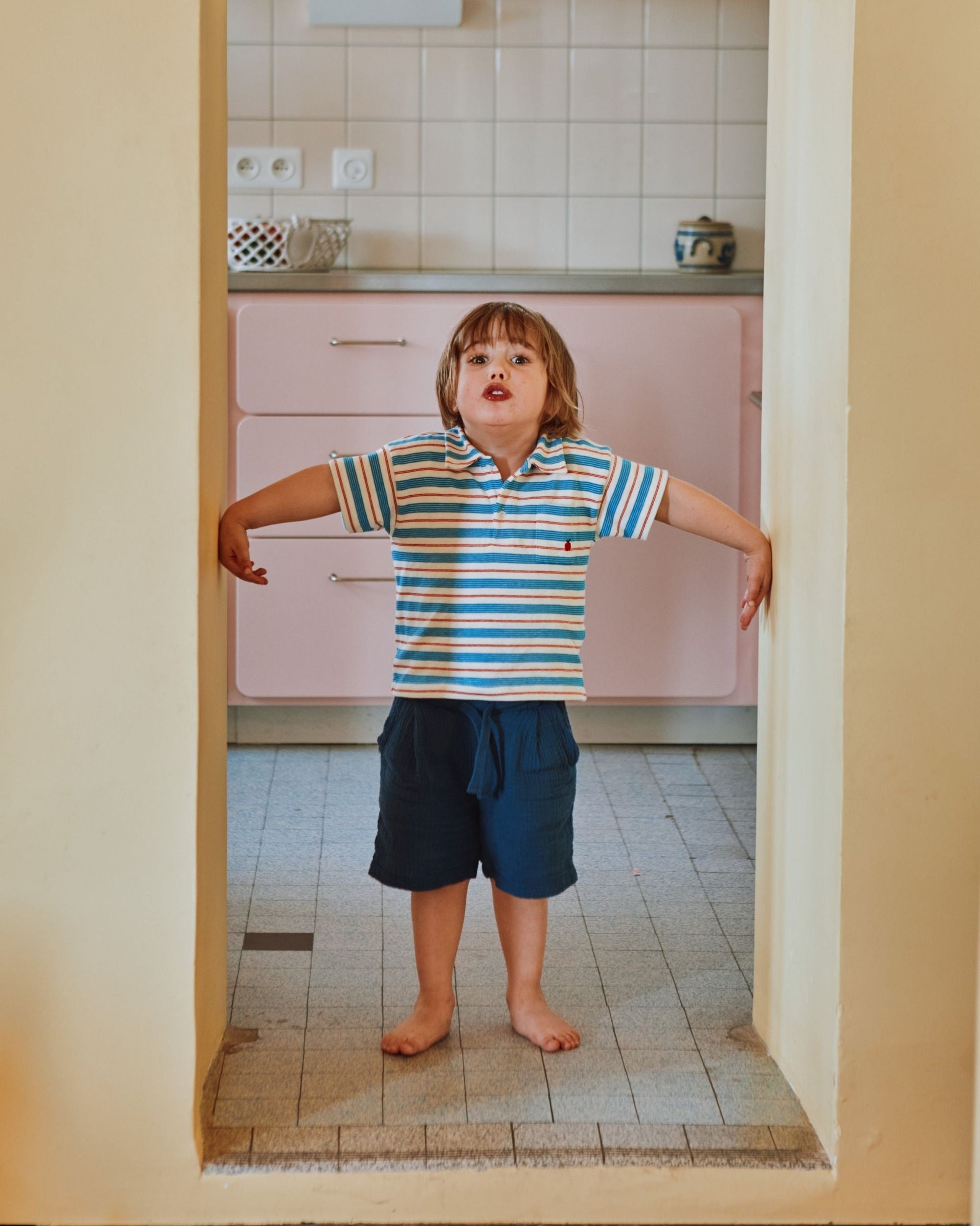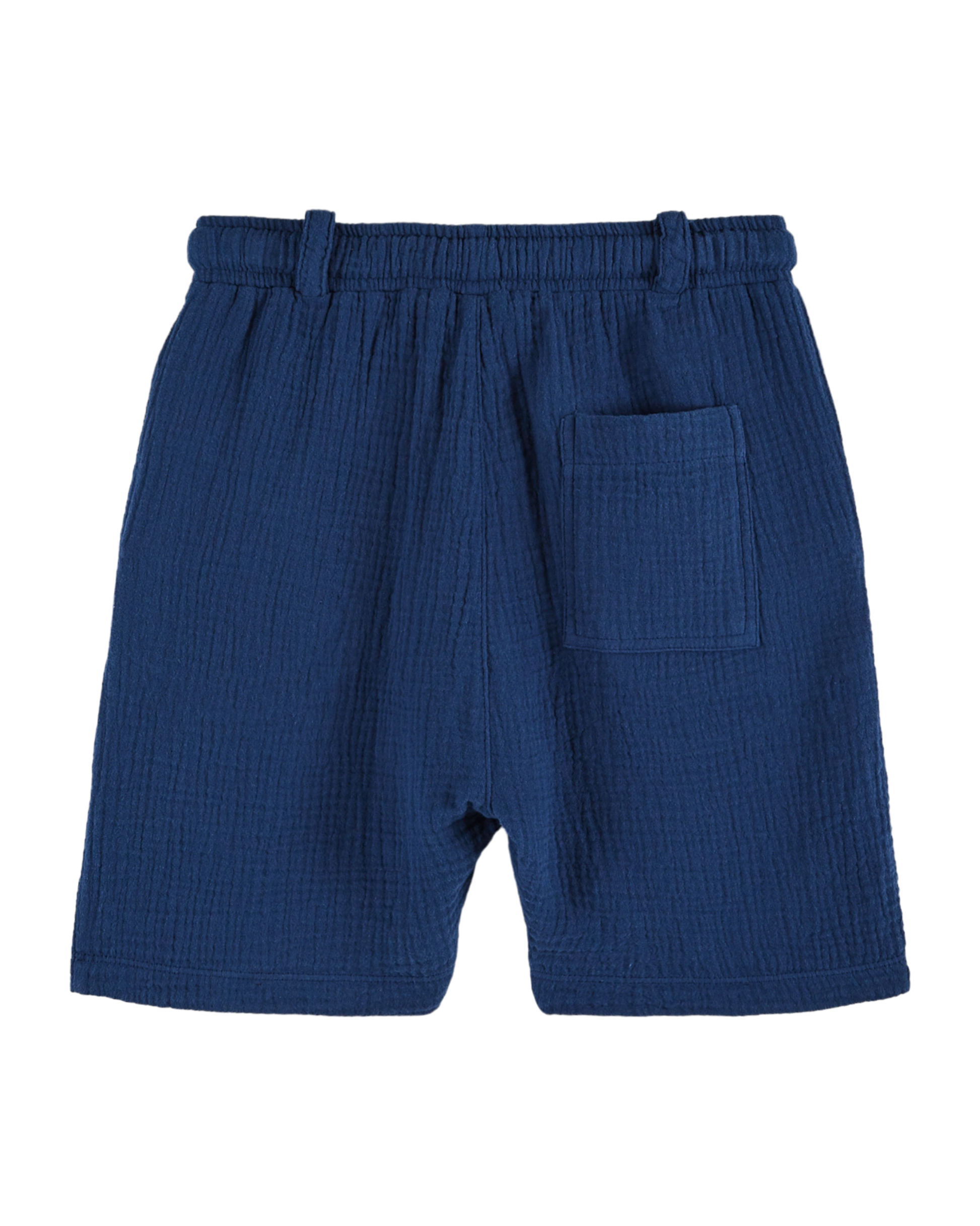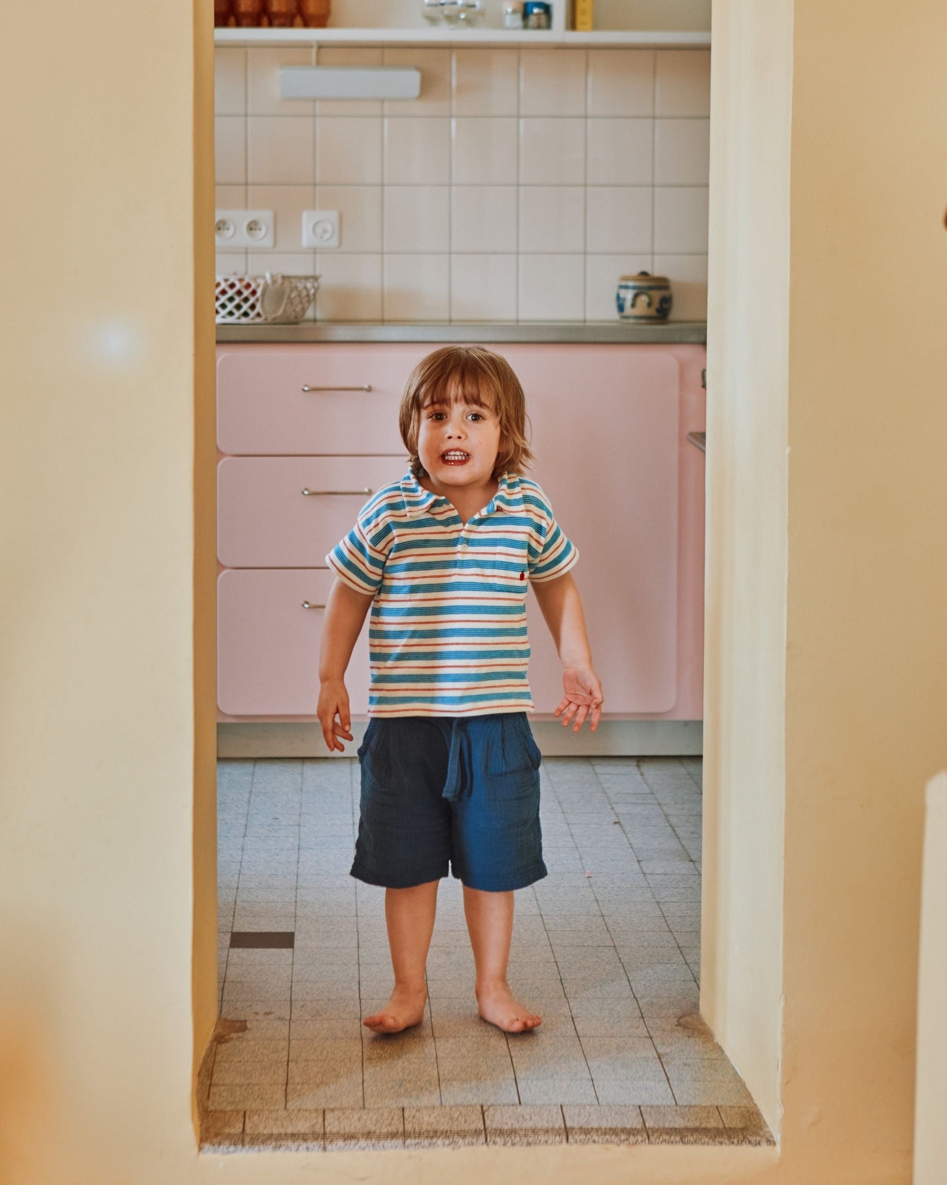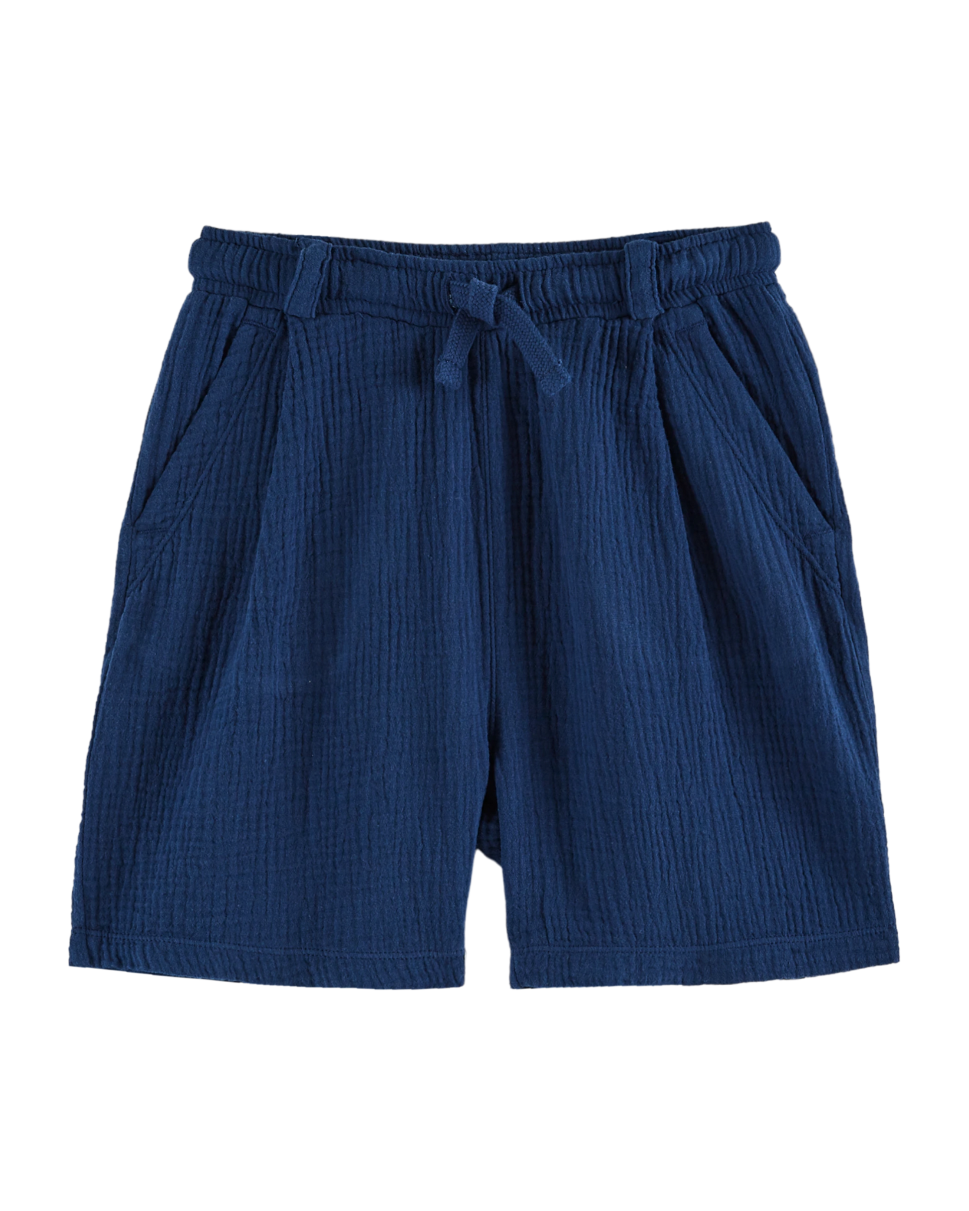 Le short, avec un empiècement dans le dos, deux poches italiennes et une poche plaquée sur une fesse pour garder ses trésors à portée de main, est monté sur une ceinture élastiquée ajustable avec un lien en sergé de coton ton sur ton pour s'adapter à toutes les tailles. Il est tellement facile à retirer et à enfiler que même les plus jeunes pourront jouer les grands et s'habiller tout seul.