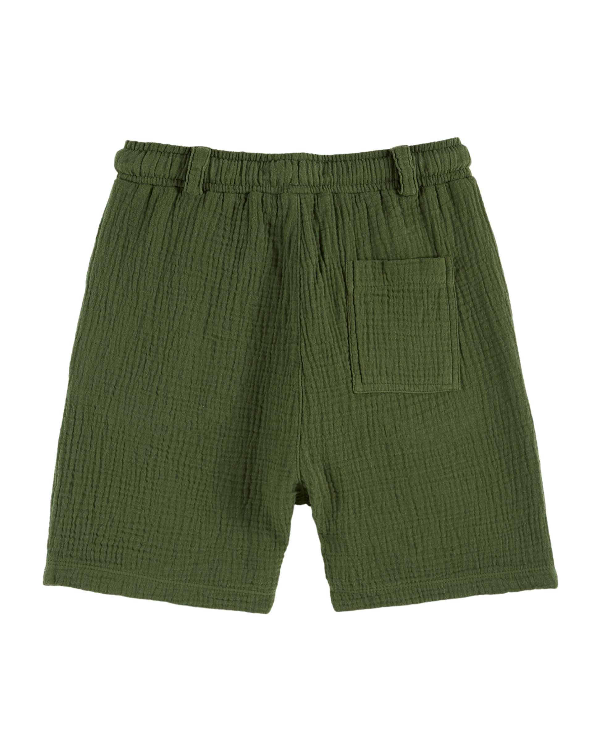 Le short, avec un empiècement dans le dos, deux poches italiennes et une poche plaquée sur une fesse, pour garder ses trésors à portée de main, est monté sur une ceinture élastiquée ajustable avec un lien en sergé de coton ton sur ton, s'adaptant ainsi à toutes les tailles. Il est tellement facile à retirer et à enfiler que même les plus jeunes pourront jouer les grands et s'habiller tout seul.