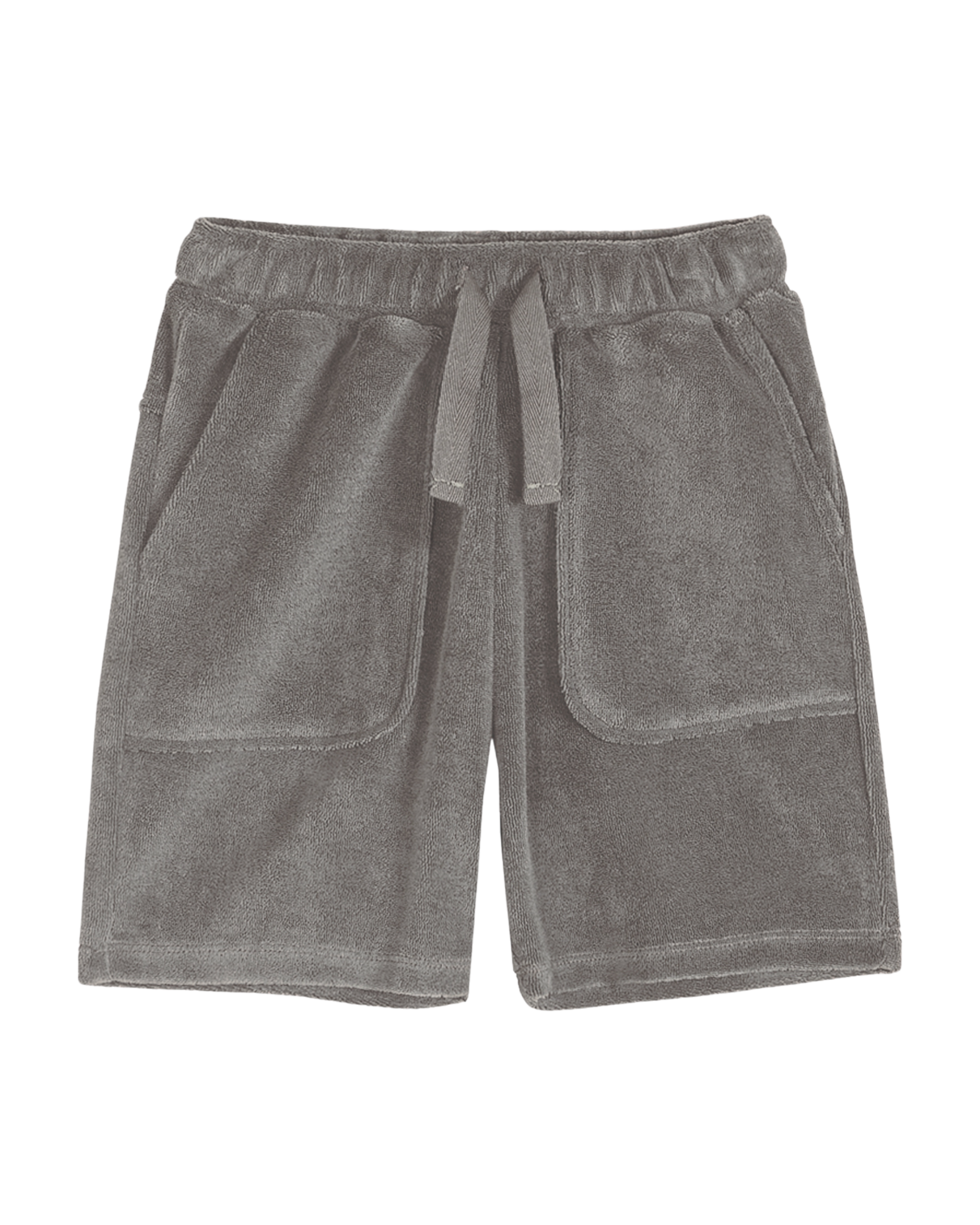 Bermuda en tissu éponge gris. On aime le mélange de coton et de polyester tout doux, fluide et extensible, la ceinture élastiquée ajustable avec un lien en coton sergé ton sur ton et les 2 grandes poches plaquées.