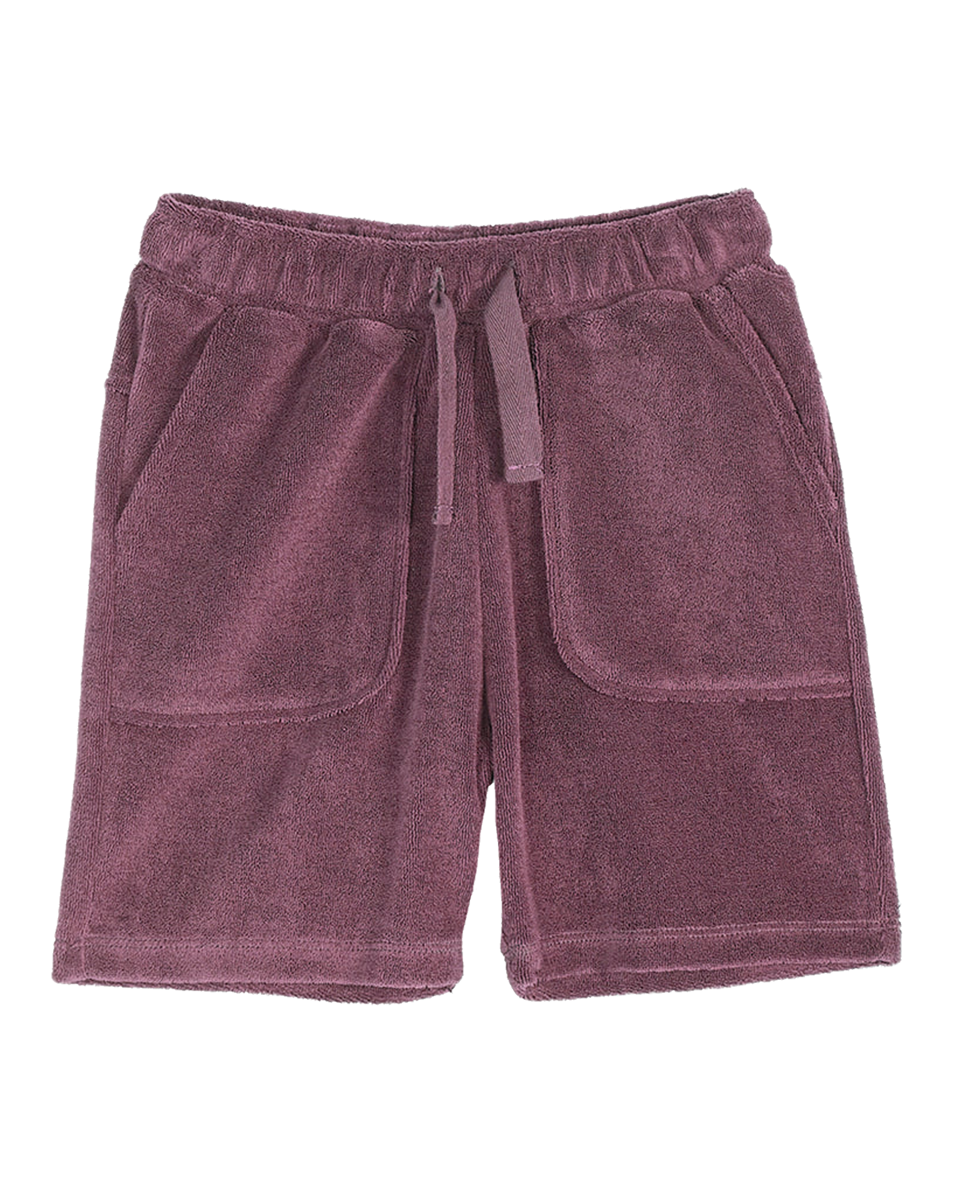 Bermuda en tissu éponge violet. On aime le mélange de coton et de polyester tout doux, fluide et extensible, la ceinture élastiquée ajustable avec un lien en coton sergé ton sur ton et les 2 grandes poches plaquées.