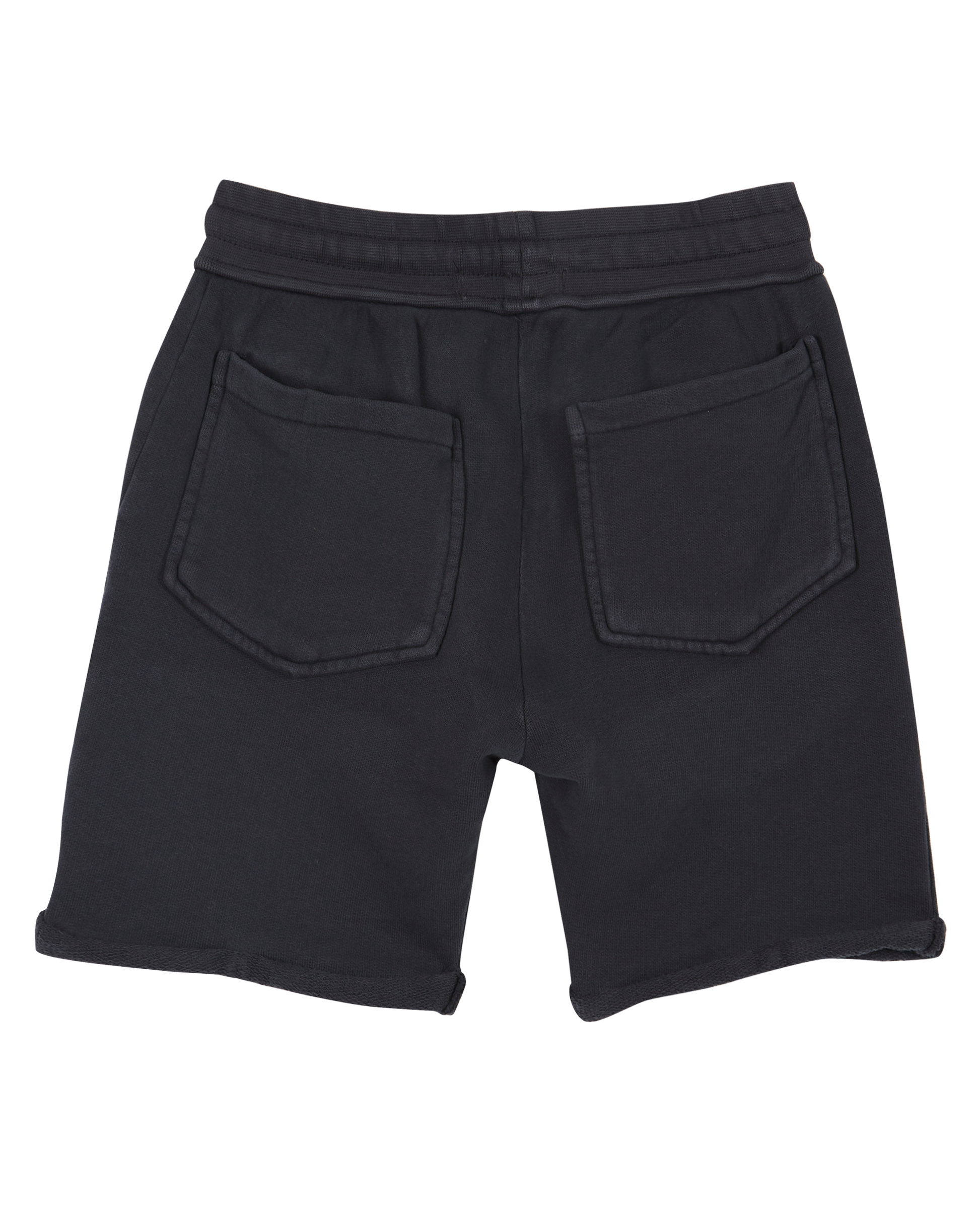 Bermuda en coton biologique molletonné bitume. Le bermuda est monté sur une ceinture en bord-côte extensible qu'il est possible d'ajuster avec le cordon en coton sergé ton sur ton. On aime les deux poches italiennes et les deux poches plaquées sur les fesses, le revers en bas des cuisses et les surpiqûres autour des poches et celles qui marquent la braguette factice.