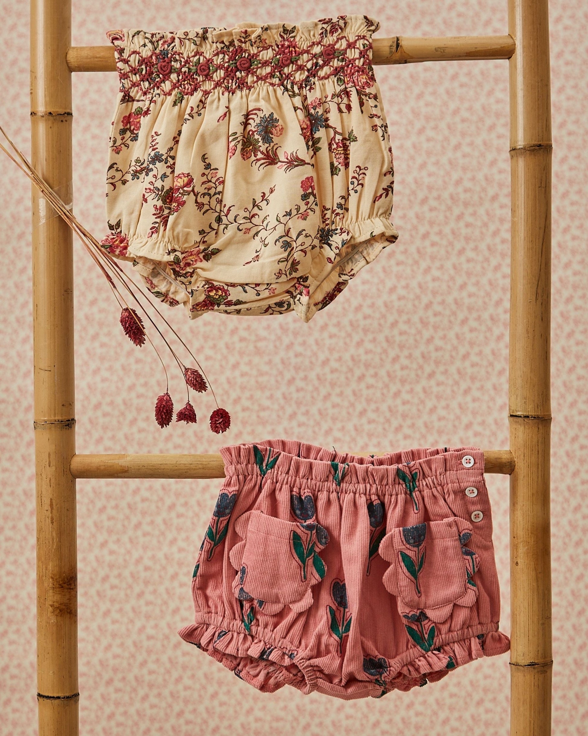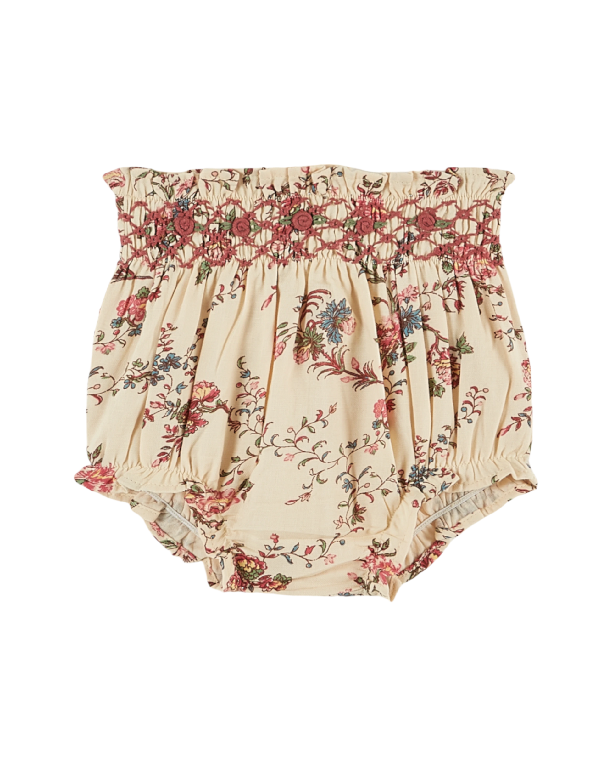 Bloomer en voile de coton écru à motif fleuri. Un joli bloomer élastiqué à la taille et aux cuisses, avec un effet volanté. On aime la matière toute douce, toute souple et doublée pour en contrer la finesse.
