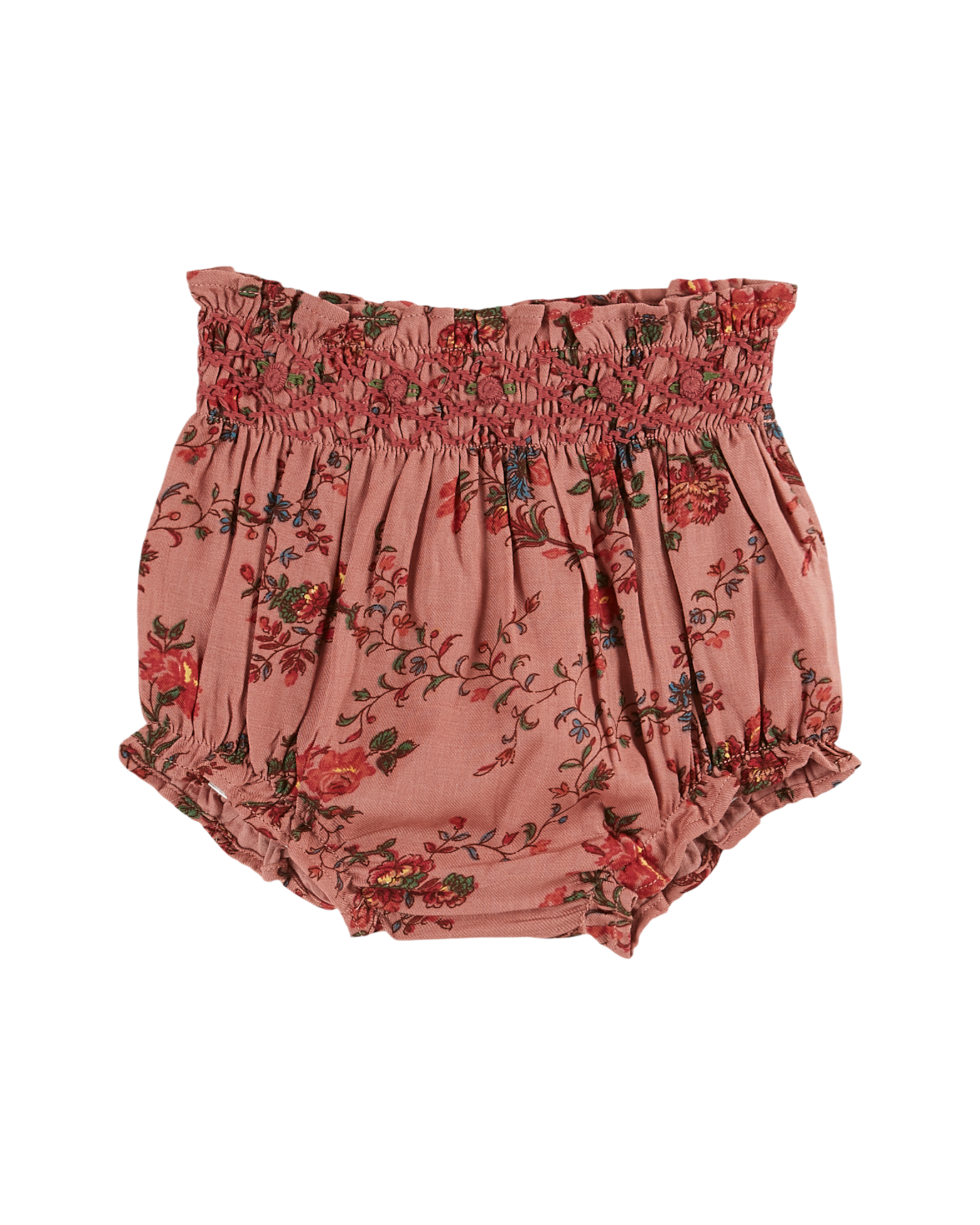 Bloomer en voile de coton rose à motif fleuri. Un joli bloomer élastiqué à la taille et aux cuisses, avec un effet volanté. On aime la matière toute douce, toute souple et doublée pour en contrer la finesse.