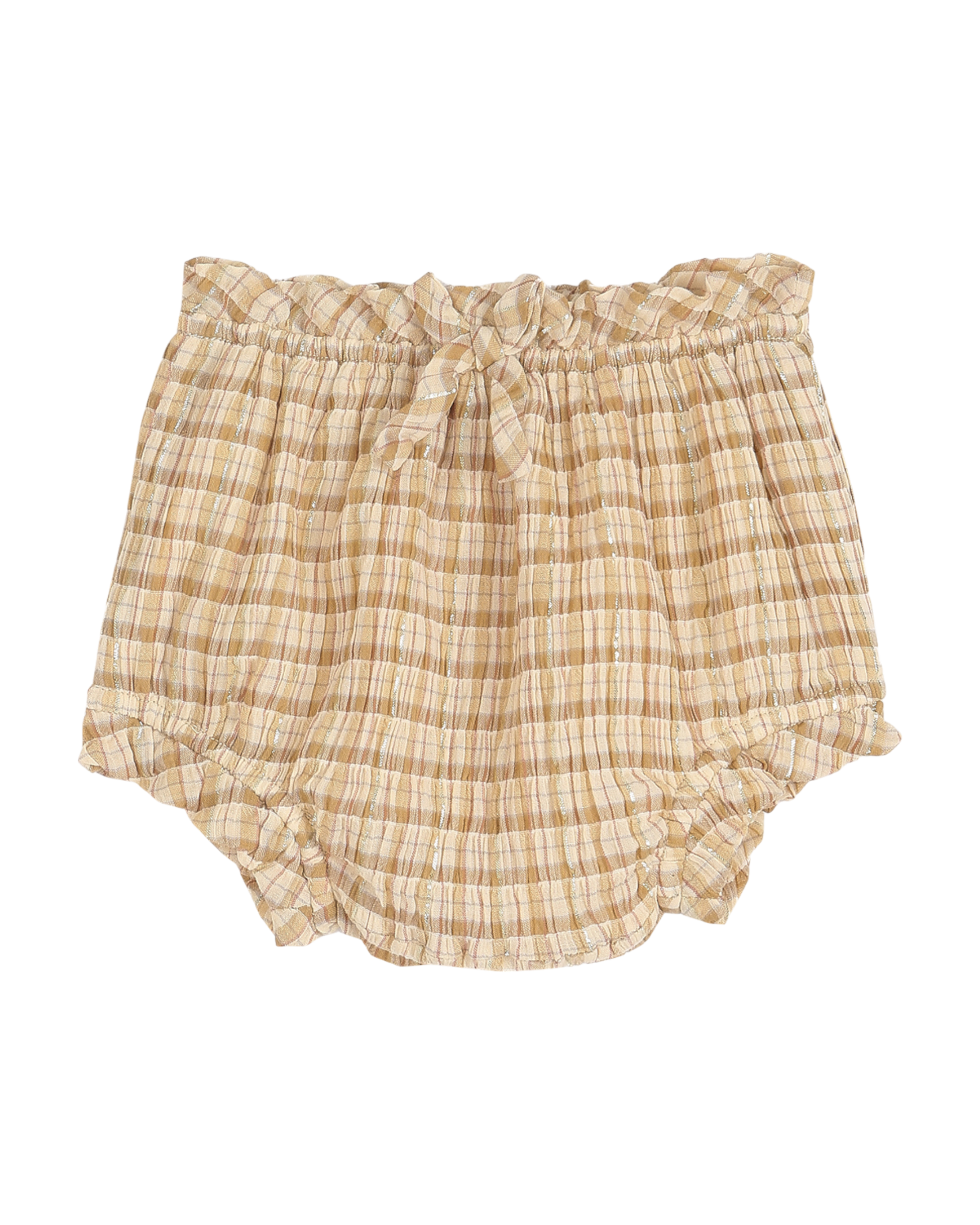 Bloomer en voile de coton créponné à carreaux beige. La matière douce, la ceinture et les cuisses élastiquées font de cette culotte bouffante un classique du vestiaire Emile et Ida. On aime particulièrement le petit volant en biais autour de la taille et des cuisses, le noeud décoratif et les fines lignes de lurex doré. Un bloomer, entièrement doublé, confortable pour des bébés bien culottés.
