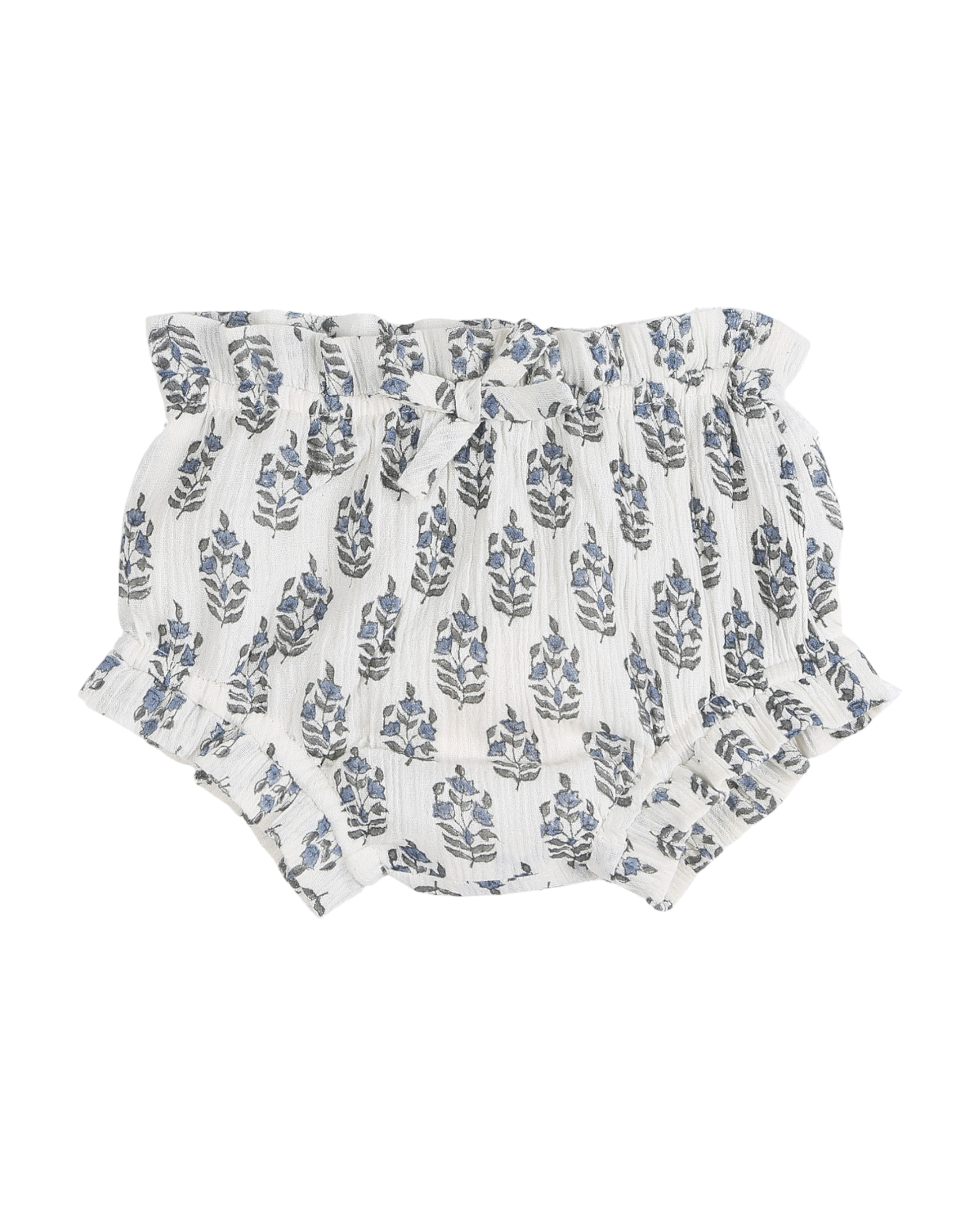 Bloomer en voile de coton créponné écru imprimé au block print de jacinthes bleues en all-over. La matière douce, la ceinture et les cuisses élastiquées font de cette culotte bouffante un classique du vestiaire Emile et Ida. On aime particulièrement le petit volant rapporté autour de la taille et des cuisses, le noeud décoratif et les fines lignes de lurex doré. Un bloomer entièrement doublé, confortable pour des bébés bien culottés.