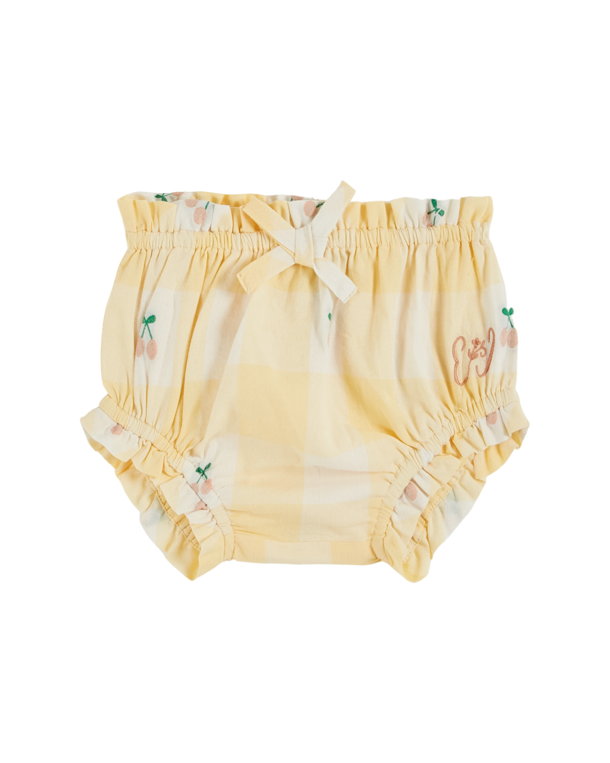 Bloomer en coton vichy jaune et écru à gros carreaux, dans lesquels des cerises roses sont tissées. Bouffant, simple et léger, entièrement doublé, il est idéal pour les chaudes journées d'été ou les premiers beaux jours de printemps avec un collant.