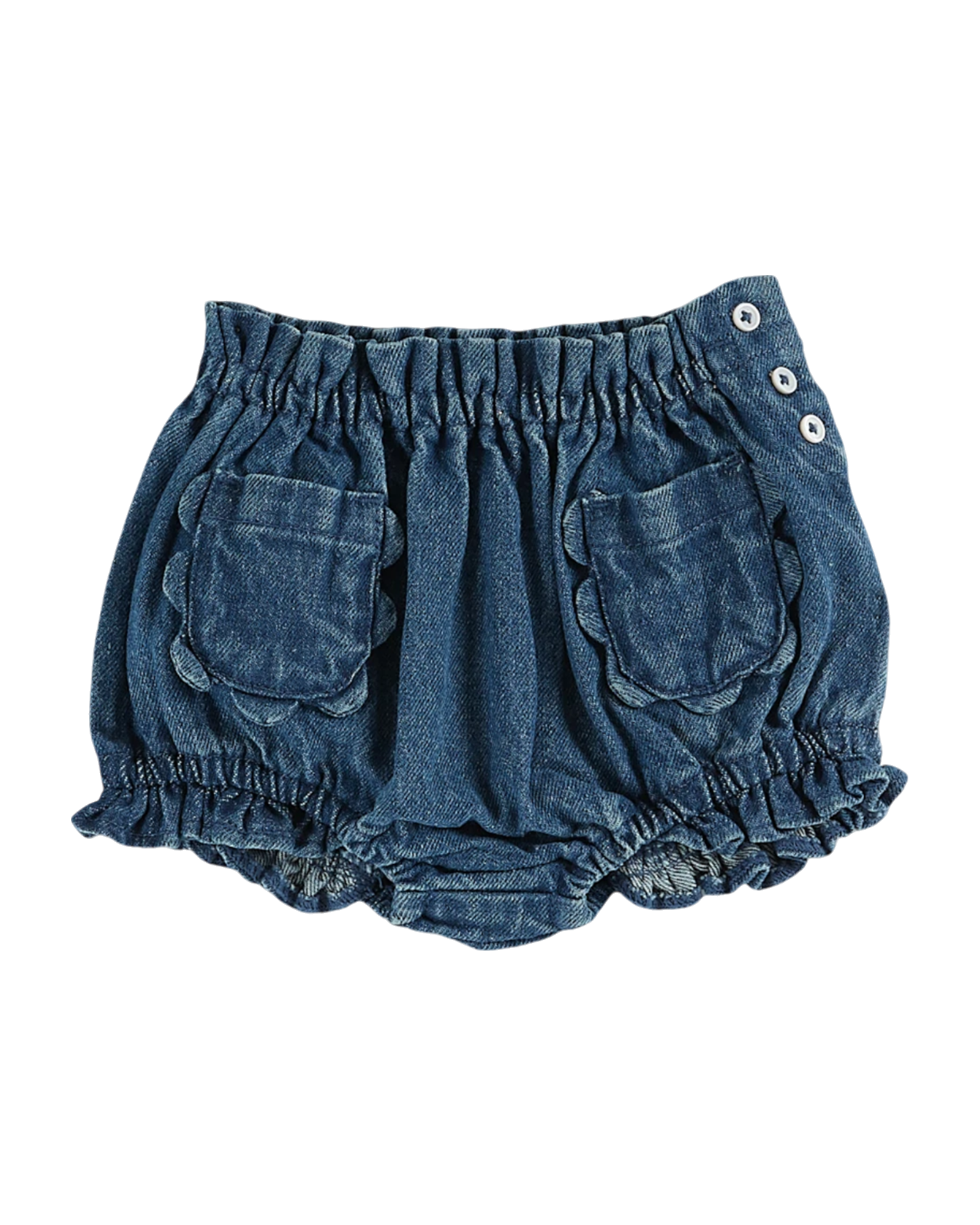 Bloomer en toile de coton denim bleu. Un joli bloomer élastiqué à la taille et aux cuisses volantées. On aime les poches fleurs, les grosses côtes du velours tout doux, tout souple et surtout bien chaud pour prémunir les bébés du froid de l'hiver. Sur le côté, une patte de boutonnage et 3 boutons en nacre naturelle ferment cette culotte.