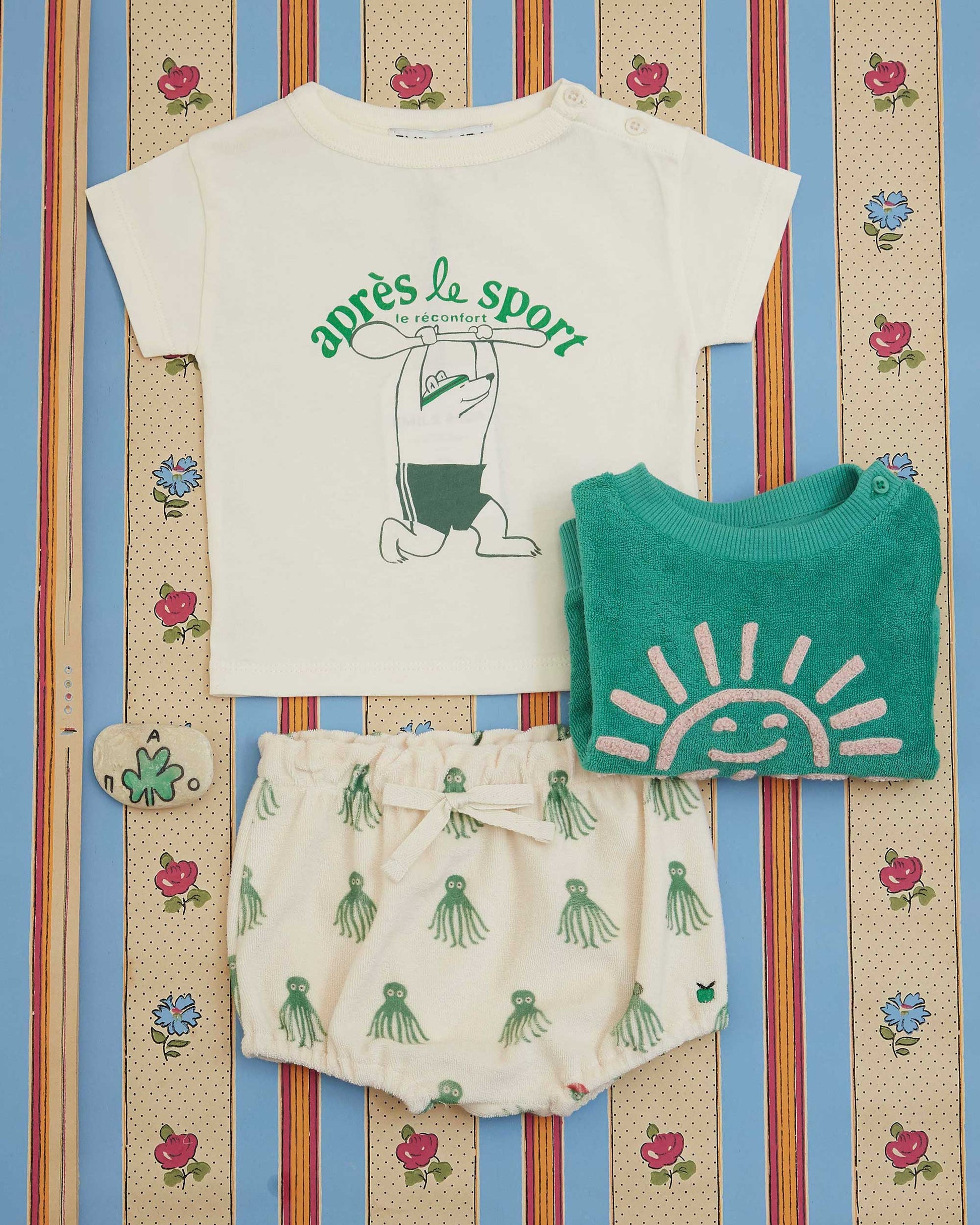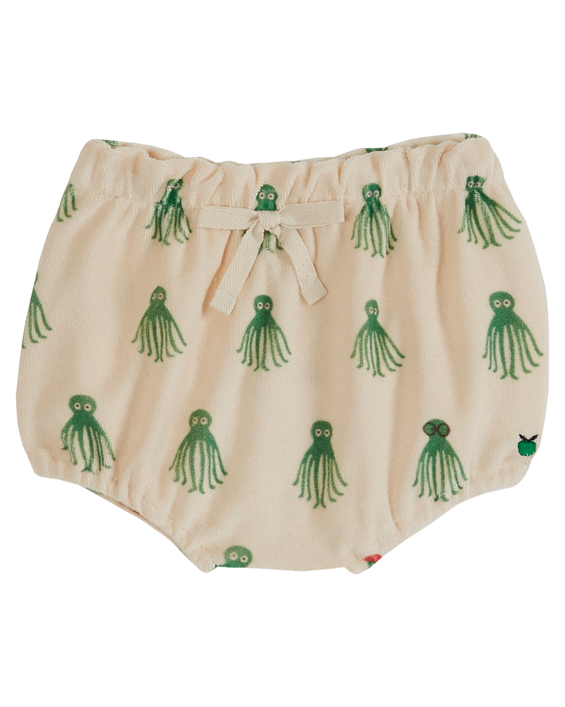 Bloomer en tissu éponge écru imprimé de mollusques verts de l'ordre des octopodes en all-over. Les membres de la famille des octopodes ont huit bras et sont communément appelés pieuvres. Pour confectionner ce tee-shirt nous avons sélectionné une matière, mélange de coton et de polyester tout doux, moelleux, extensible et confortable, comme nous le disent les bébés et les enfants qui l'on essayé.