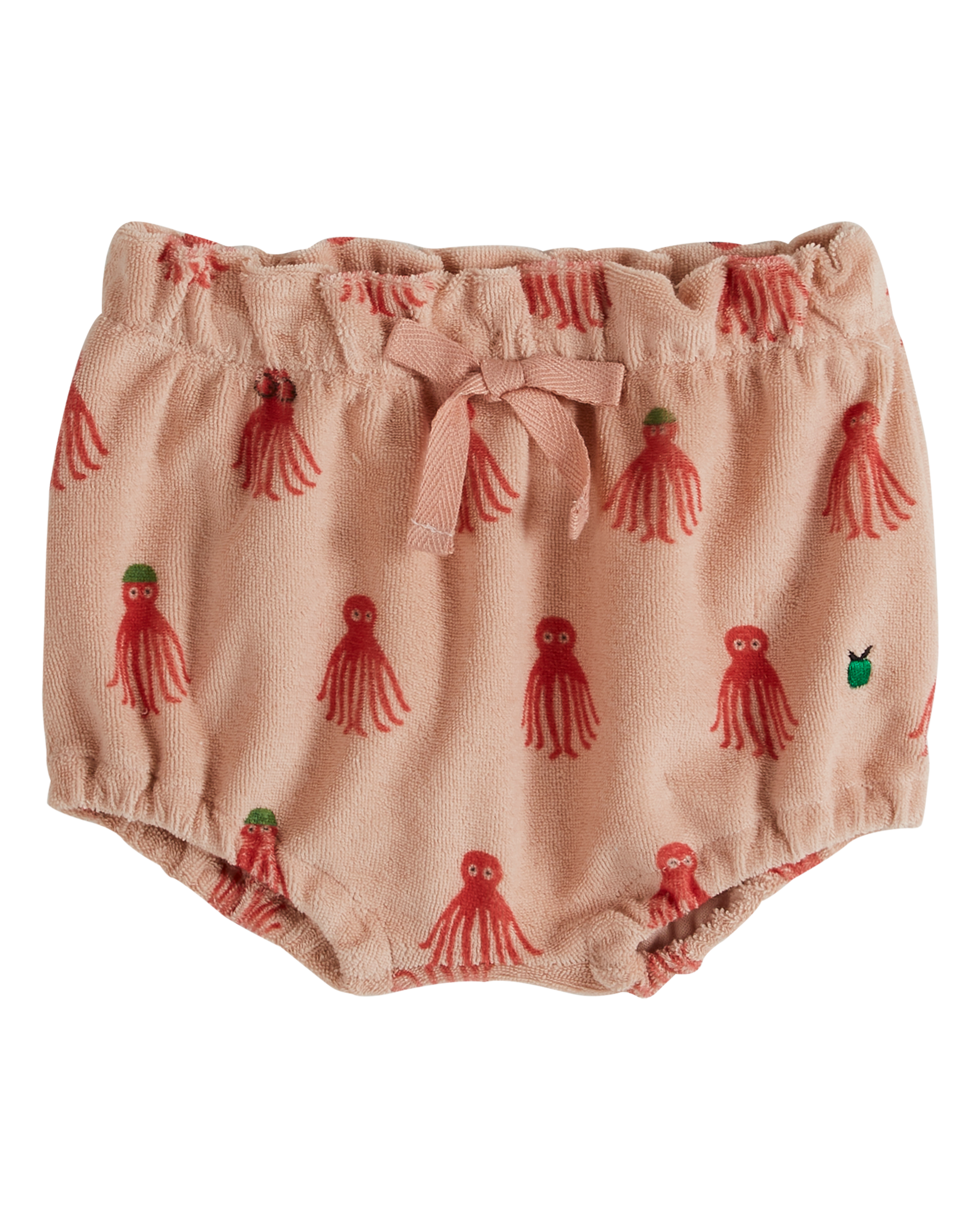 Bloomer en tissu éponge rose imprimé de mollusques rouges de l'ordre des octopodes en all-over. Les membres de la famille des octopodes ont huit bras et sont communément appelés pieuvres. Pour confectionner ce tee-shirt nous avons sélectionné une matière, mélange de coton et de polyester tout doux, moelleux, extensible et confortable, comme nous le disent les bébés et les enfants qui l'on essayé.