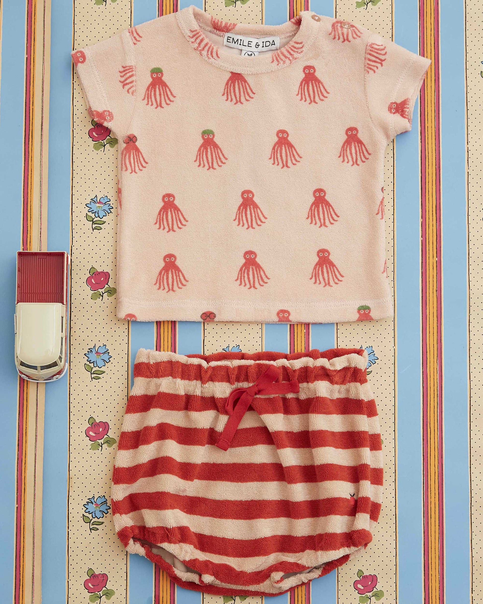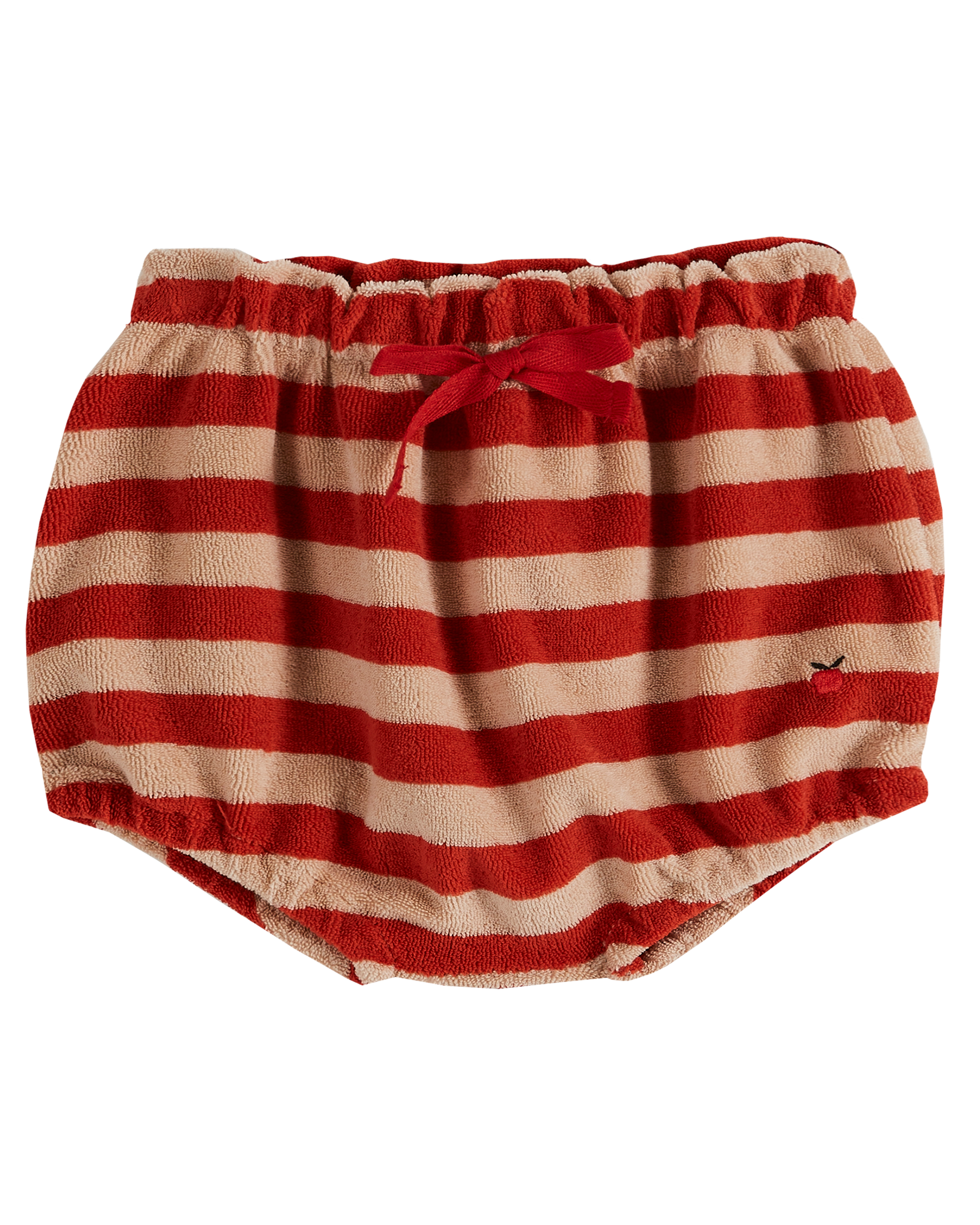 Bloomer en tissu éponge à larges rayures rouges et roses. On aime le mélange de coton et de polyester tout doux, moelleux et confortable. Le polyester, ajouté au coton en toute petite quantité, confère au tissu une élasticité exceptionnelle et lui permet de ne pas se froisser.