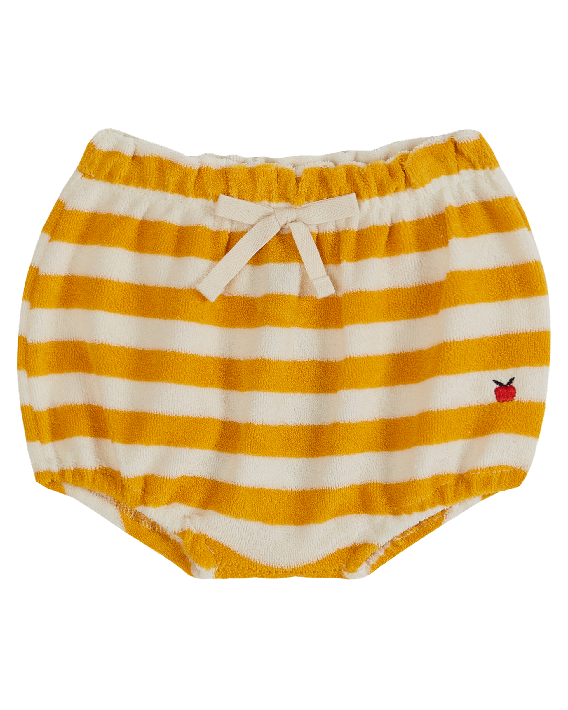 Bloomer en tissu éponge à larges rayures jaune d'or et écru. On aime le mélange de coton et de polyester tout doux, moelleux et confortable. Le polyester, ajouté au coton en toute petite quantité, confère au tissu une élasticité exceptionnelle et lui permet de ne pas se froisser.