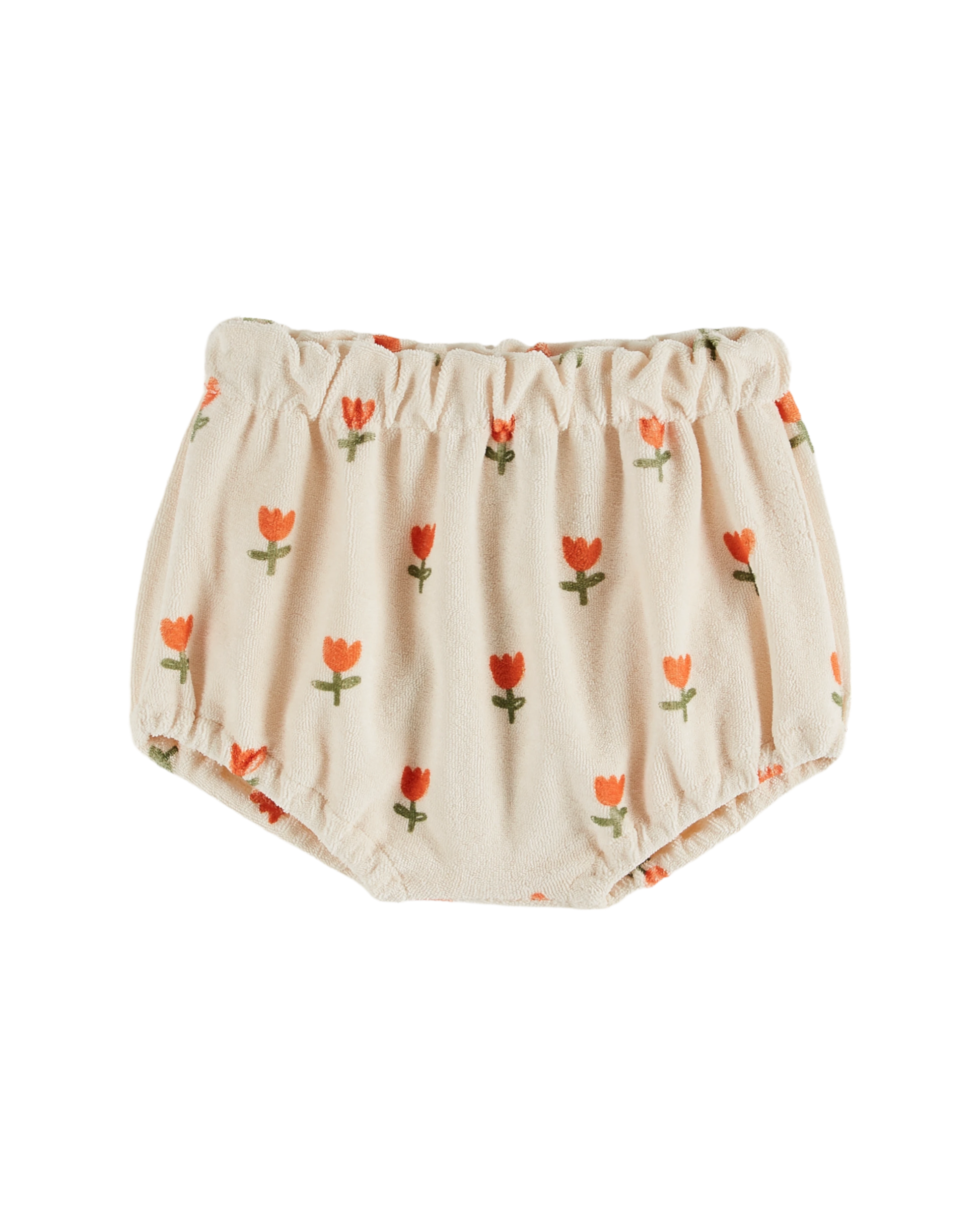 Ce bloomer en jersey de coton écru arbore de grandes tulipes rouges disposées comme dans un jardin à la française. Le tissu, mélange de coton et de polyester, est doux, moelleux et extensible, garantissant un confort optimal. Il dispose d'une taille élastiquée et de cuisses élastiquées pour une coupe pratique et agréable à porter. Associez-le à un t-shirt, une blouse ou une robe, et votre bébé sera prêt pour toutes les occasions, des balades aux jeux.