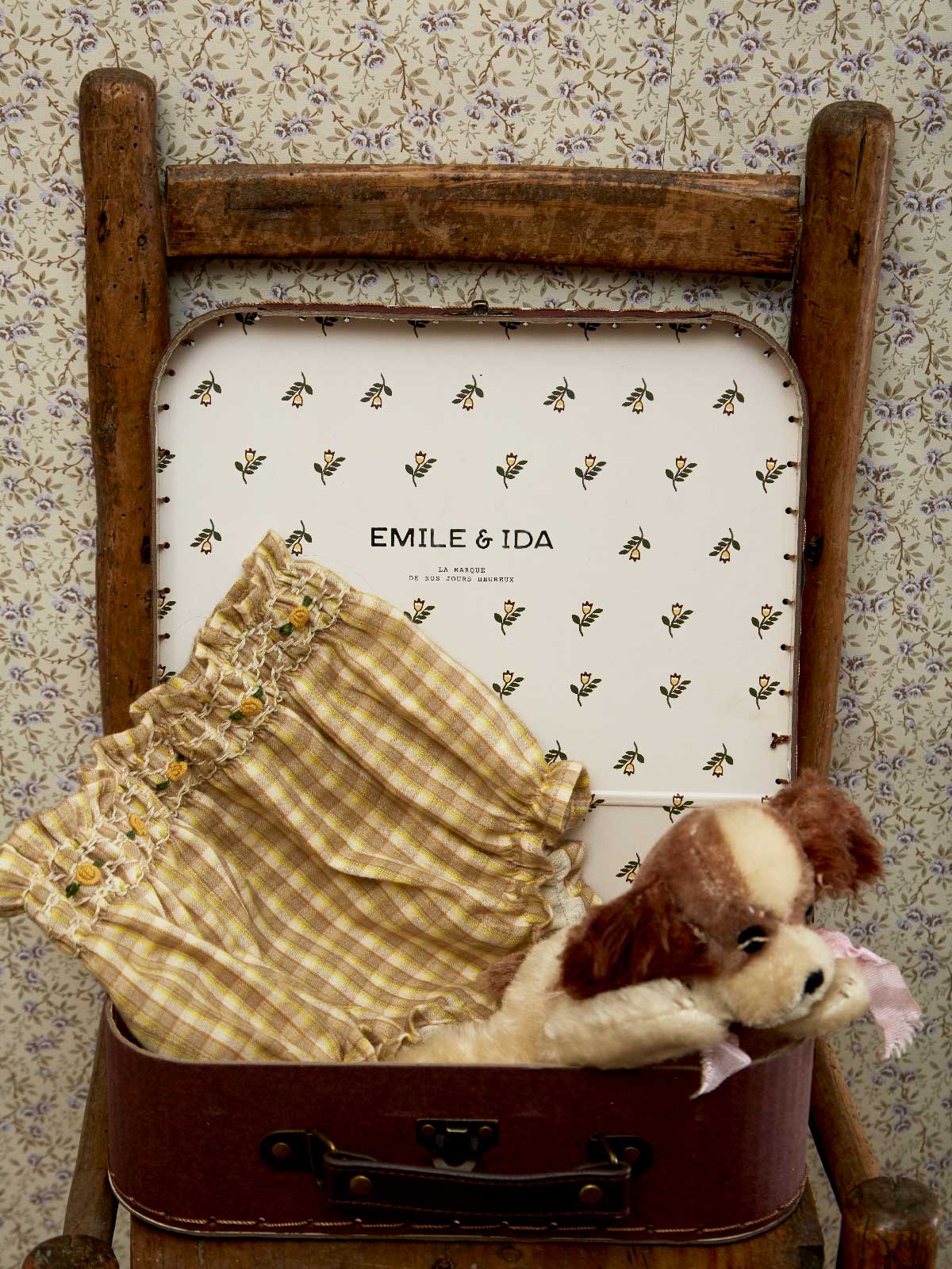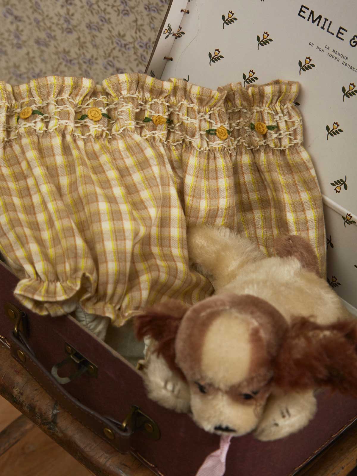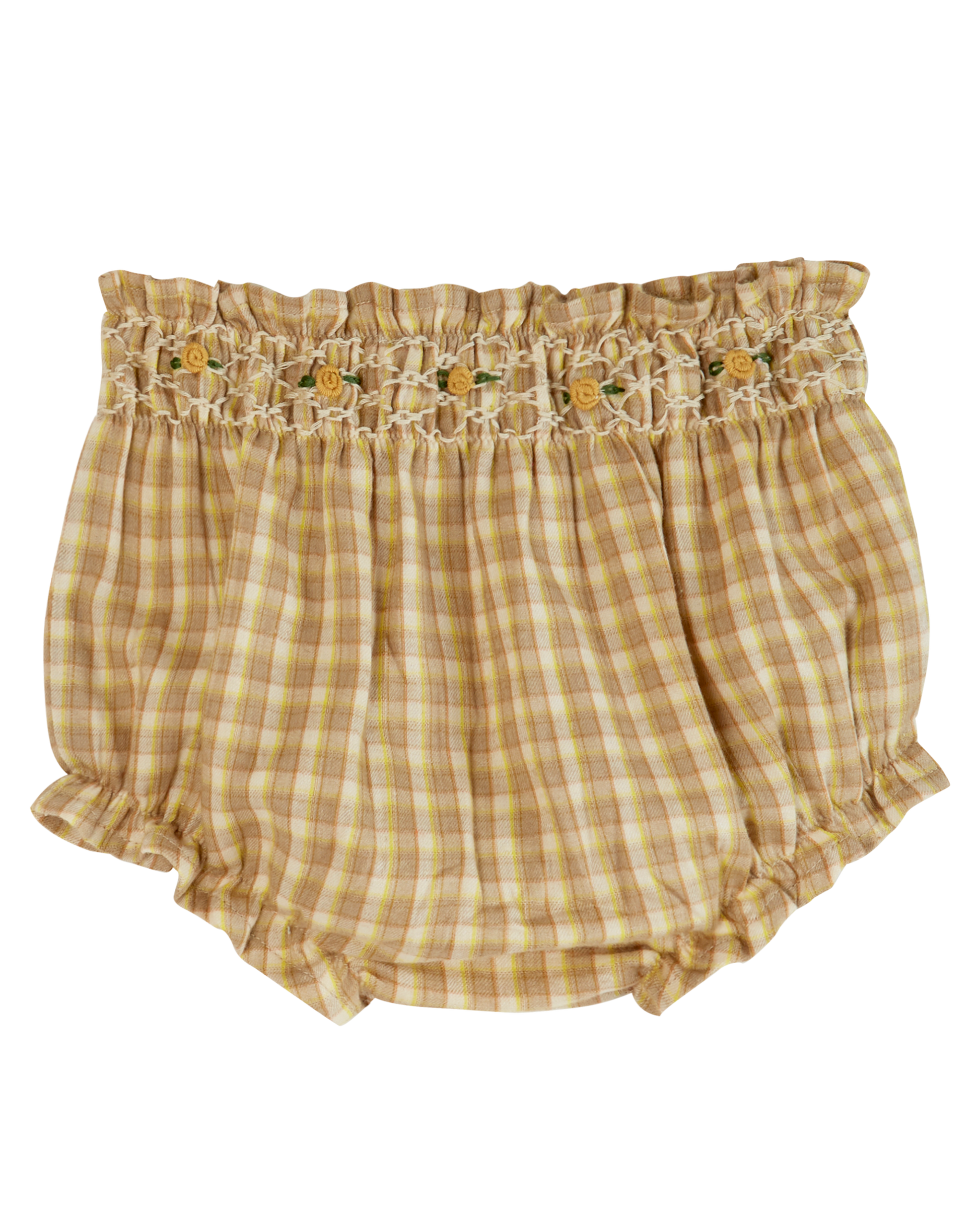 Bloomer en flanelle de coton beige et jaune. De fines lignes soulignent le quadrillage de ce joli bloomer élastiqué à la taille et aux cuisses avec un effet volanté. On aime la matière toute douce, toute souple et surtout bien chaude pour prémunir les bébés du froid de l'hiver. Il est doublé en voile de coton.