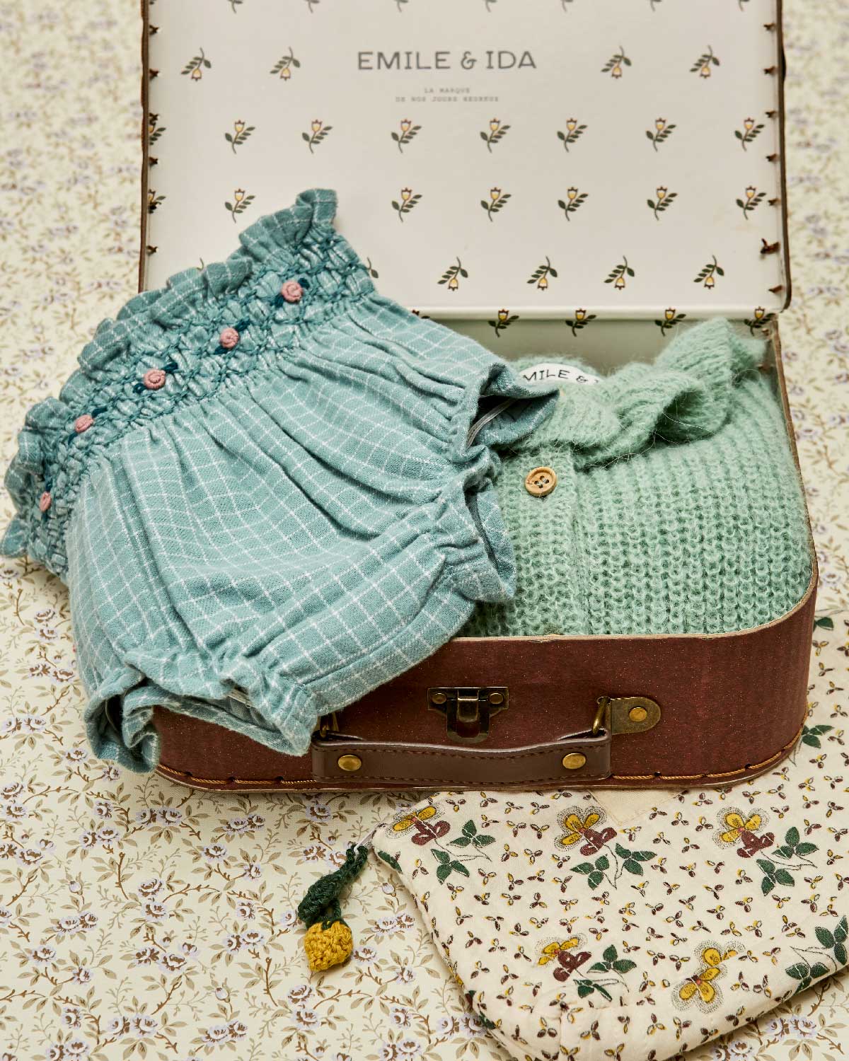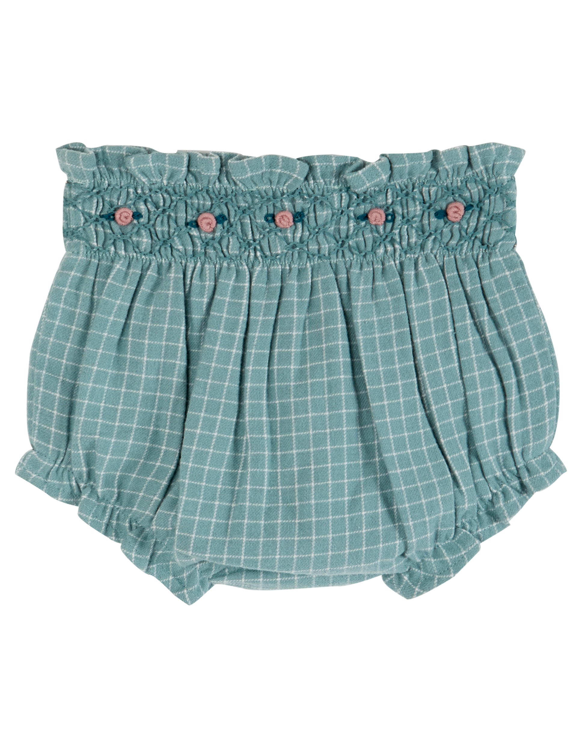 Bloomer à carreaux fenêtre en flanelle de coton céladon. Un joli bloomer élastiqué à la taille et aux cuisses avec un effet volanté. On aime la matière toute douce, toute souple et surtout bien chaude pour prémunir les bébés du froid de l'hiver.
