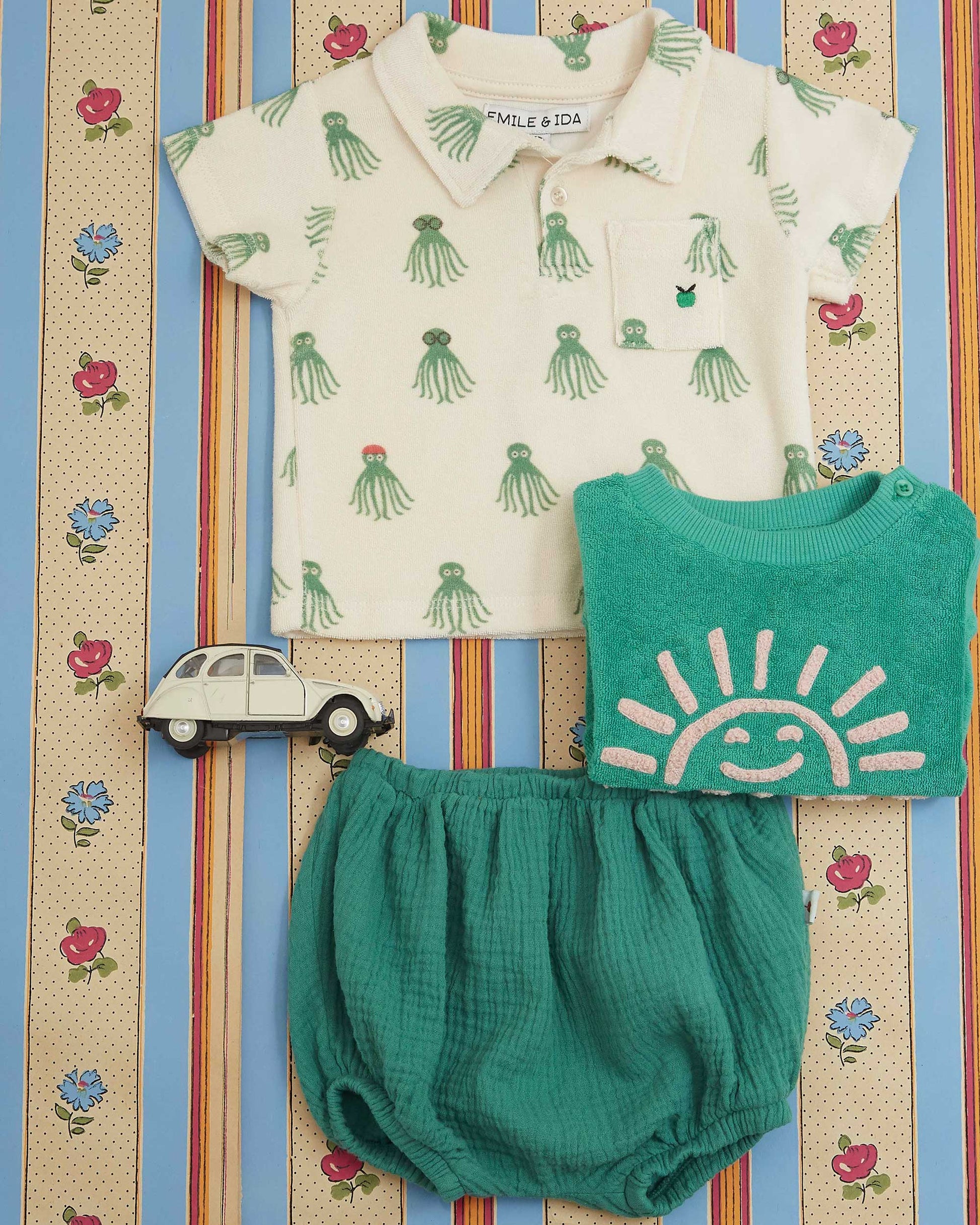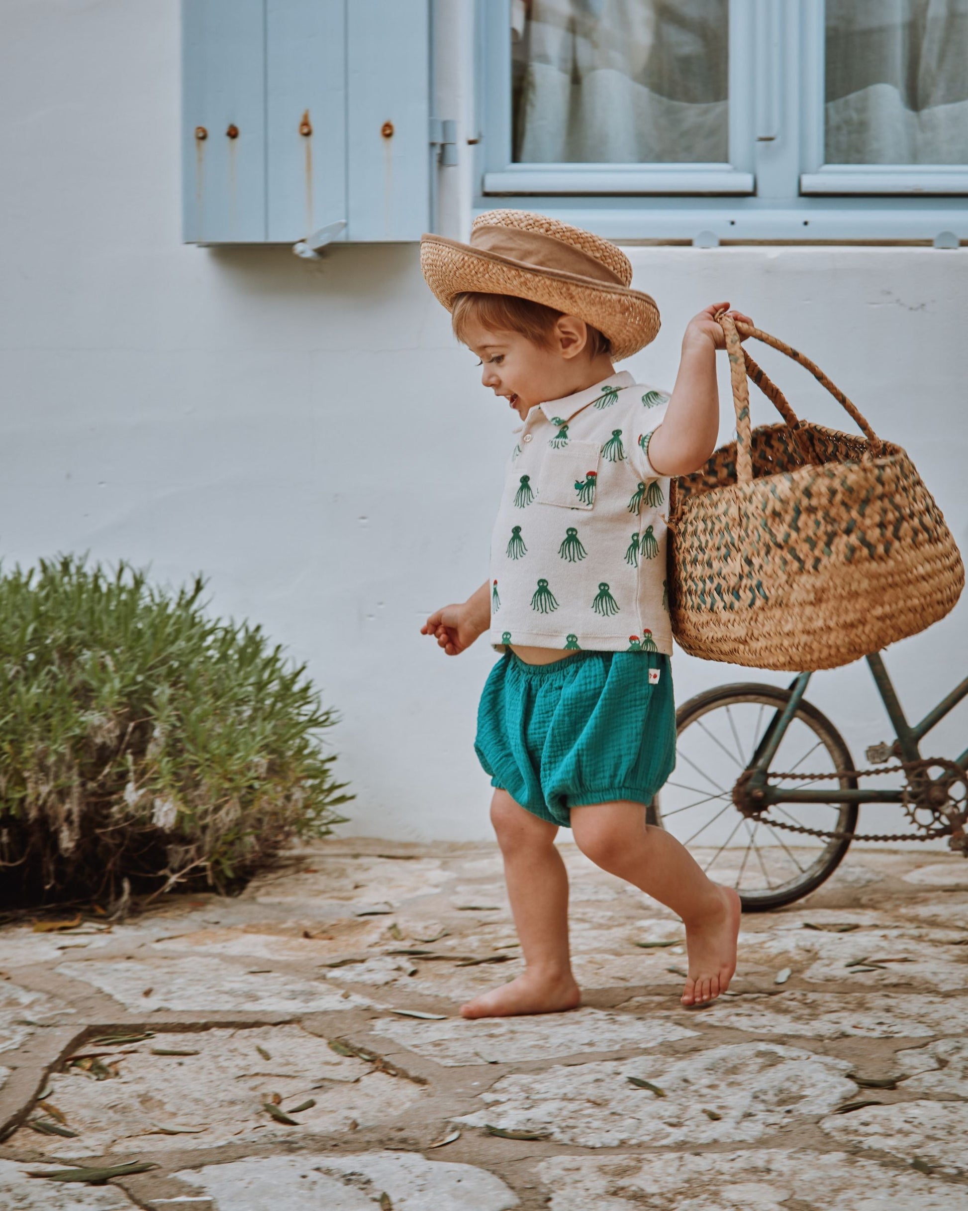 Bloomer en double gaze de coton verte. Une couleur écolo qui fournie, tout au long de la journée, de l'énergie… verte bien sûr ! On aime le coton tout doux, tout léger et la forme confortable. Une petite culotte bouffante dont la ceinture et les cuisses sont élastiquées.