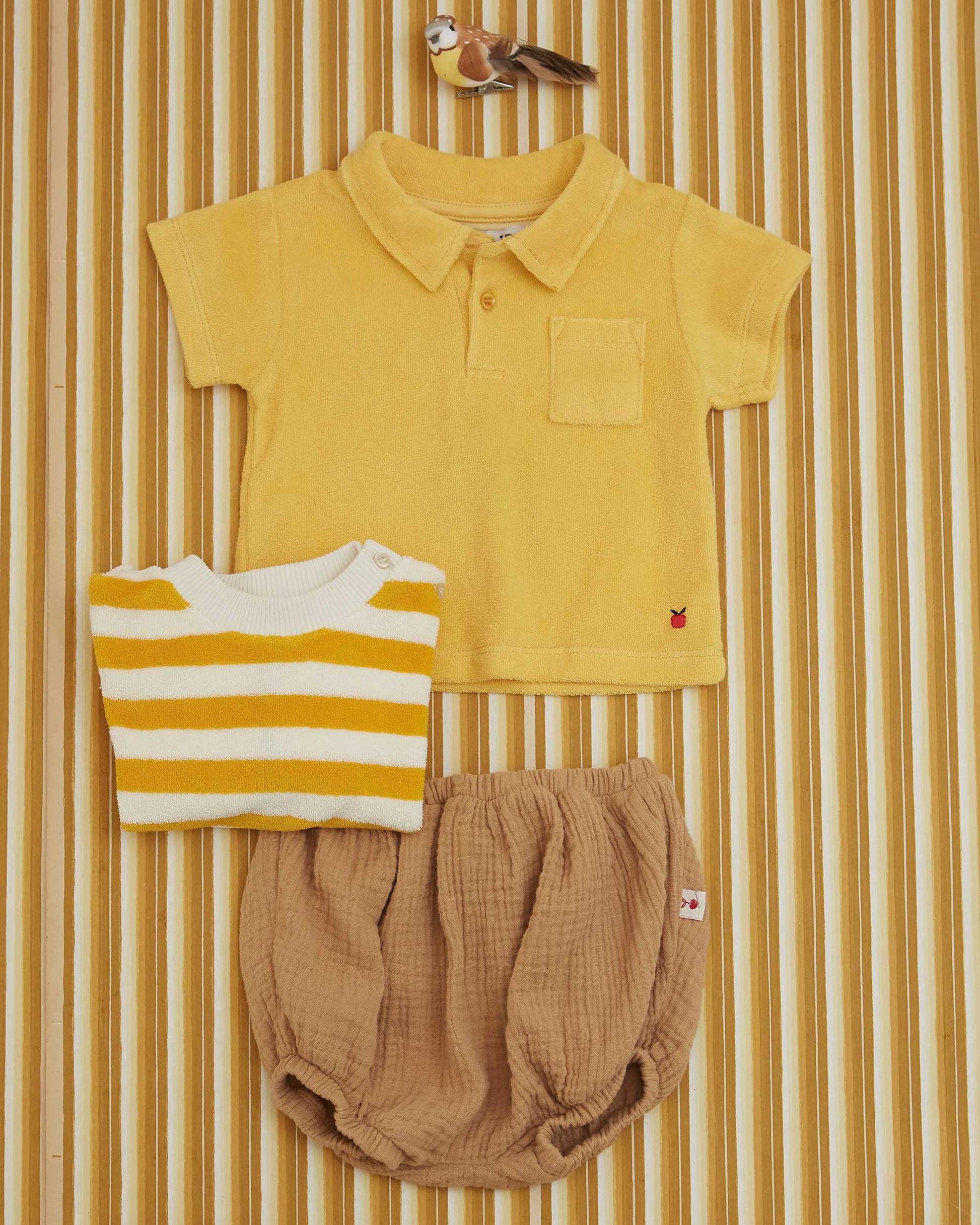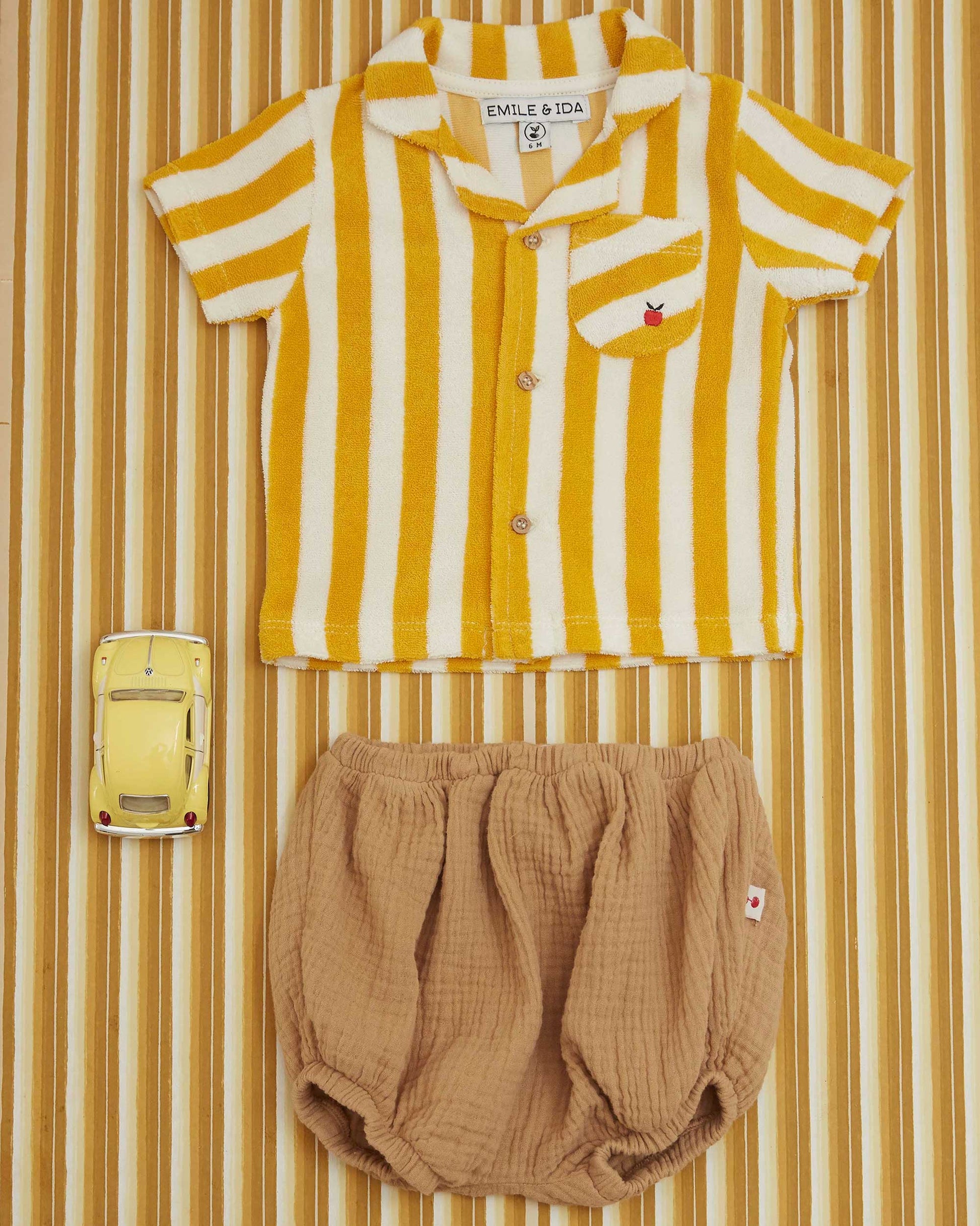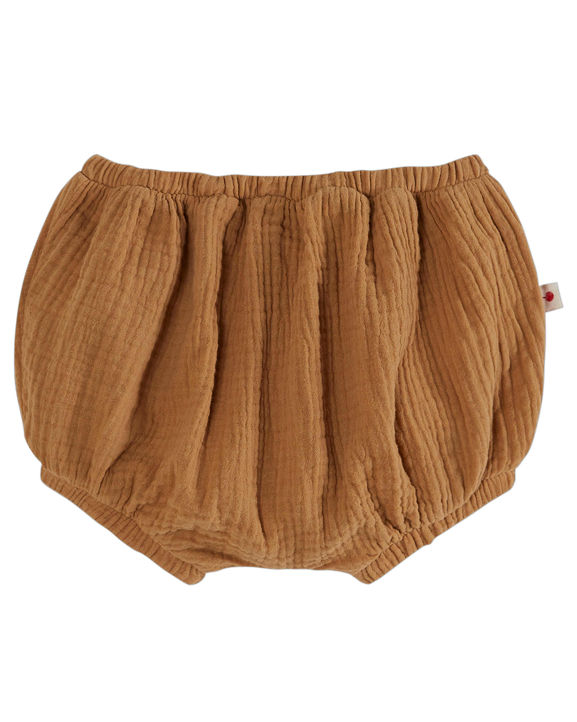 Bloomer en double gaze de coton miel. Et bien quelle soit de couleur miel elle n'attire pas les ours ! On aime le coton tout doux, tout léger et la forme confortable. Une petite culotte bouffante dont la ceinture et les cuisses sont élastiquées.