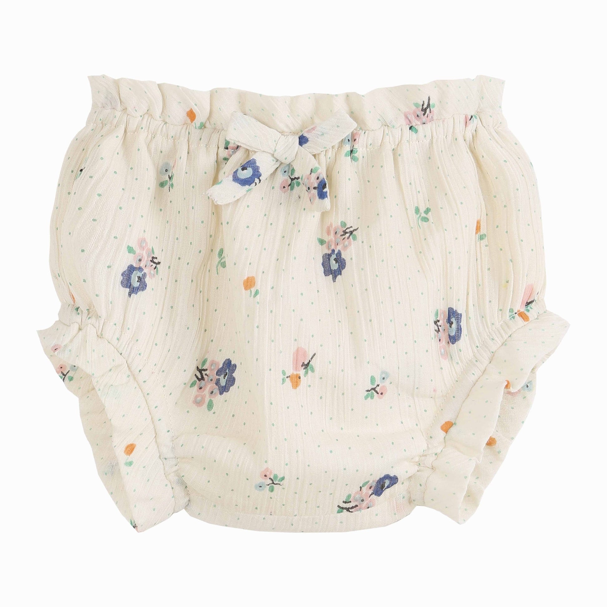 Bloomer en crépon écru imprimé "fruity fleuri". Un joli bloomer élastiqué à la taille et aux cuisses, entièrement doublé, à associer avec la blouse ou la robe "fruity fleuri" pour un total look. Modèle déposé