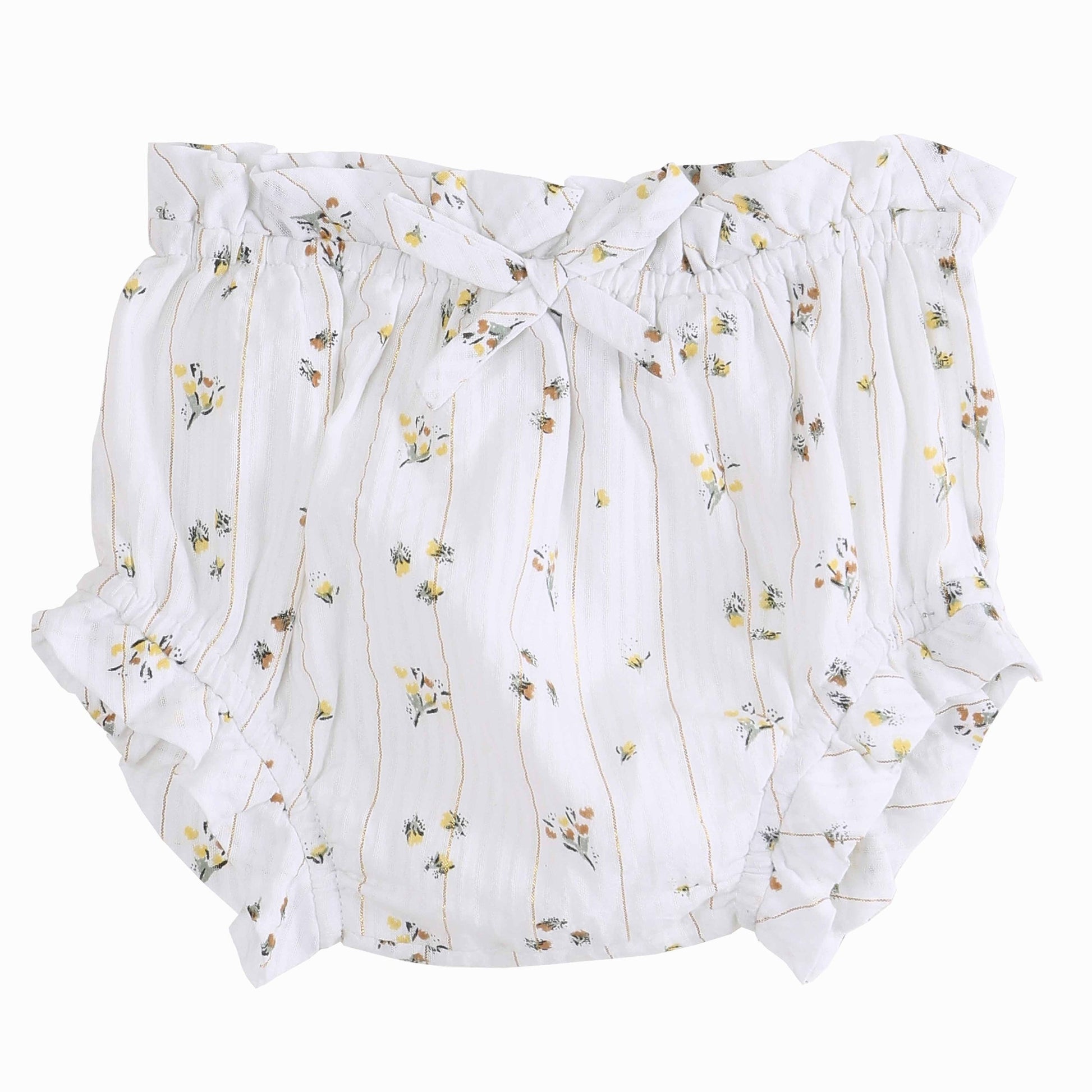Bloomer en coton écru imprimé "mimosa". Un joli bloomer élastiqué à la taille et aux cuisses, entièrement doublé, à associer avec la blouse ou la robe "mimosa" pour un total look. Modèle déposé