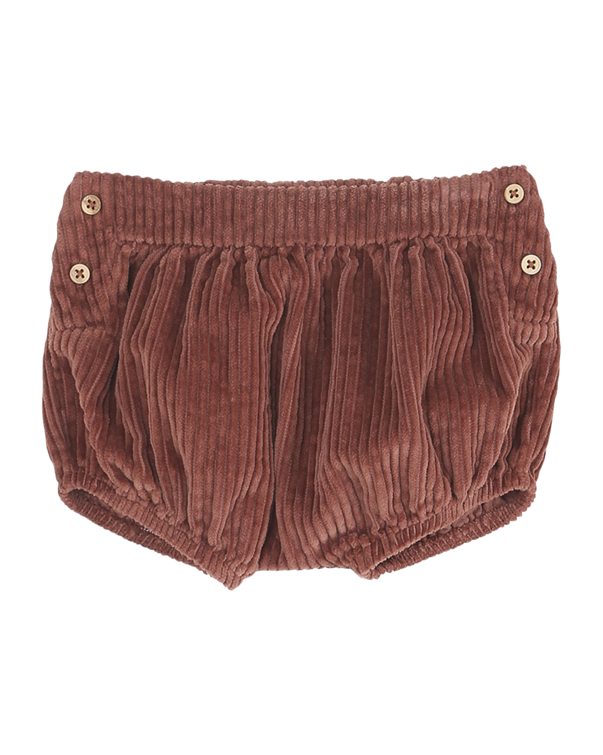 Bloomer en velours de coton côtelé auburn. On aime la matière à grosses côtes, épaisse mais souple, la forme bouffante, les petits élastiques autour des cuisses, la ceinture plate devant et extensible dans le dos, les ouvertures sur les côtés. A porter avec un collant dès les premiers froids de l'automne.