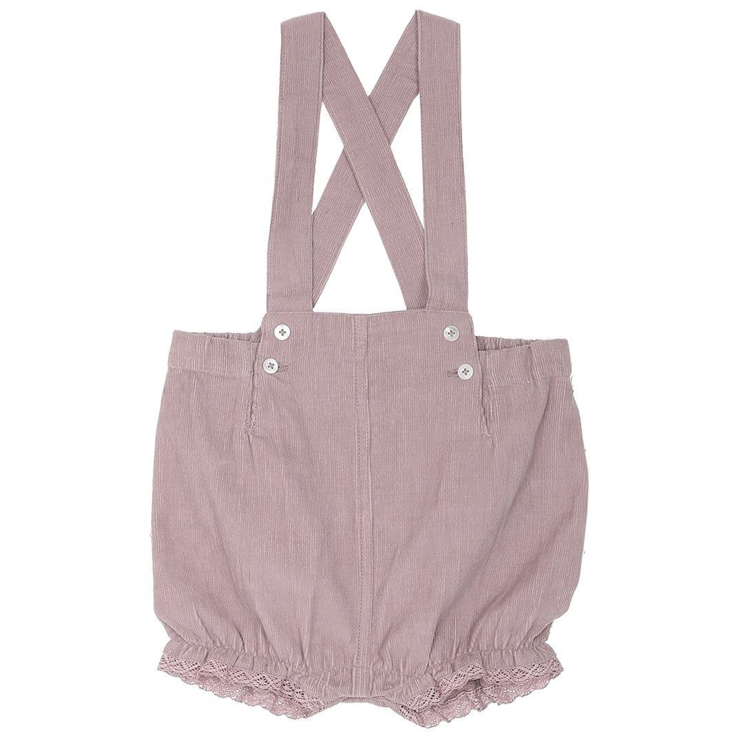 Bloomer à bretelles en velours de coton mauve. Un bloomer pensé comme une salopette avec une petite bavette doublée et des bretelles réglables dans le dos. La bavette s'ouvre avec des boutons en nacre naturelle, la taille s'ajuste avec un élastique à boutonnière. Le change est facilité par les 3 pressions de l'entrejambe. Le détail qui vous fera craquer ? La bordure de dentelle ton sur ton autour des cuisses.