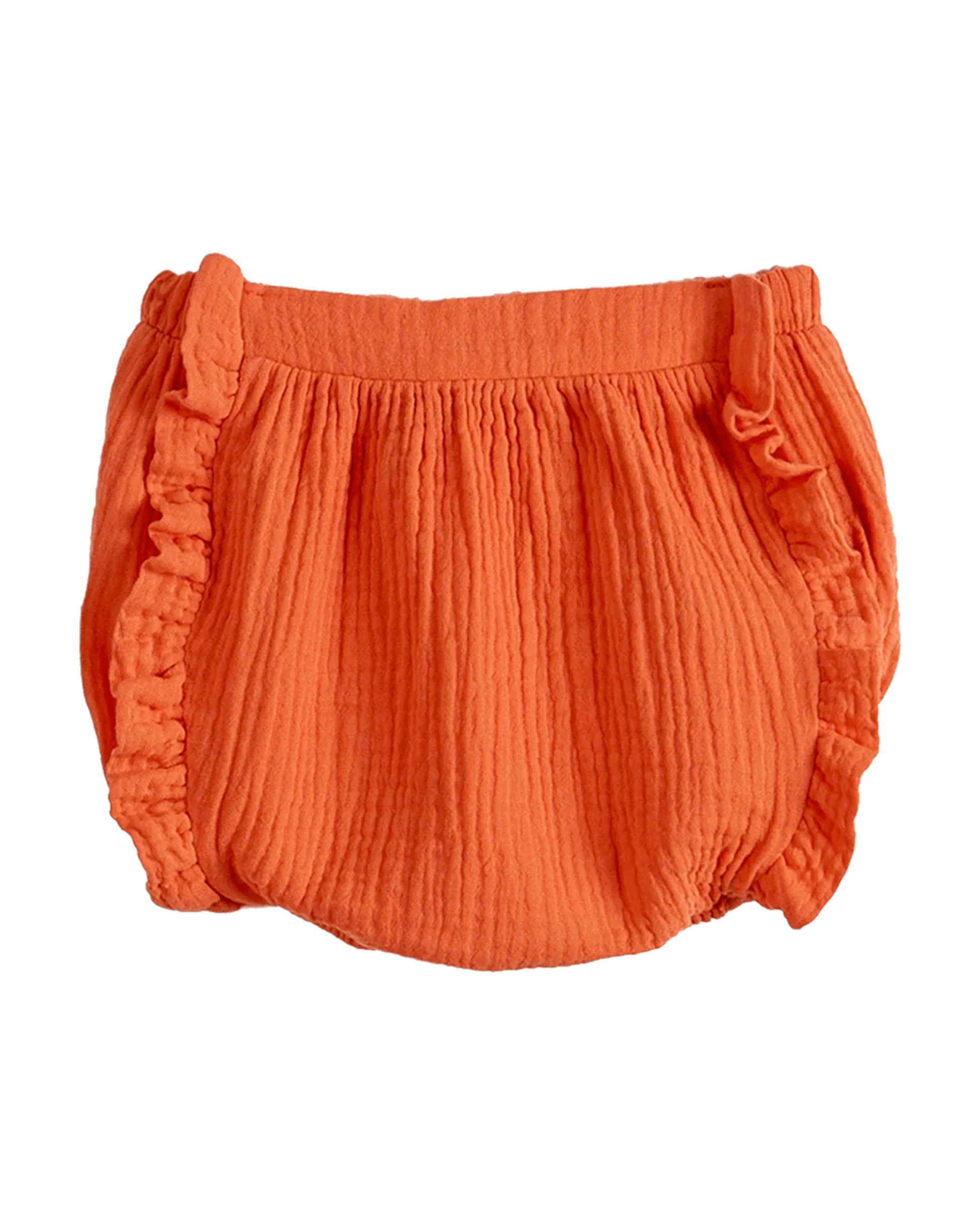 Bloomer en gaze de coton rouge vermillon. On aime la texture de la matière souple et douce, la couleur qui met en valeur le bronzage toujours léger des petits, les élastiques autour des cuisses et les deux volants qui encadrent le panneau de devant de cette culotte bouffante. La ceinture rapportée est élastiquée dans le dos et plate sur le devant.