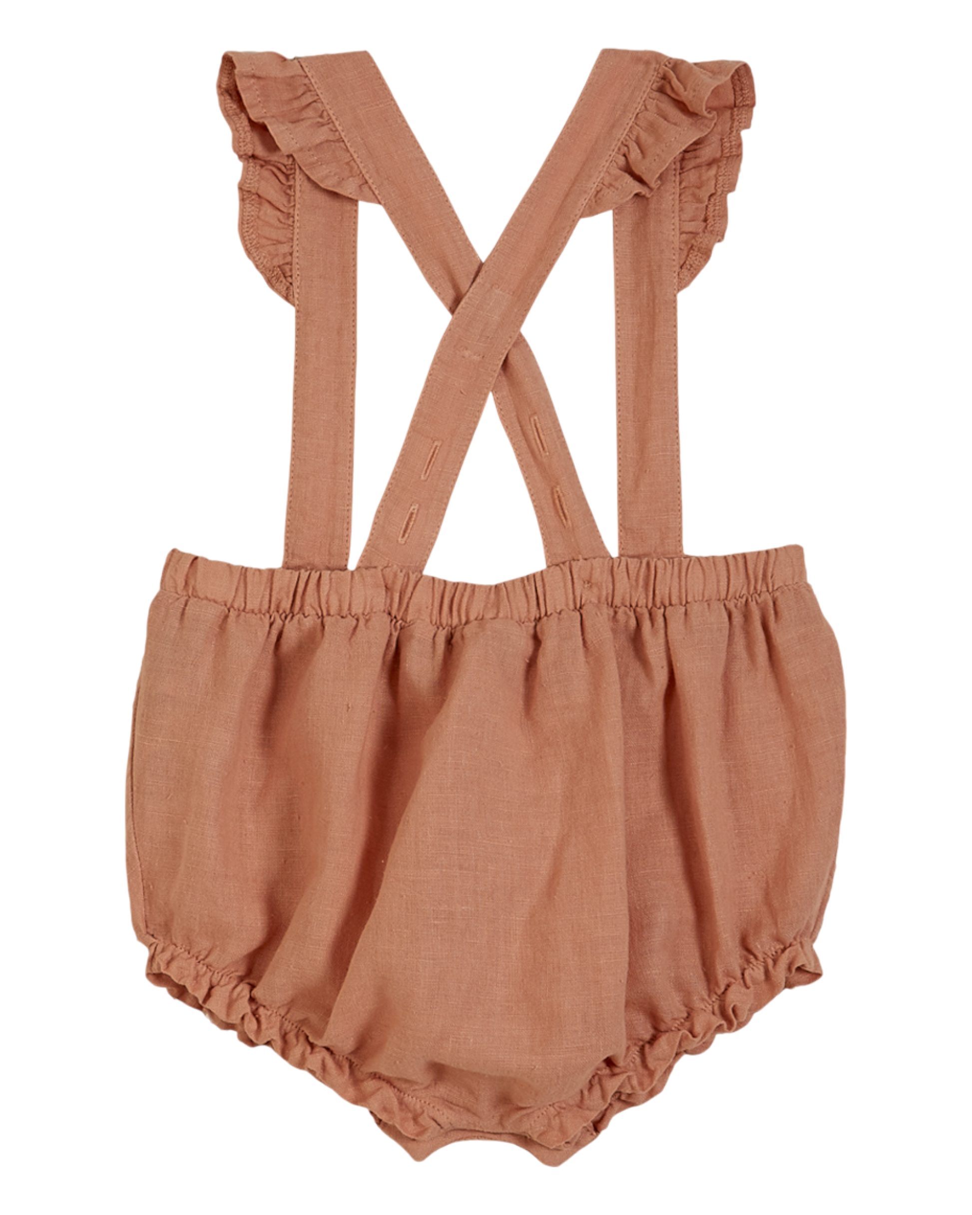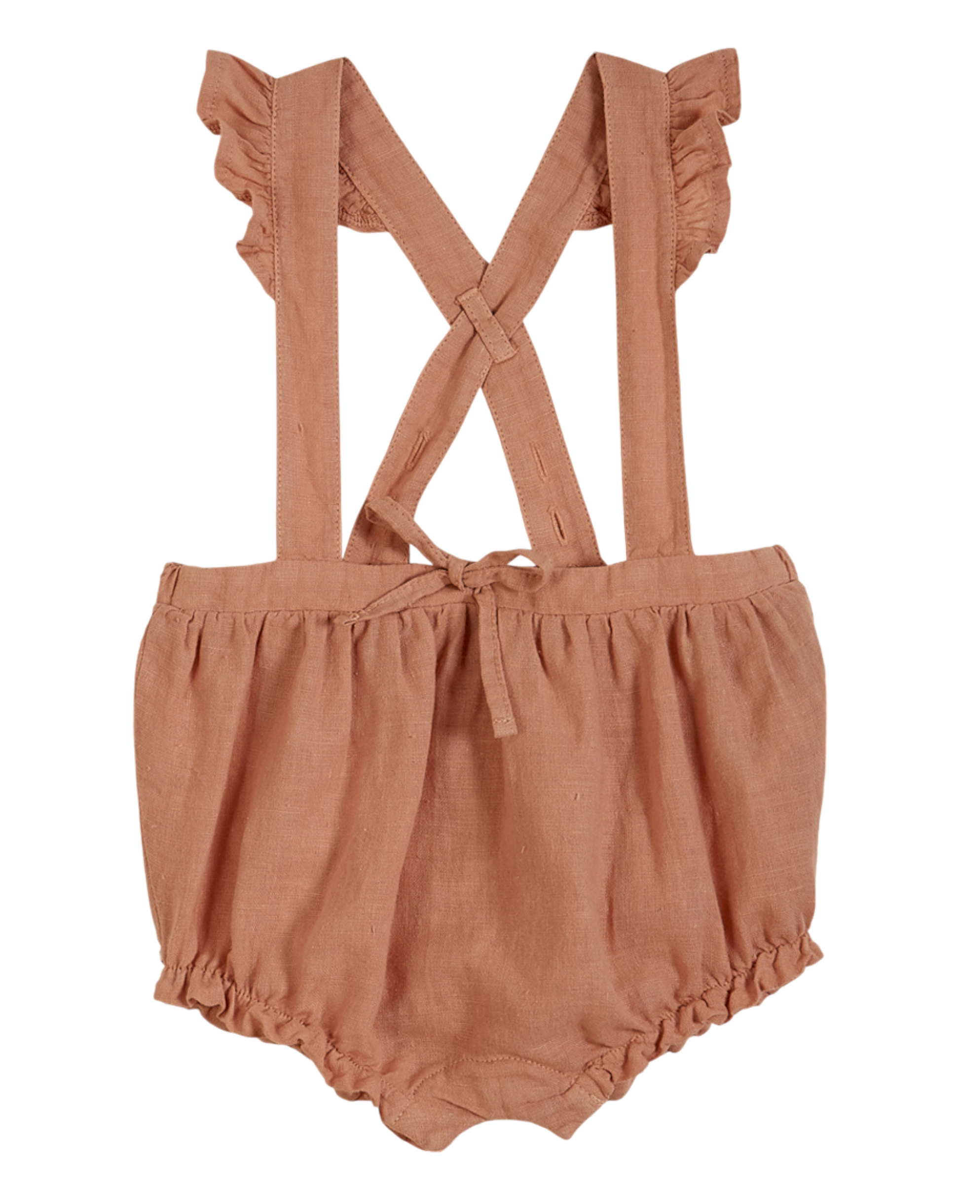 Bloomer en lin et coton mélangés rose. On aime la texture de la matière souple et douce, les bretelles réglables avec des volants sur les épaules et les élastiques qui donnent l'effet volanté autour des cuisses. La ceinture montée à la taille est élastiquée dans le dos et plate sur le devant qui est agrémenté d'un petit nœud. Les 3 pressions de l'entre-jambe facilitent le change.