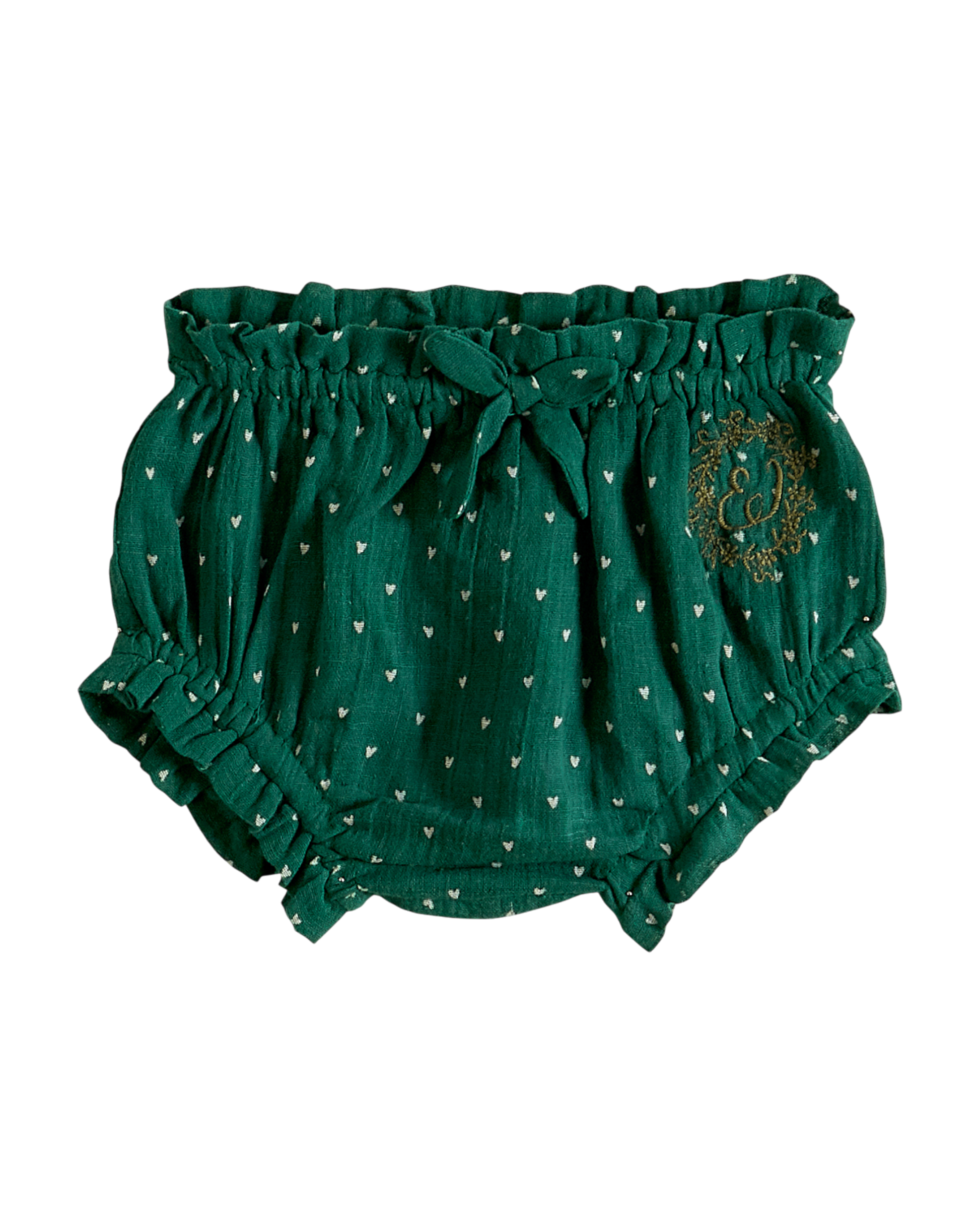 Bloomer en crépon de coton imprimé de mini cœurs blancs sur fond vert.