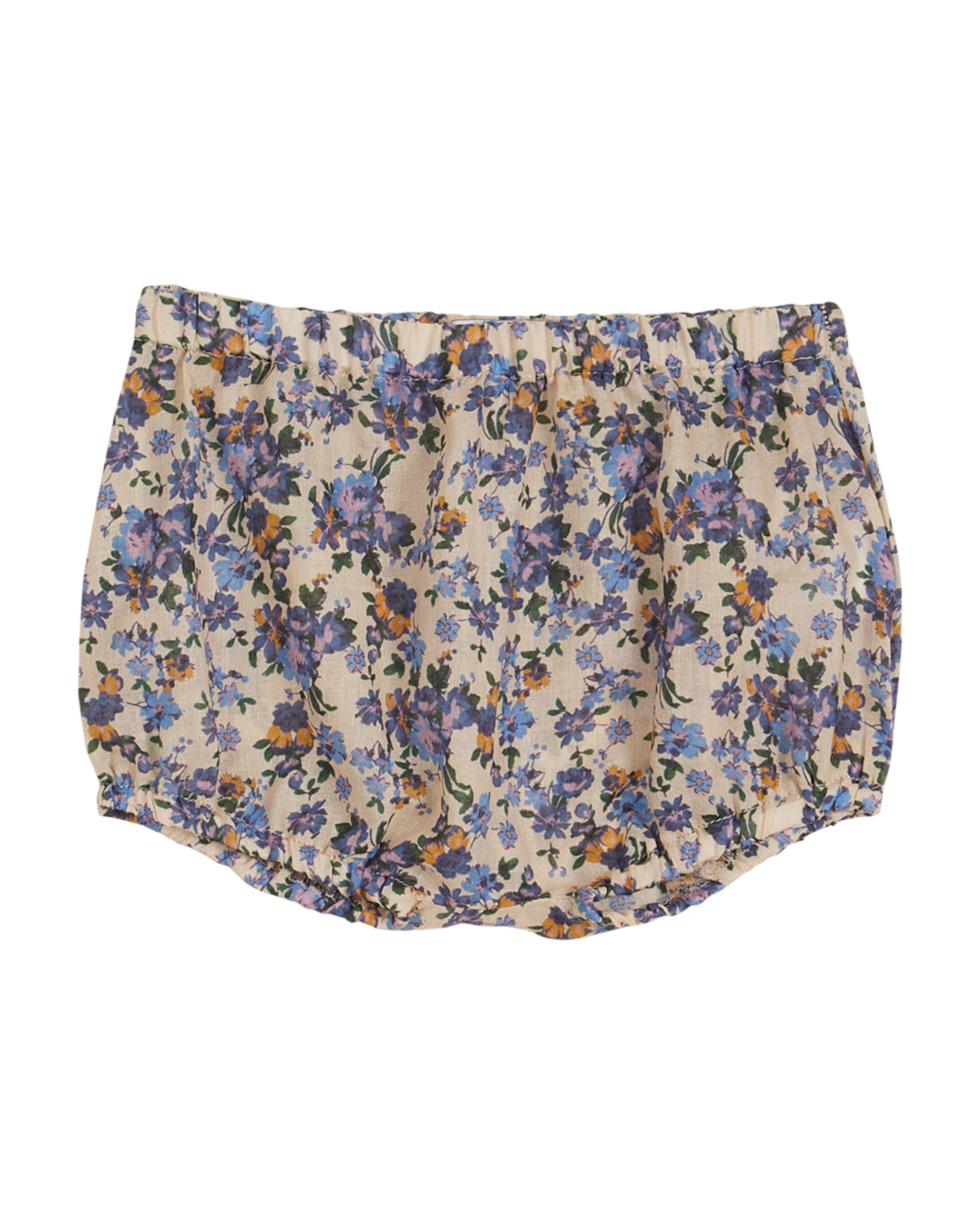 Bloomer en voile de coton écru imprimé en Italie d'un semis de fleurs estivales. Nos stylistes ont retravaillé la palette des couleurs dans un camaïeu de bleus afin que la tonalité s'intègre dans le thème de la collection. On aime la forme bouffante, chic et intemporelle et les élastiques habillés de la taille et des tours de cuisses.