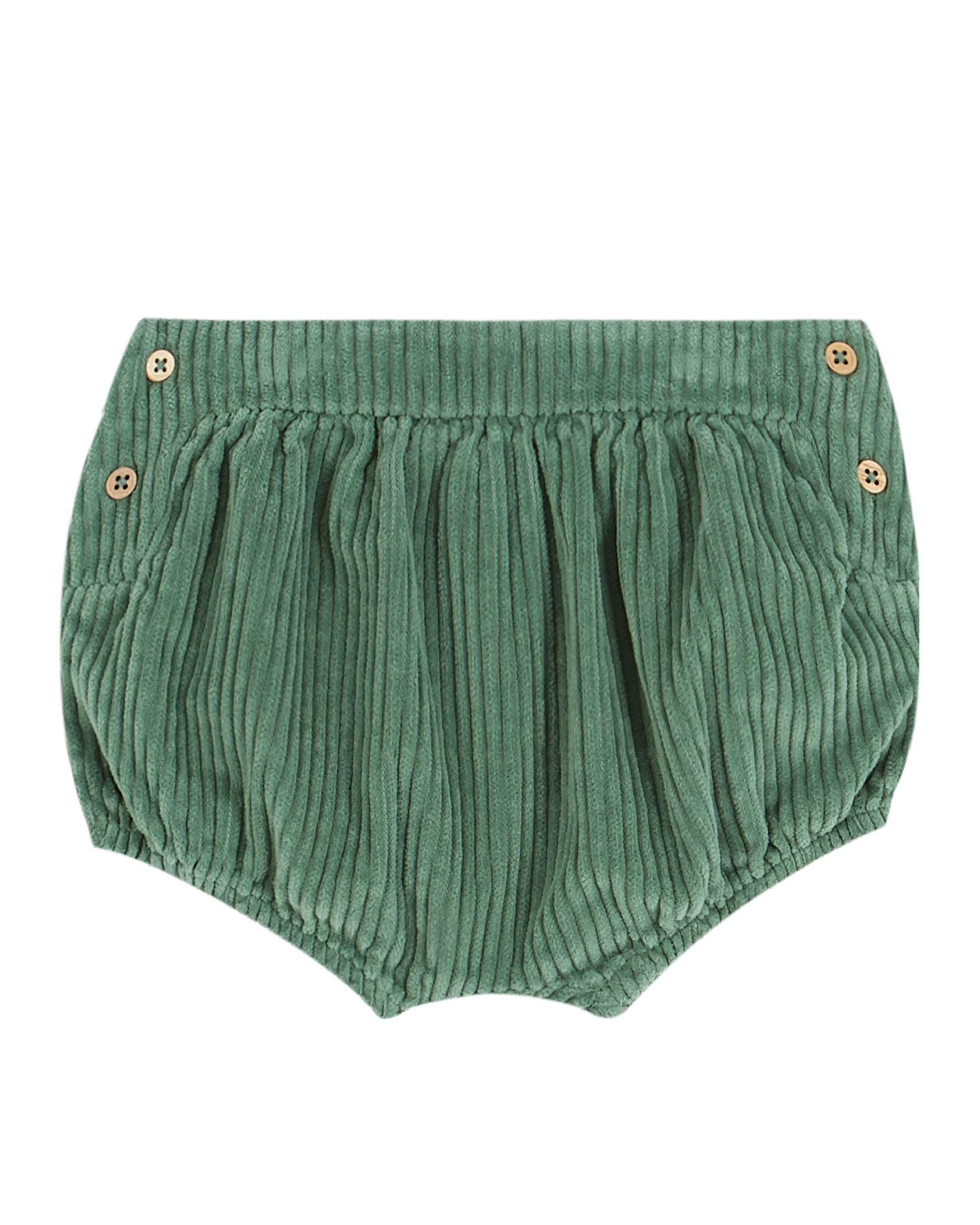 Bloomer en velours de coton côtelé vert. On aime le velours à grosses côtes, épais, moelleux, douillet, la forme bouffante, les petits élastiques autour des cuisses, la ceinture plate devant et extensible dans le dos, les fentes sur les côtés qui s'ouvrent ou se ferment avec des boutons en bois. À porter avec un collant dès que l'automne montre le bout de son nez.