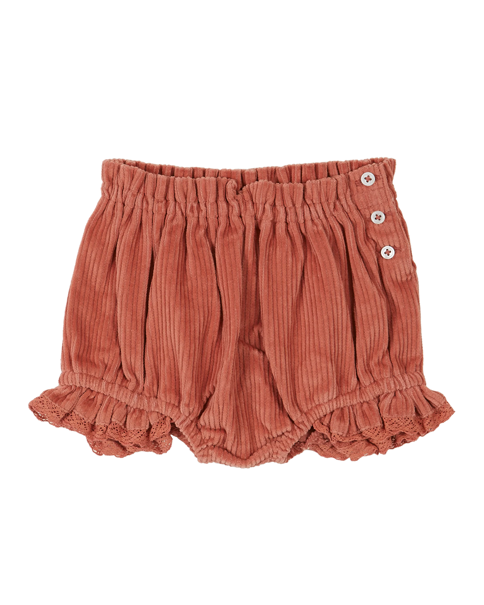 Bloomer en velours de coton côtelé bois de rose. Un joli bloomer élastiqué à la taille et aux cuisses avec un effet volanté. On aime les grosses côtes, plus faciles à descendre et à remonter que celles du tour de France, le velours tout doux, tout souple et surtout bien chaud pour prémunir les bébés du froid de l'hiver et la dentelle ton sur ton autour des cuisses. Sur le côté, une patte de boutonnage et 3 boutons en nacre naturelle ferment cette culotte. Un bloomer pour les bébés bien culottés à associer avec une blouse, un tee-shirt et un collant.