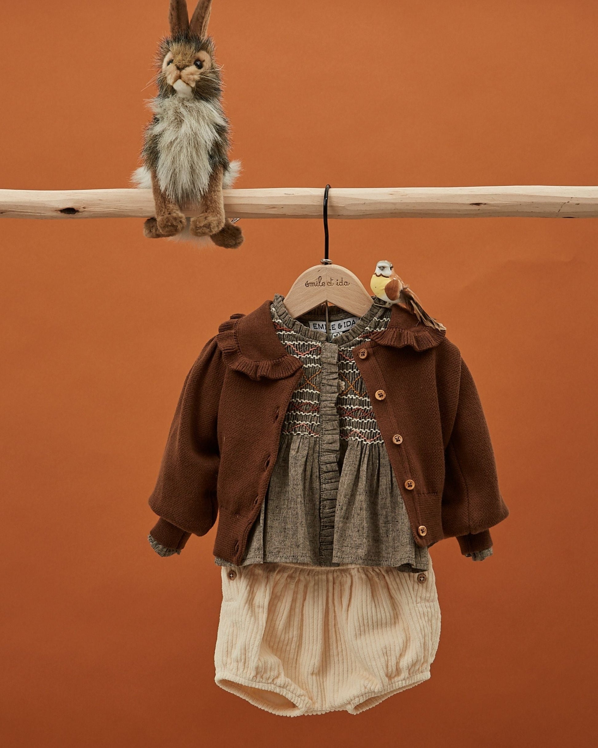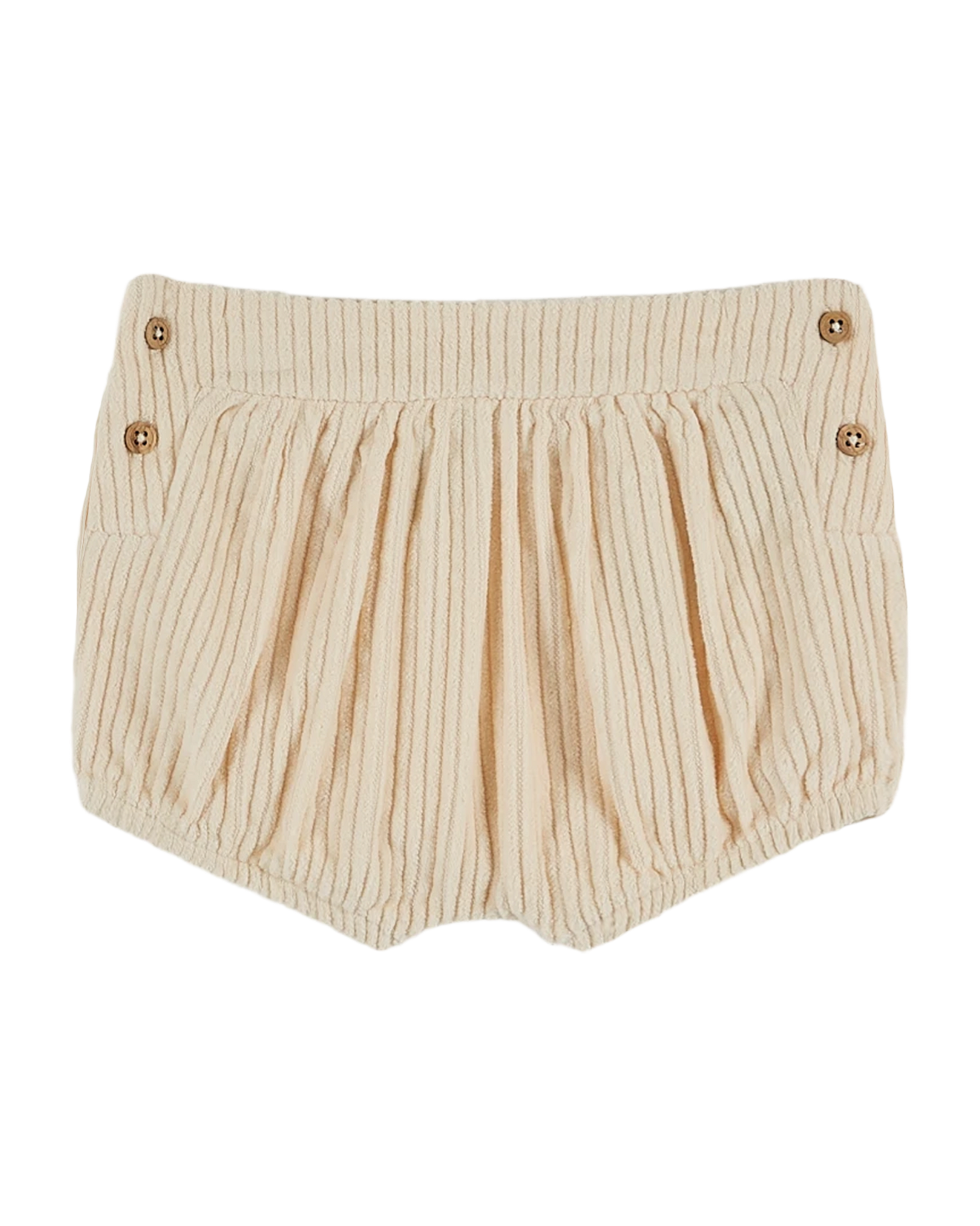 Bloomer en velours de coton côtelé écru. On aime le velours à grosses côtes, épais, moelleux, douillet, la forme bouffante, les petits élastiques autour des cuisses, la ceinture plate devant et extensible dans le dos, les fentes sur les côtés qui s'ouvrent ou se ferment avec des boutons en bois . A porter avec un collant dès que l'automne montre le bout de son nez.