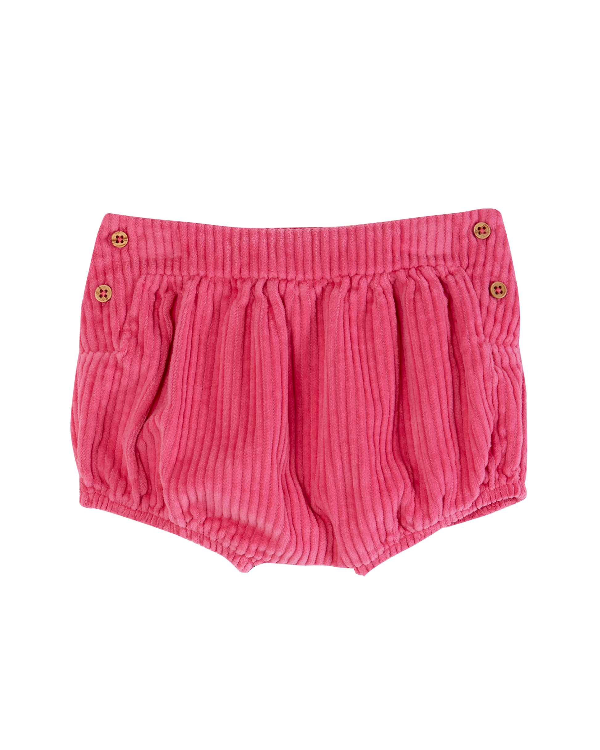 Bloomer en velours de coton côtelé rose fushia. On aime le velours à grosses côtes, épais, moelleux, douillet, la forme bouffante, les petits élastiques autour des cuisses, la ceinture plate devant et extensible dans le dos, les fentes sur les côtés qui s'ouvrent ou se ferment avec des boutons en bois . A porter avec un collant dès que l'automne montre le bout de son nez.