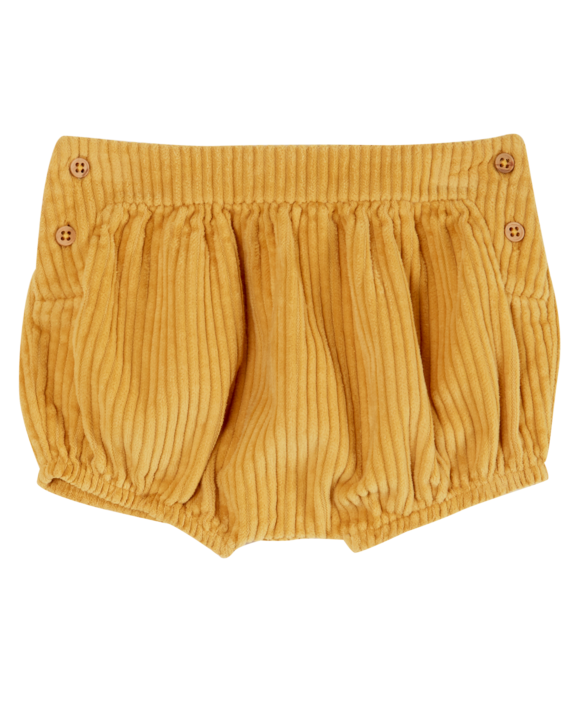 Bloomer en velours de coton côtelé jaune maïs. On aime le velours à grosses côtes, épais, moelleux, douillet, la forme bouffante, les petits élastiques autour des cuisses, la ceinture plate devant et extensible dans le dos, les fentes sur les côtés qui s'ouvrent ou se ferment avec des boutons en bois . A porter avec un collant dès que l'automne montre le bout de son nez.