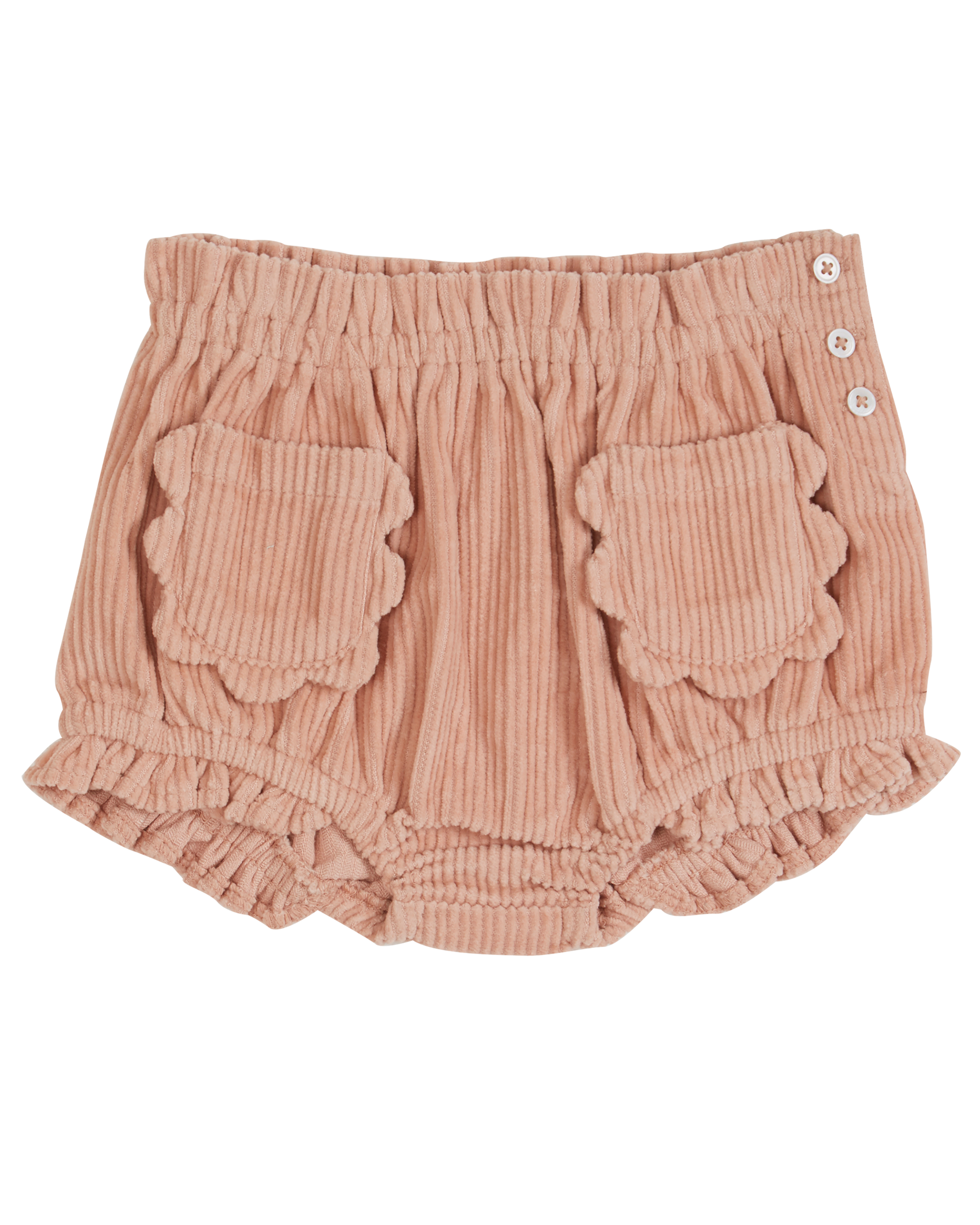 Bloomer en velours de coton milleraies rose poudré. Un joli bloomer élastiqué à la taille et aux cuisses volantées. On aime les poches fleurs, les fines côtes du velours tout doux, tout souple et surtout bien chaud pour prémunir les bébés du froid de l'hiver. Sur le côté, une patte de boutonnage et 3 boutons en nacre naturelle ferment cette culotte.