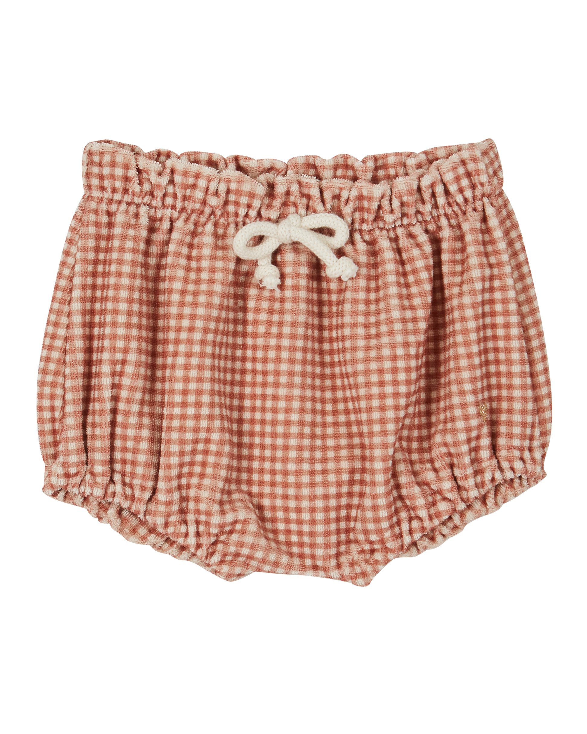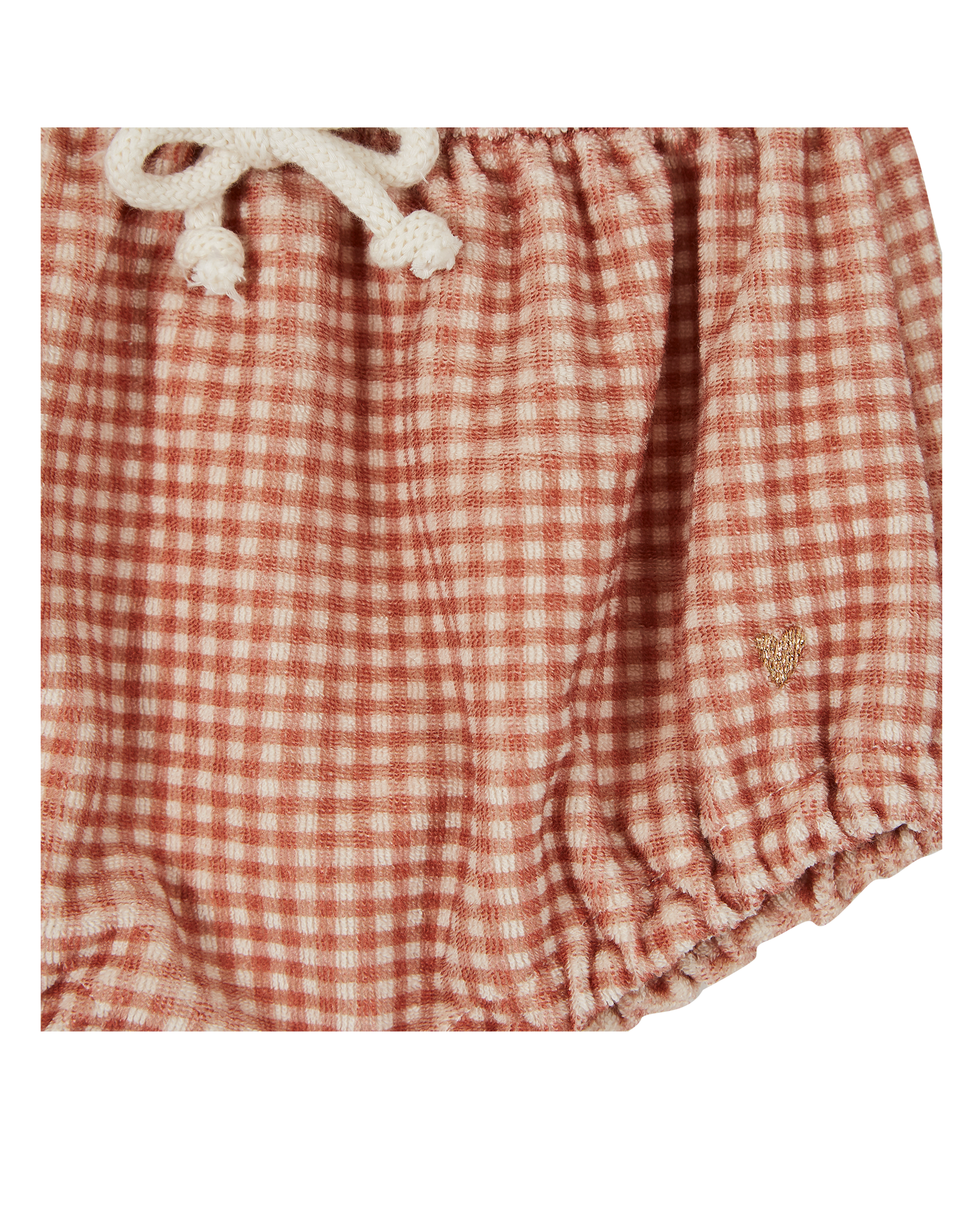 Bloomer en tissu éponge vichy rouge de Mars. Une couleur qui fait voyager ! On aime le mélange de coton et de polyester tout doux, moelleux et confortable. Le polyester, ajouté au coton en toute petite quantité, confère au tissu une élasticité exceptionnelle et lui permet de ne pas se froisser. Une petite culotte bouffante dont la ceinture et les cuisses sont élastiquées.