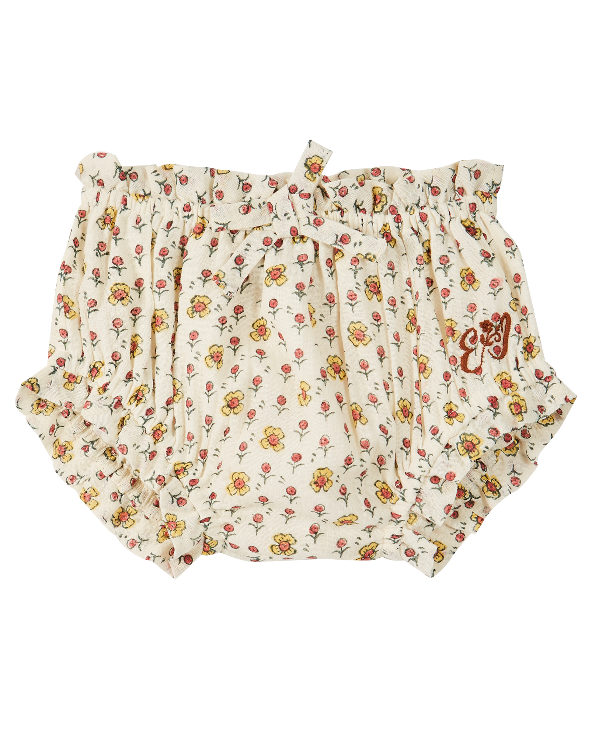Bloomer en voile de coton écru. Sur le fond écru de cette culotte bouffante, légère bien qu'entièrement doublée, nous avons semé des fleurettes jaune et rouge. Certaines ont la main verte chez Emile et Ida et des artisans indiens la main experte pour imprimer ce motif aux block print..