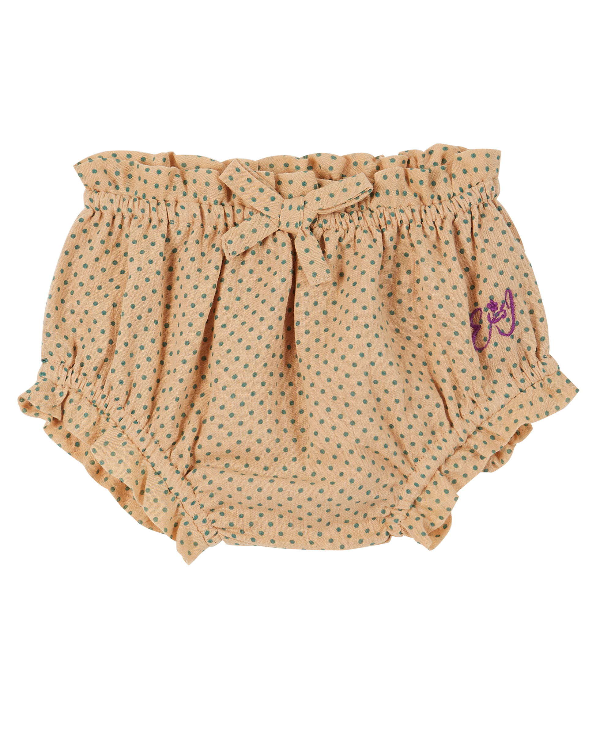 Bloomer en voile de coton beige. Sur le fond beige de cette culotte bouffante, légère bien qu'entièrement doublée, les petits pois sont verts. Cela change des petits poissons rouges !