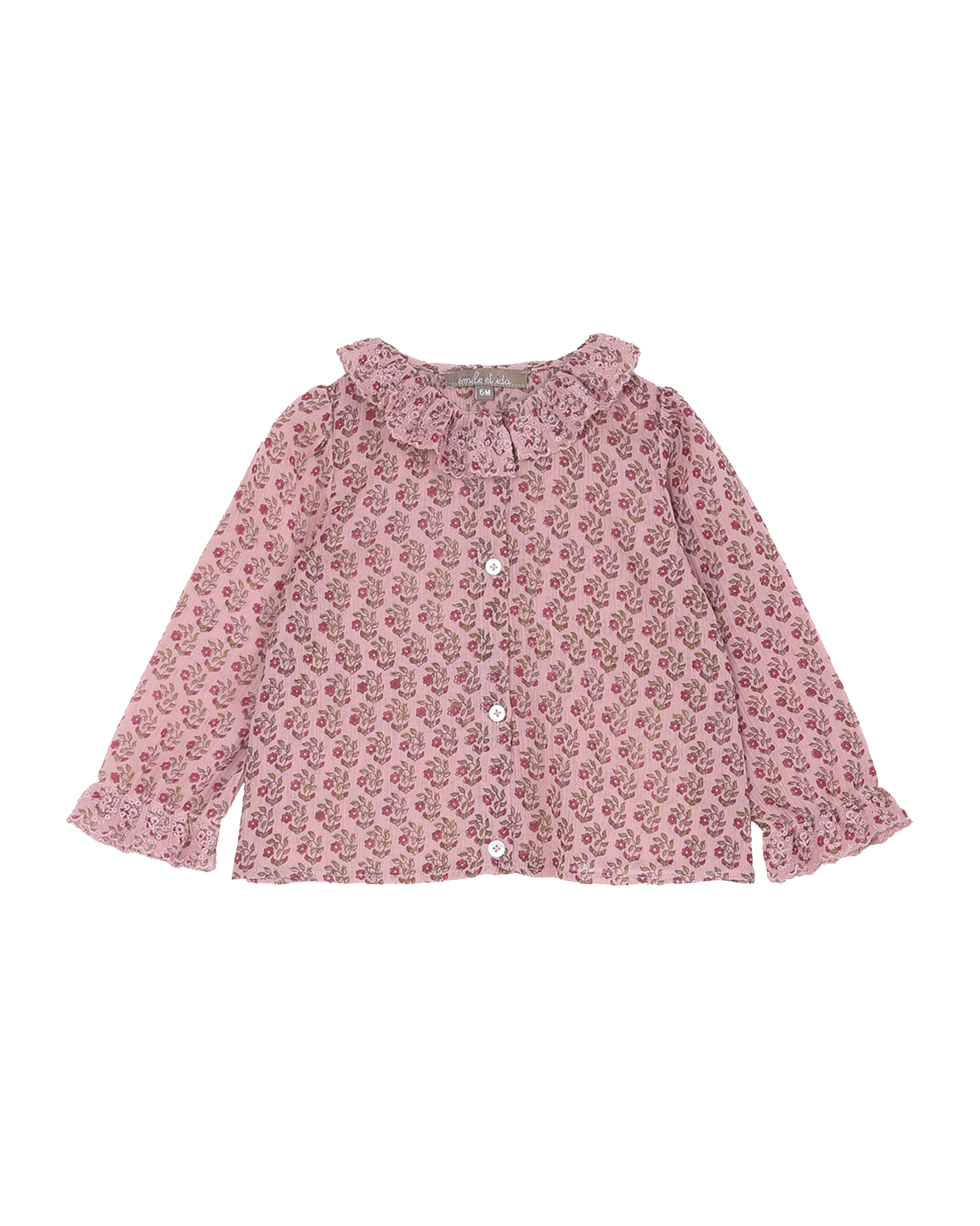 Blouse en voile de coton créponné rose. On aime l'imprimé "pâquerette" sur fond rose, exclusivité Emile et ida, dessiné par notre styliste Mélanie. Un motif inspiré par ses voyages en Inde où elle a rencontré les artisans qui impriment les tissus manuellement avec des blocks print. On craque pour les festons ourlés au point de bourdon de la collerette et des bas de manches. La blouse se ferme sur le devant avec des boutons en nacre naturelle, les manches sont resserrées aux poignets par un élastique.