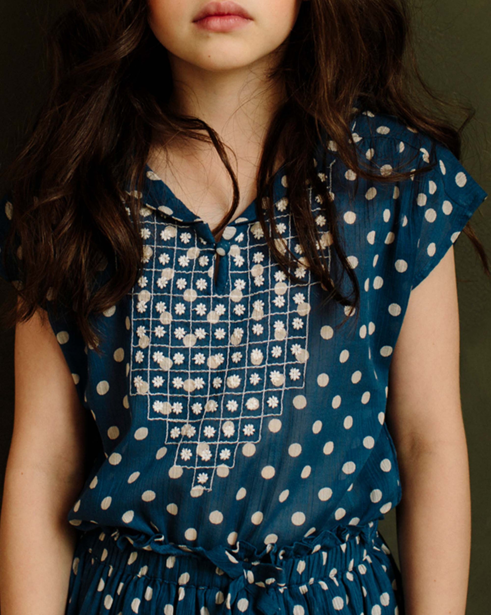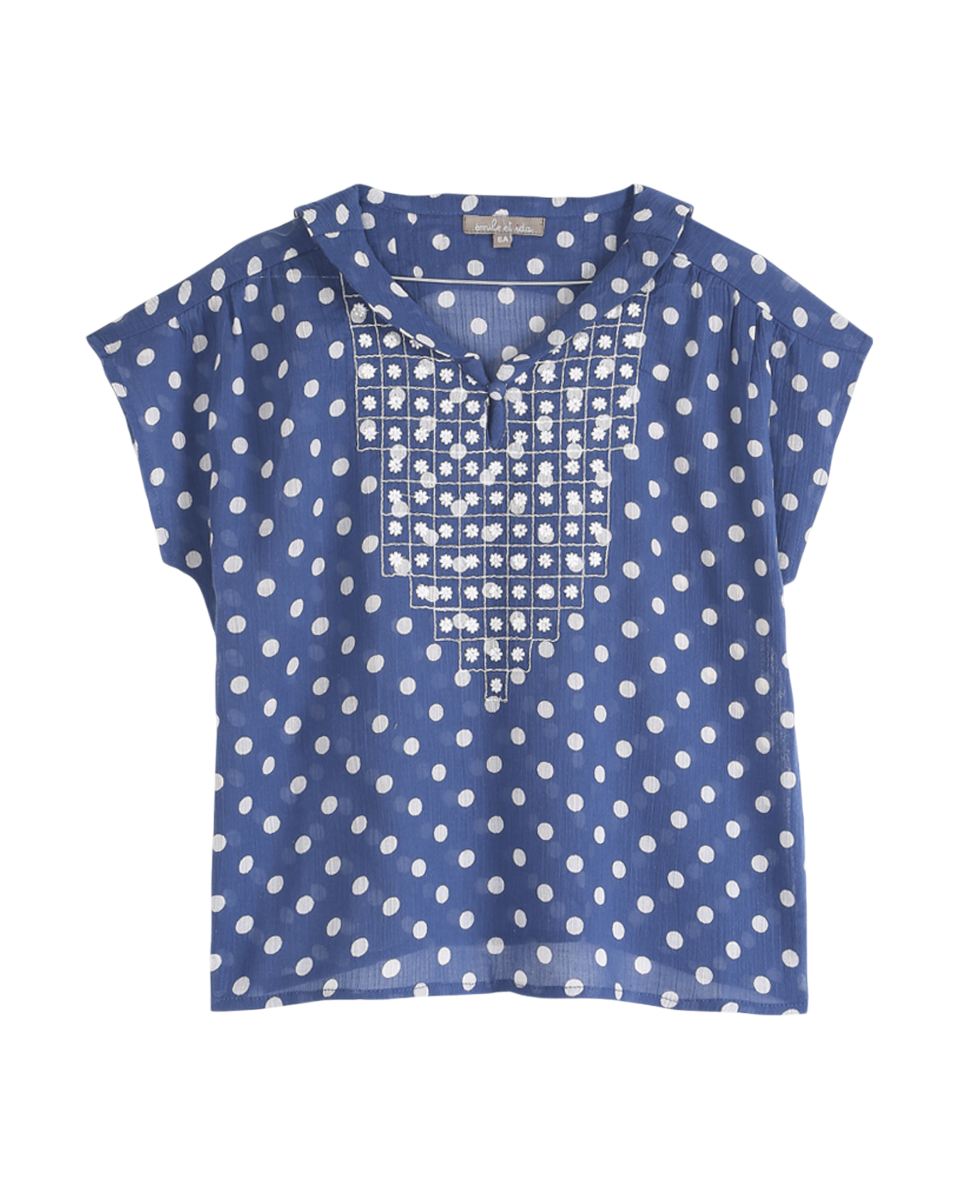Blouse brodée sans manches en crépon de coton bleu à pois blancs. On aime le col châle devant et marin dans le dos, la symétrie des fleurs brodées sur le plastron, les plis nervure derrière, le bouton de nacre naturelle et la bride qui ferment l'encolure. C'est sûr, il trouve sa place dans le vestiaire de toutes les filles.