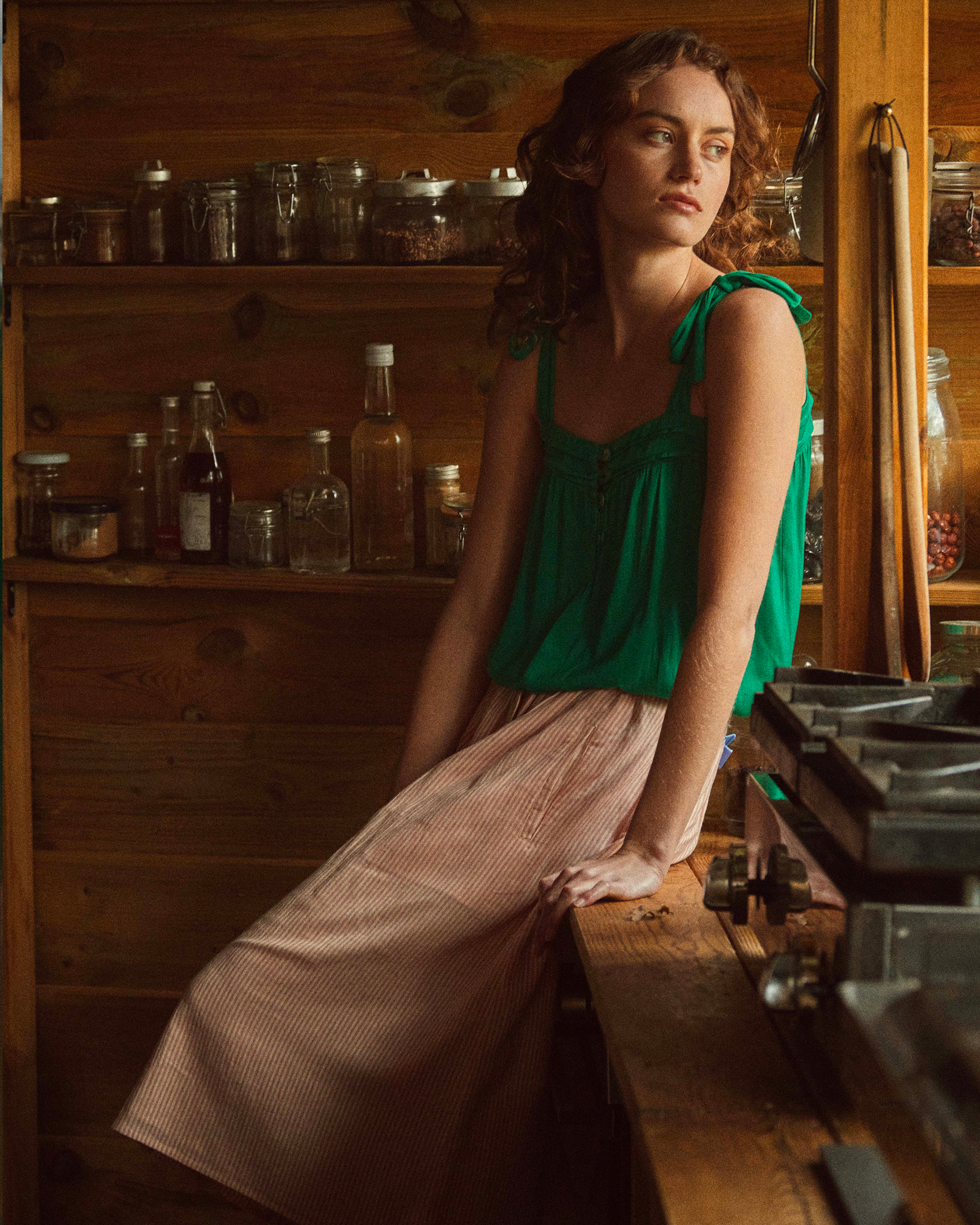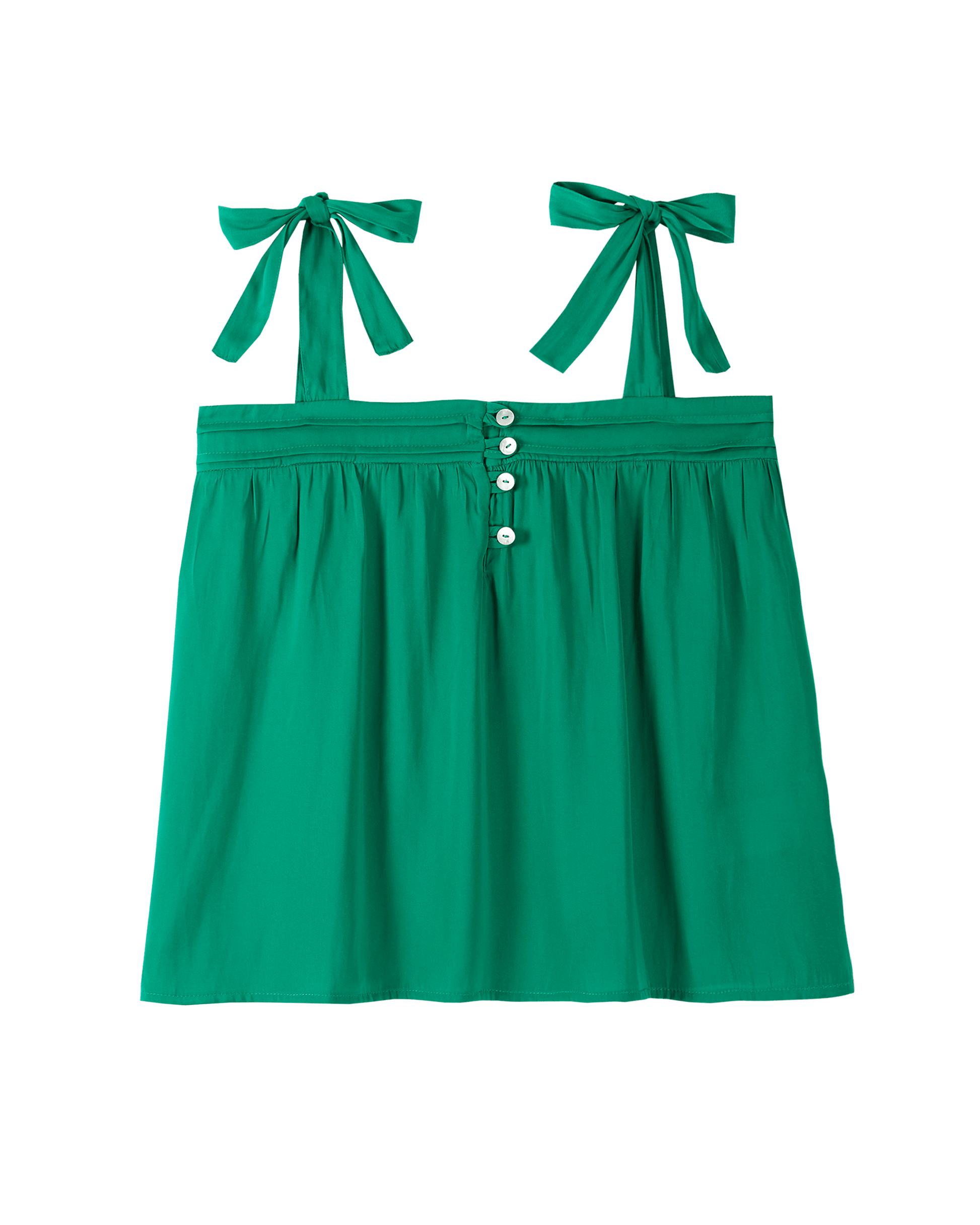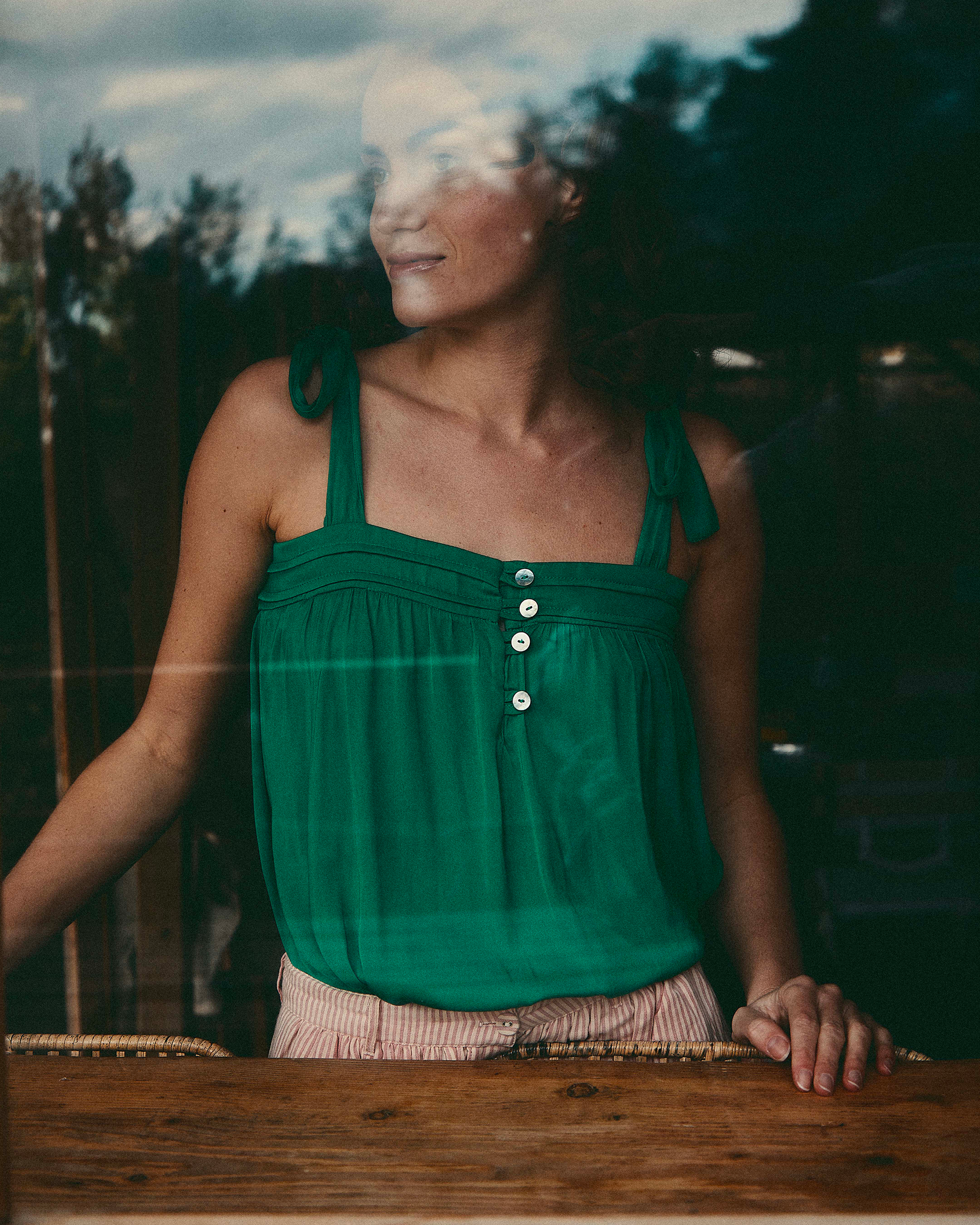 Prendre un tissu doux et léger comme il convient pour l'été. Ajouter une patte de boutonnage ornée de boutons en nacre naturelle qui se glissent dans des brides. Boutons attachés pour un look sage, boutons débridés pour un look plus sexy. Embellir avec des bretelles à nouer sur les épaules pour ajuster la hauteur du caraco et avec deux plis religieuses sur la bande de finition autour du buste. Tous les ingrédients sont réunis pour vous proposer un top parfait envers et contre tout qui vous donnera de l'énergie, verte bien sûr.