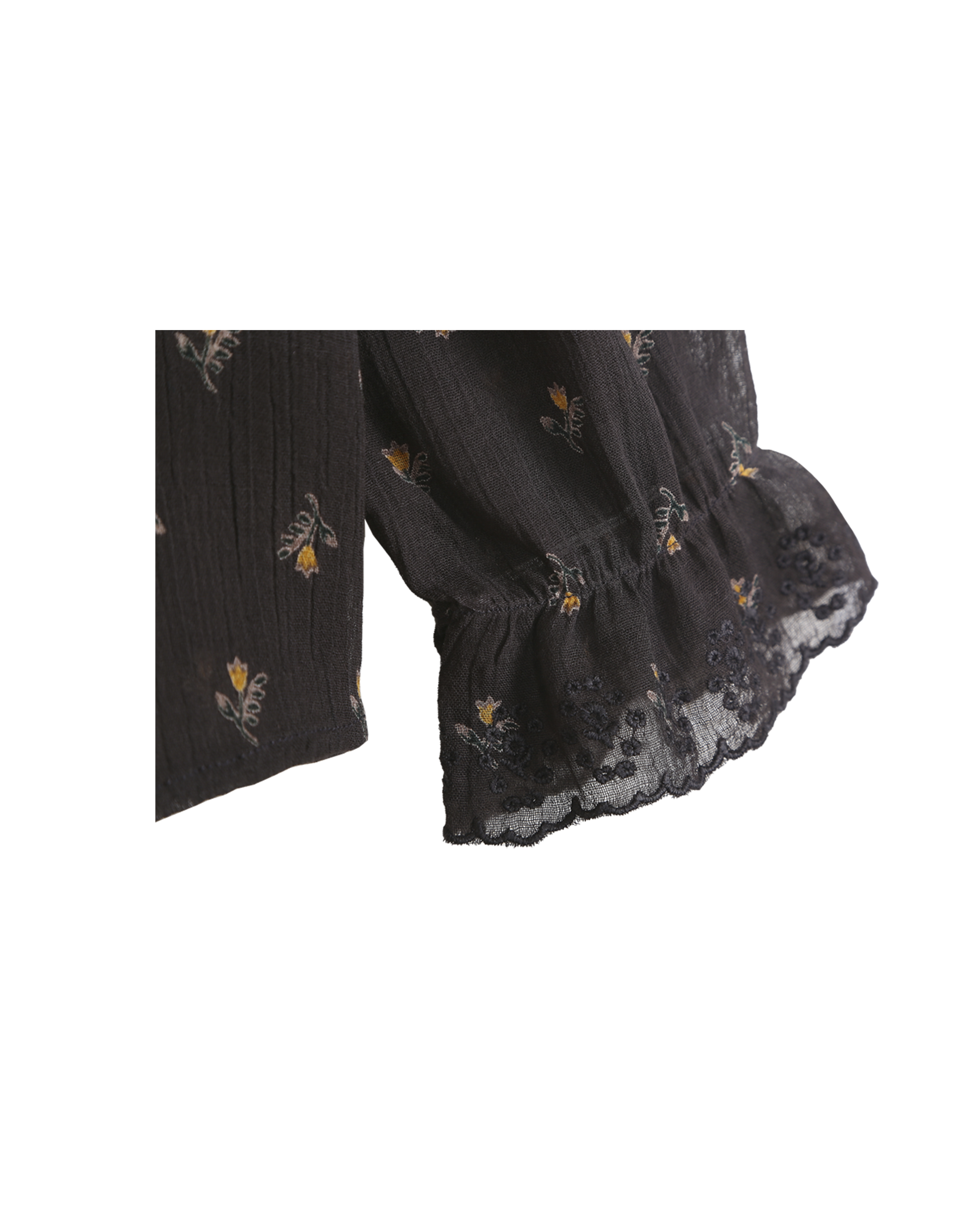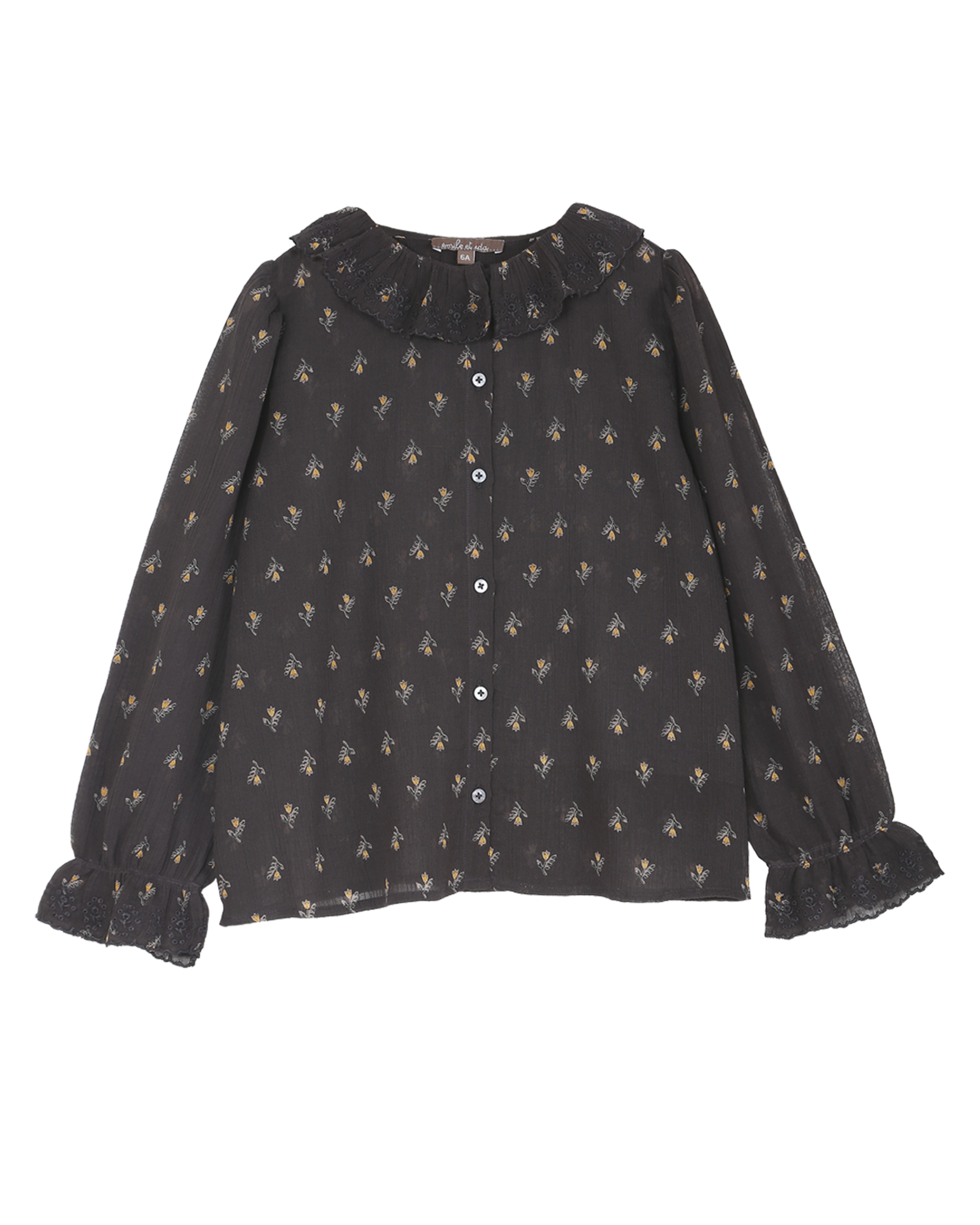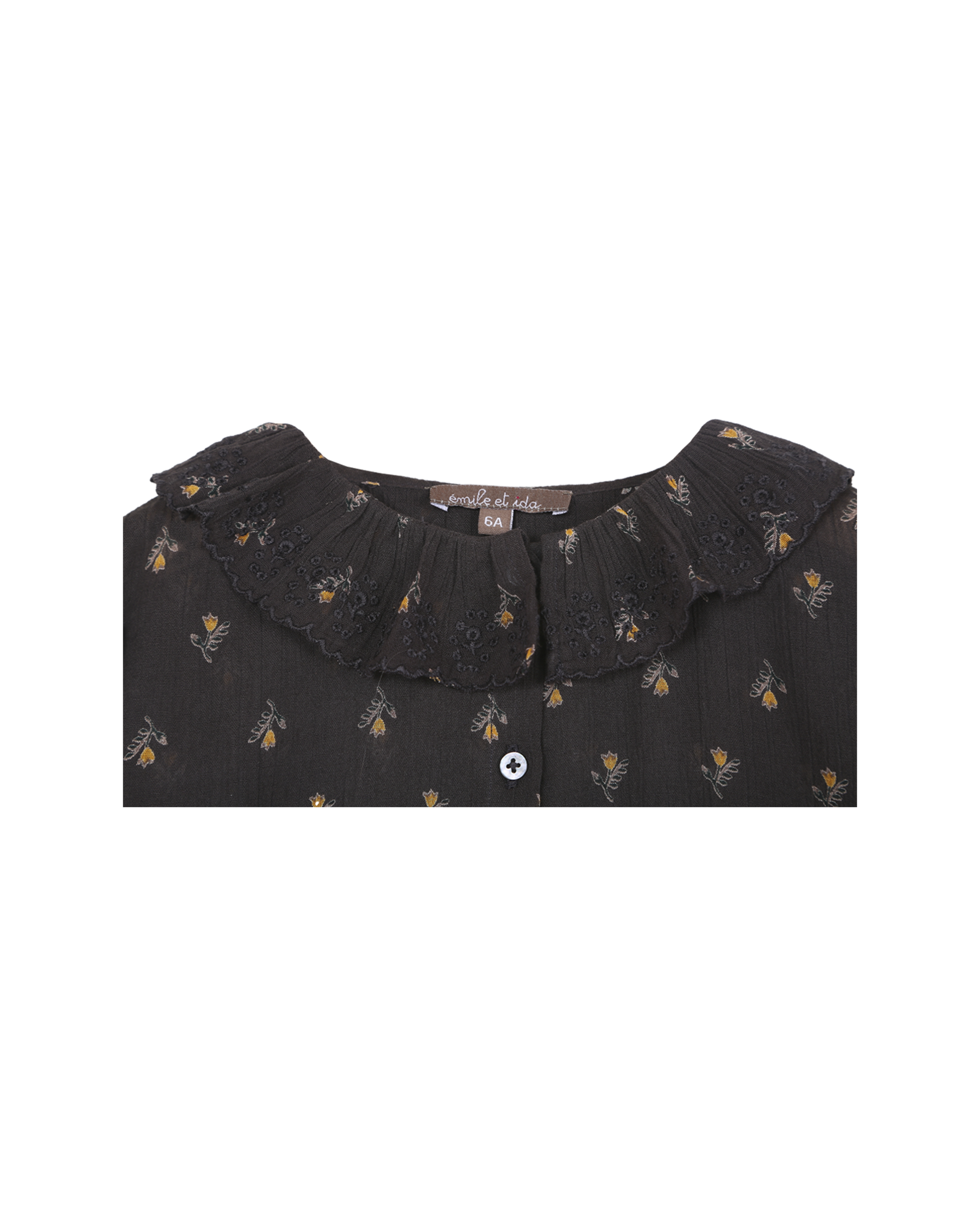 Blouse bitume sur lequel s'épanouissent des fleurettes ocre jaune en alla-over.