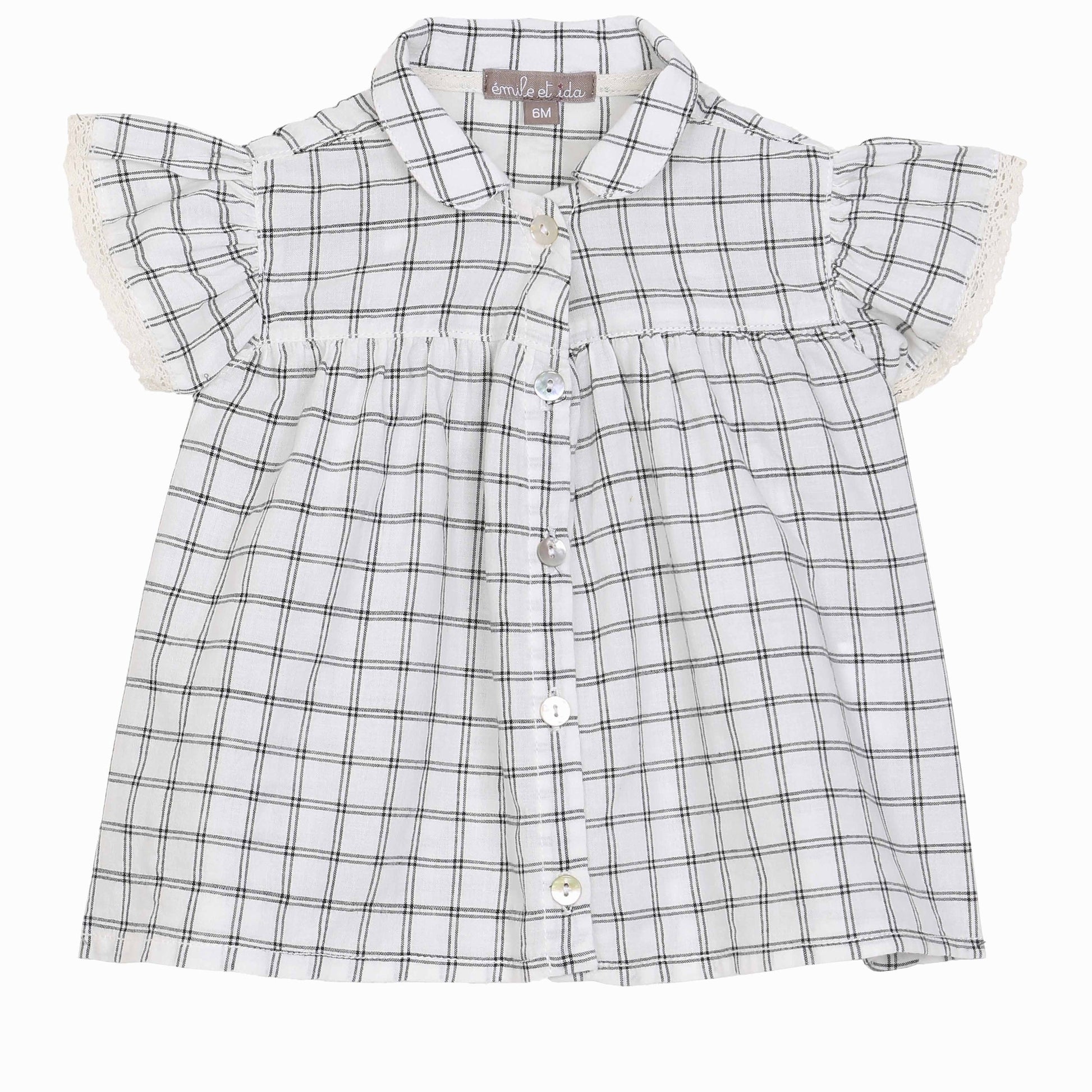 Blouse à carreaux en coton écru. Le col claudine, les manches courtes comme un volant terminées par une dentelle, l'empiècement devant et dos, les 5 boutons en nacre naturelles rendent cette chemise indispensable dans le vestiaire de vos filles. Fabriquée au Portugal. Modèle déposé