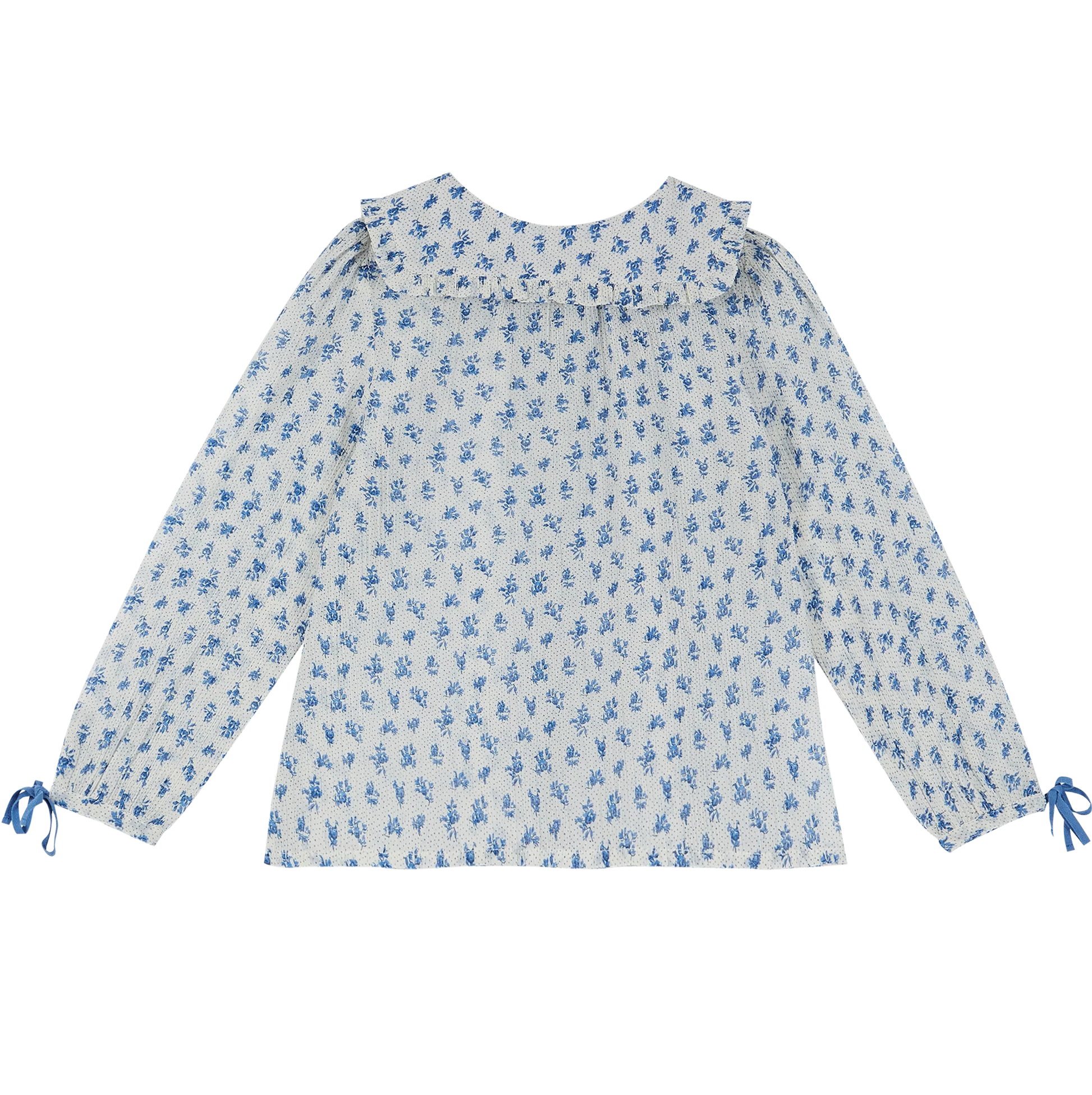 Blouse bébé en voile de coton créponné blanc imprimé de fleurettes. Confectionnée dans un tissu léger et extensible parsemé de minuscules grains de pollen au milieu desquels s'épanouissent des fleurs bleues en all-over. L'imprimé de cette blouse rappelle l'été à nos souvenirs et nous réchauffe au cœur de l'hiver.