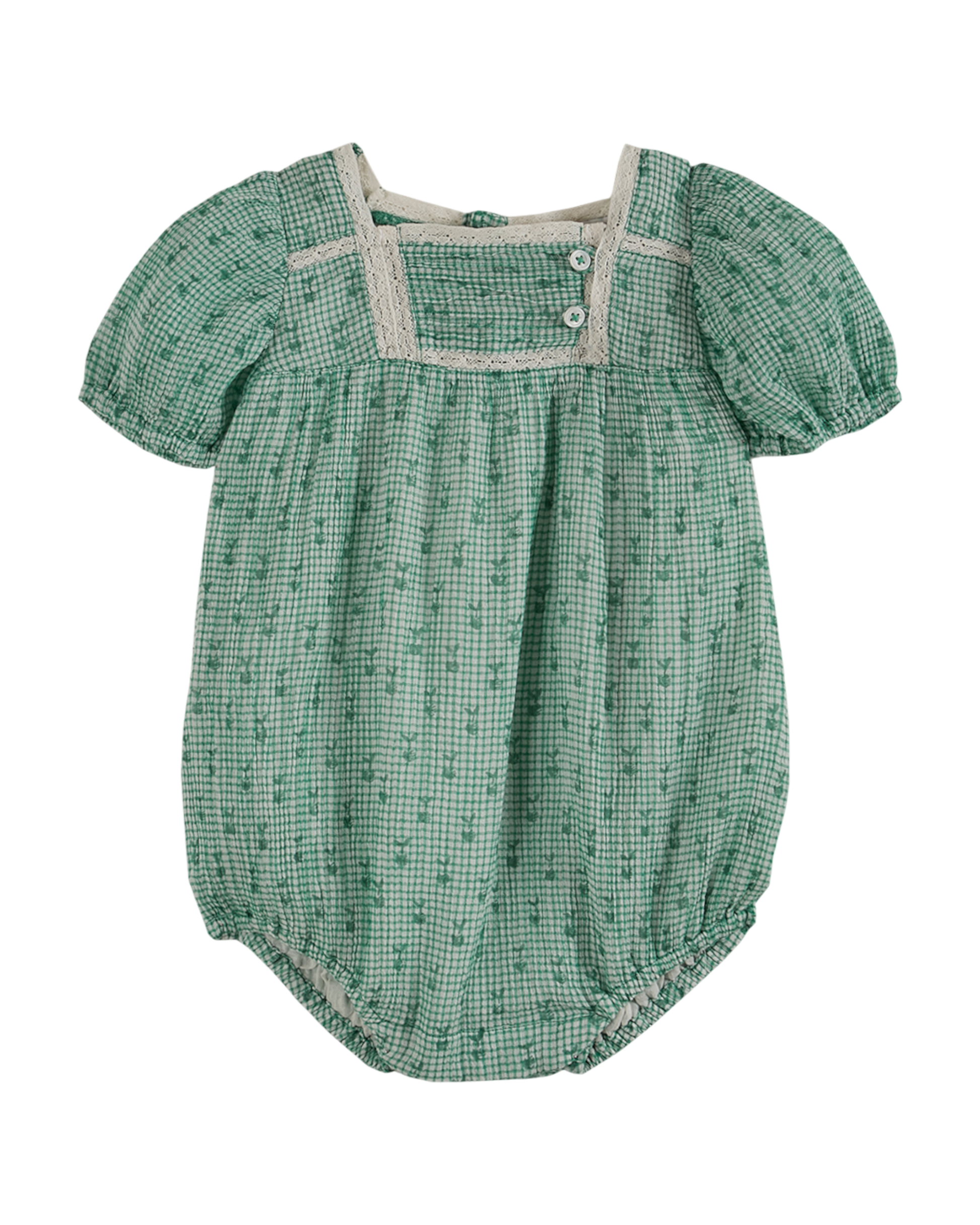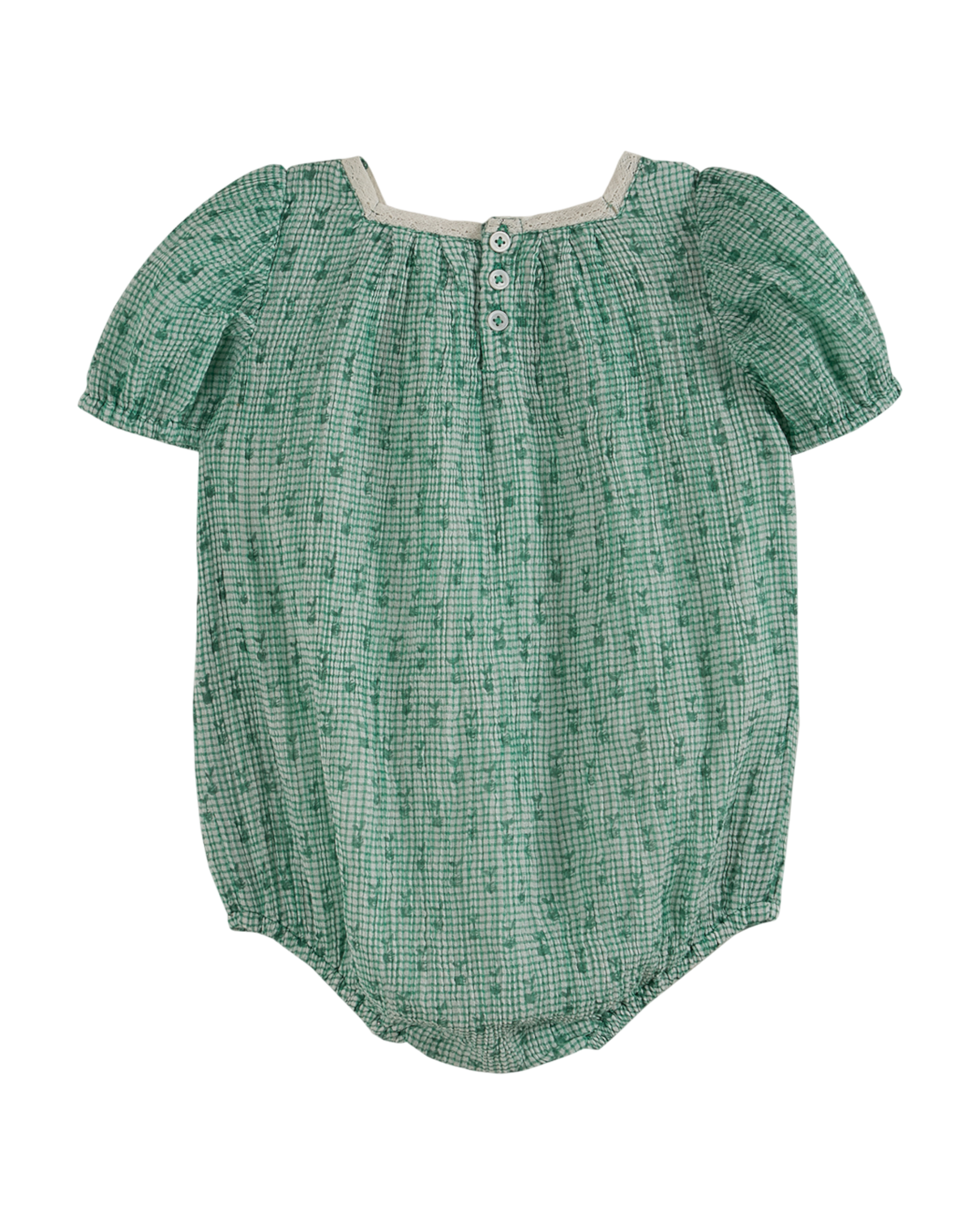 Barboteuse en voile de coton créponné vichy vert et blanc. On aime l'imprimé "reinette" vert inspiré d'un tissu chiné dans le grenier familial, une exclusivité Emile et ida.