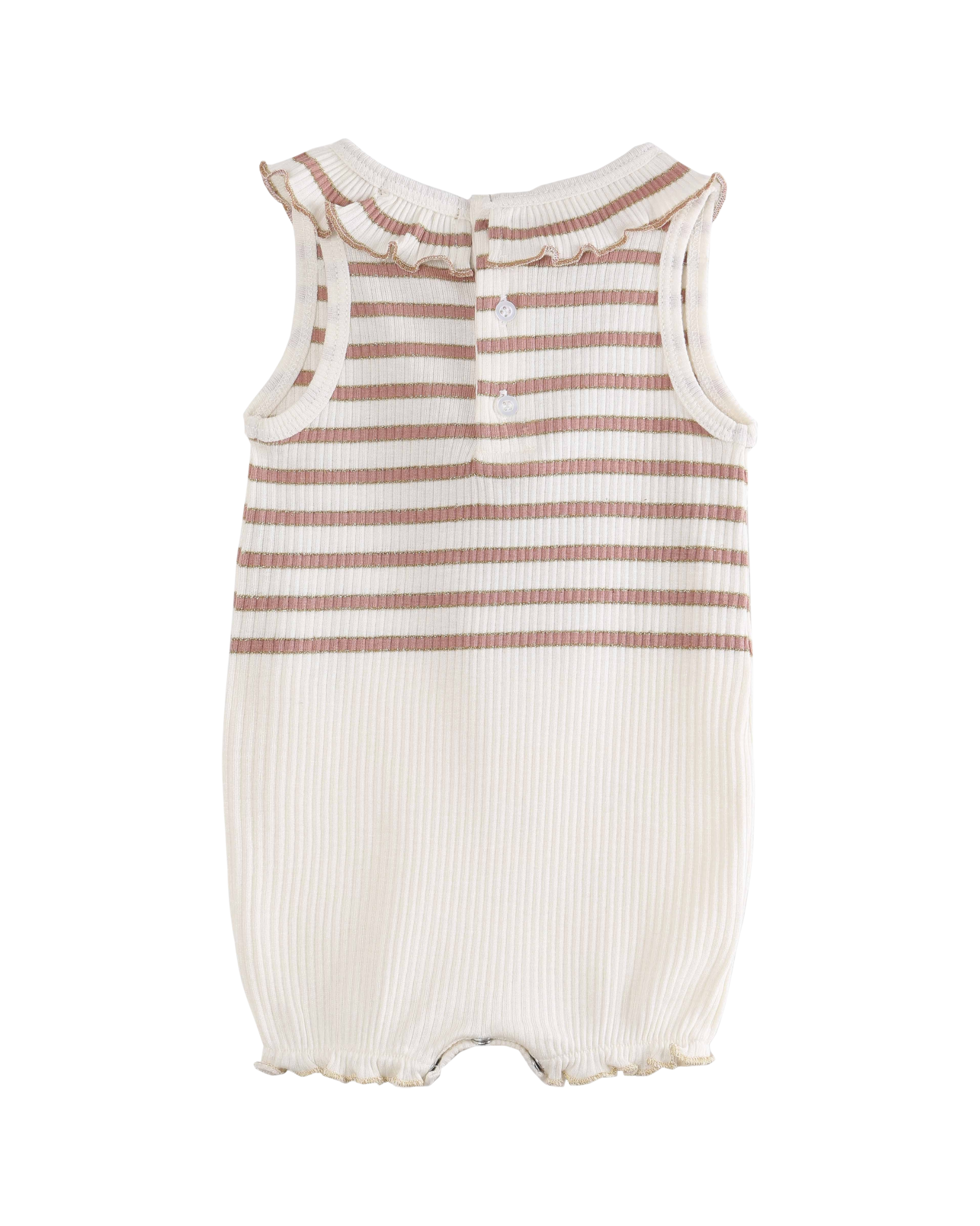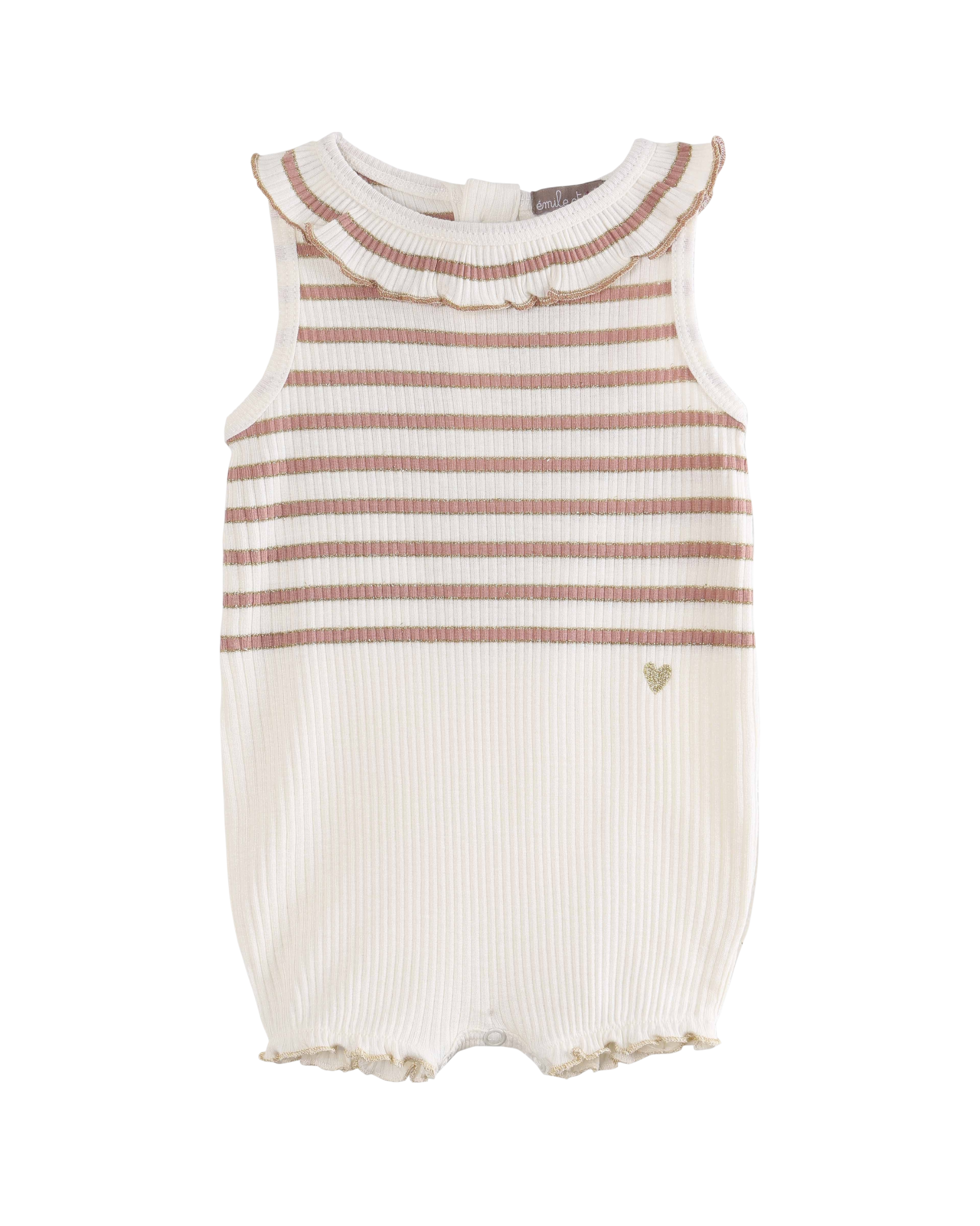 Combicourt en fines côtes de coton rose et écru. Barboteuse sans manches, rayée jusqu'à la taille et culotte unie écrue. De jolis détails comme la colerette de l'encolure, les finitions et le cœur brodé en fil lurex doré donnent des airs d'élégance à cette barboteuse. Ouvertures par des boutons en nacre naurelle dans le dos et pressions à l'entre-jambe. Fabriqué au Portugal. Modèle déposé