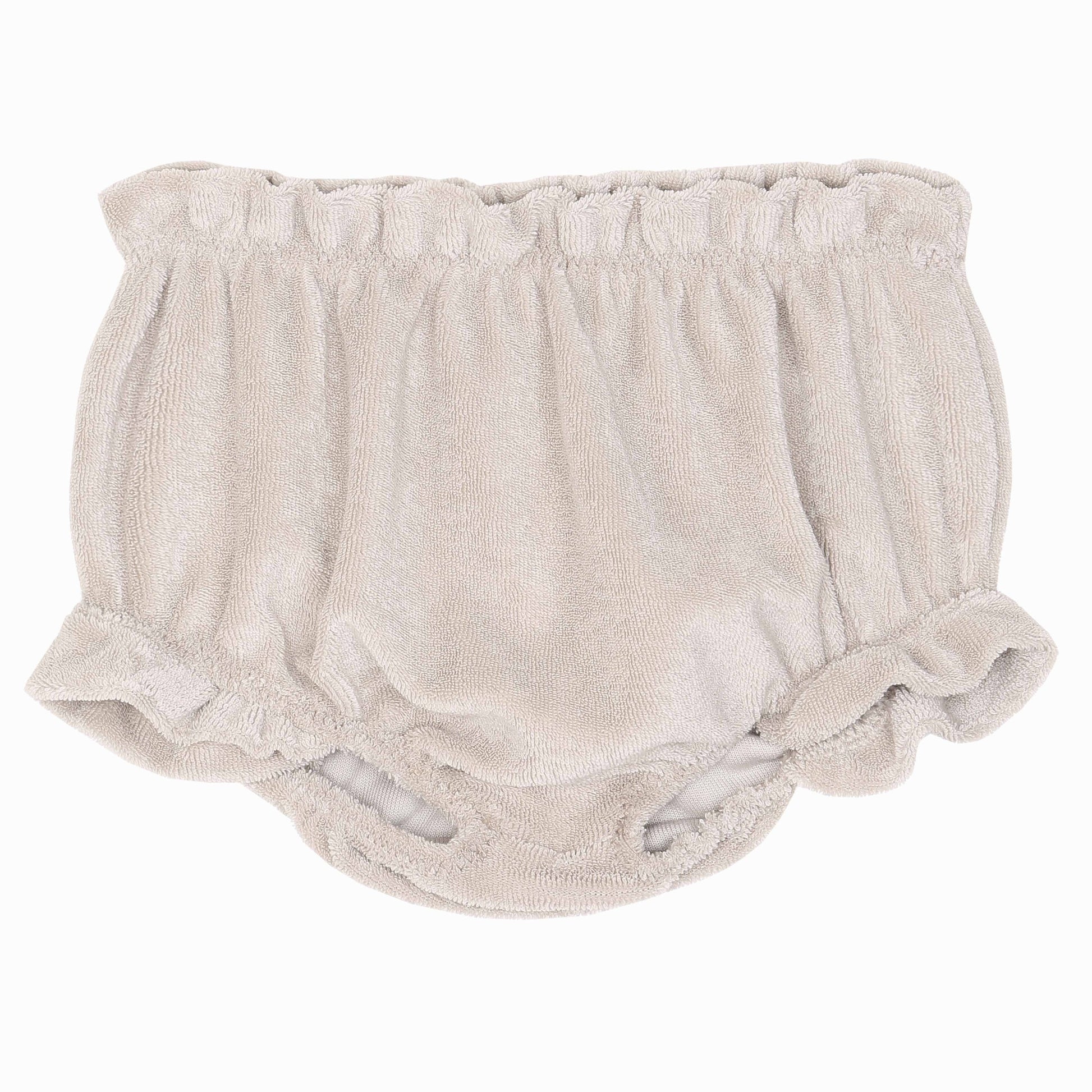 Bloomer en tissu éponge mastic. La matière douce et moelleuse, la ceinture et les cuisses élastiquées font de ce bloomer un classique basique. On aime particulièrement le petit volant sur le haut des cuisses. Un bloomer confortable pour des bébés bien culottés. Fabriqué au Portugal. Modèle déposé