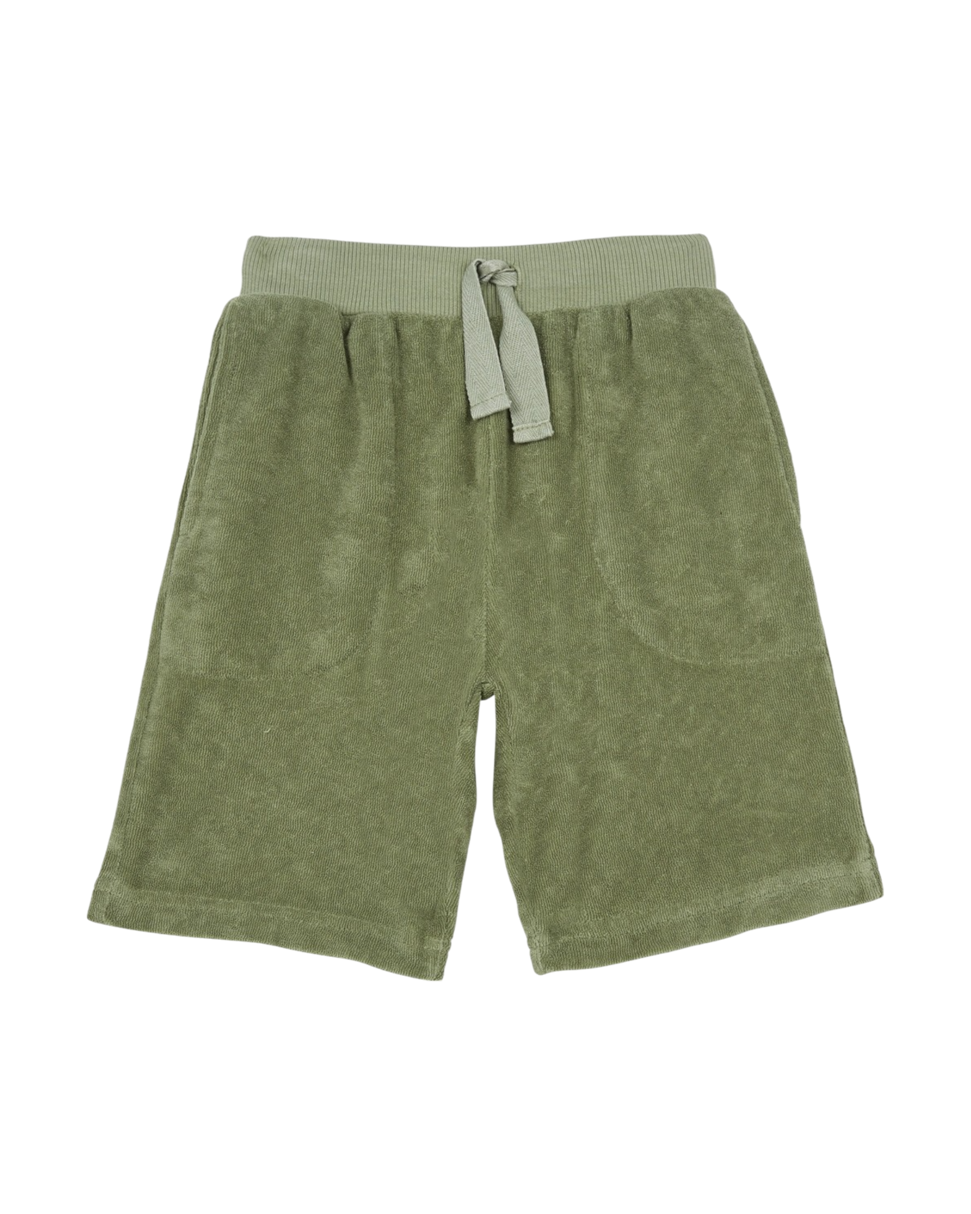 Bermuda en tissu éponge kaki. On aime le mélange de coton et de polyester tout doux, fluide et extensible, la ceinture élastiquée ajustable avec un lien en coton sergé ton sur ton et les 2 grandes poches plaquées. Le polyester, ajouté au coton, confère au tissu une élasticité exceptionnelle qui lui permet de ne pas se froisser.
