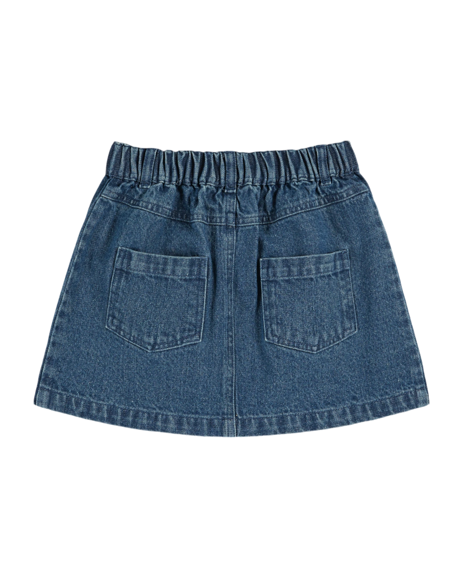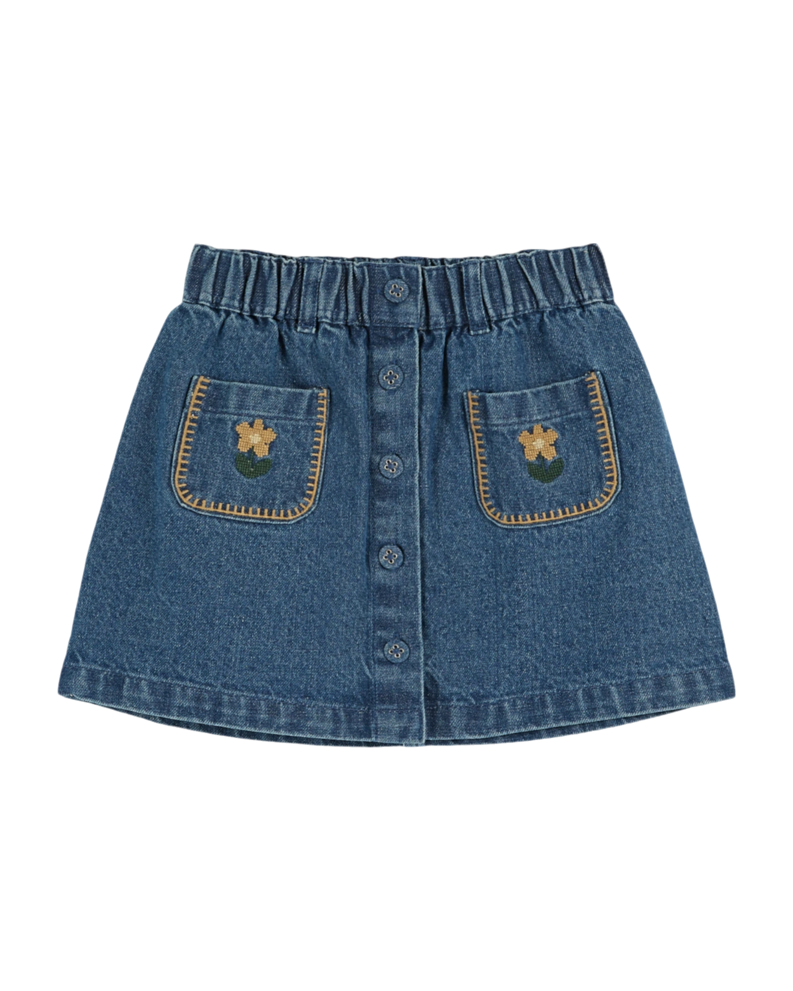 Une jolie mini jupe qui est composée d'un empiècement dans le dos et de quatre panneaux montés sur une ceinture élastiquée pour épouser toutes les tailles. Les deux panneaux de devant se ferment avec des boutons recouverts de tissu et accueillent chacun une ravissante poche plaquée rehaussée sur le pourtour par une broderie. Au centre, trône une fleur-cœur ocre jaune brodée au point de croix. Les panneaux du dos sont agrémentés chacun d'une poche plaquée et surpiquée.