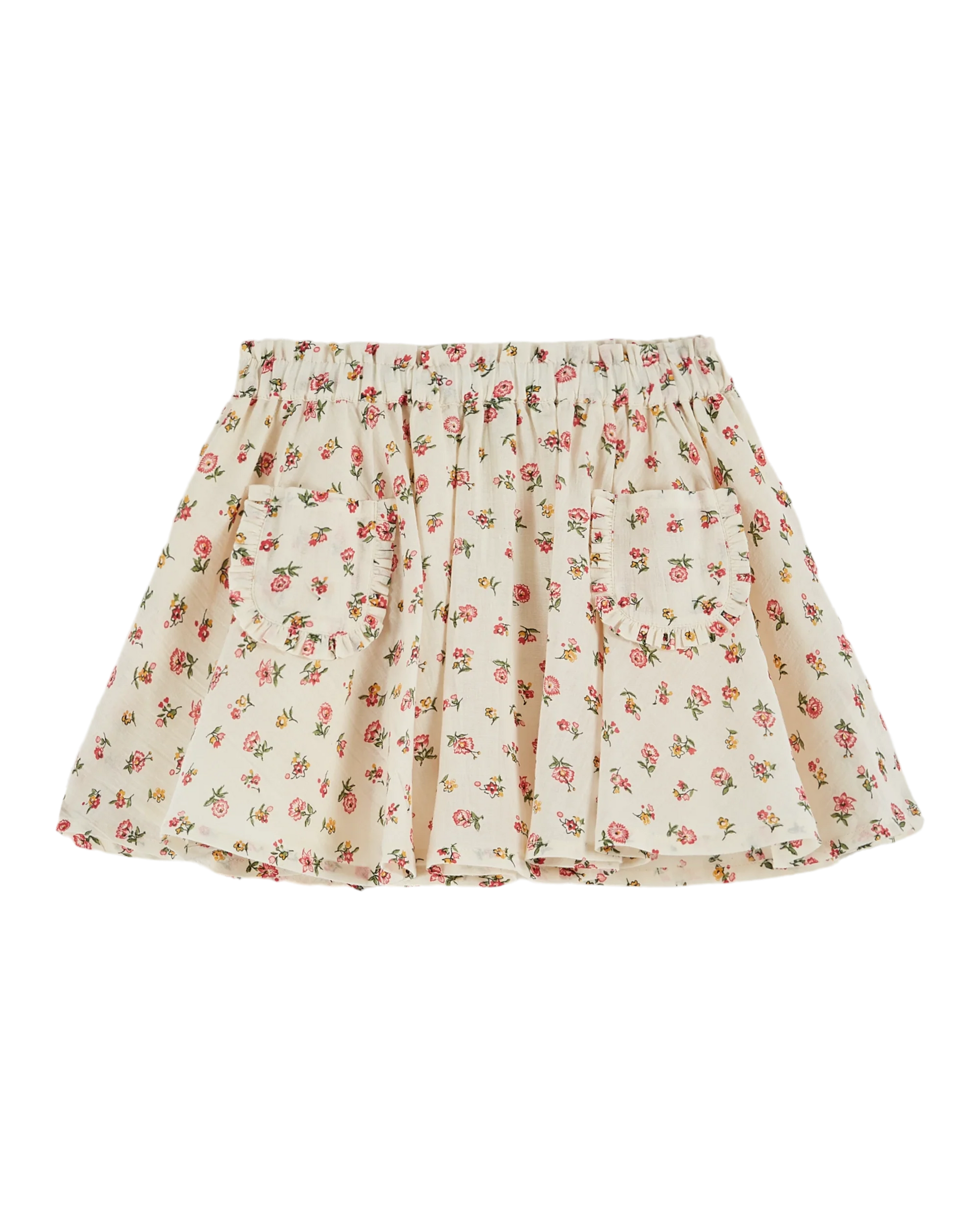 Jupe courte en coton écru imprimée de fleurs rose. Vous apprécierez la qualité et la finesse de la matière toute douce et la forme ample que procurent les fronces soutenues par une ceinture élastiquée avec un effet volanté et les poches plaquées entourées d'un froufrou qui dissimuleront le moindre trésor.